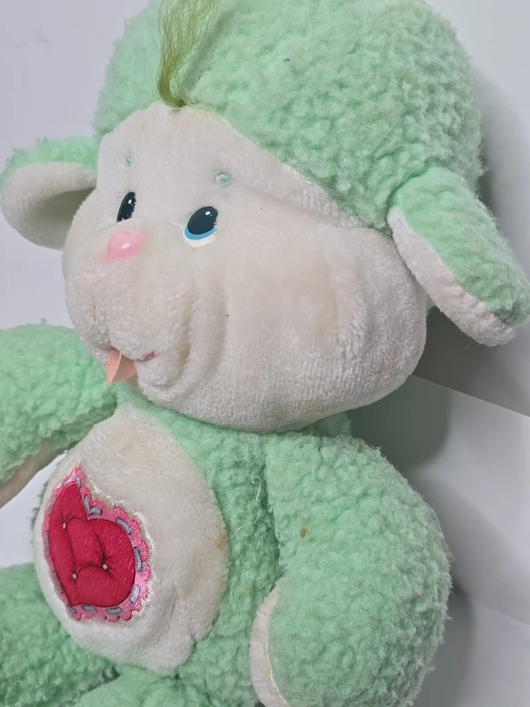 This vintage 1984 Care Bear Cousins Gentle Heart Lamb plush toy is a 13-inch green stuffed animal from the Care Bears franchise. Made of plush material, this gentle lamb with blue eyes is a nostalgic collectible from the 1980s. Manufactured by Kenner in Taiwan, this Care Bear Cousins toy is a beloved piece for fans of vintage Care Bears merchandise. Perfect for collectors or nostalgic individuals, this adorable Gentle Heart Lamb is a charming addition to any Care Bears collection. DOES HAVE STAINS , SHOWN IN PICTURES. SOLD AS IS.