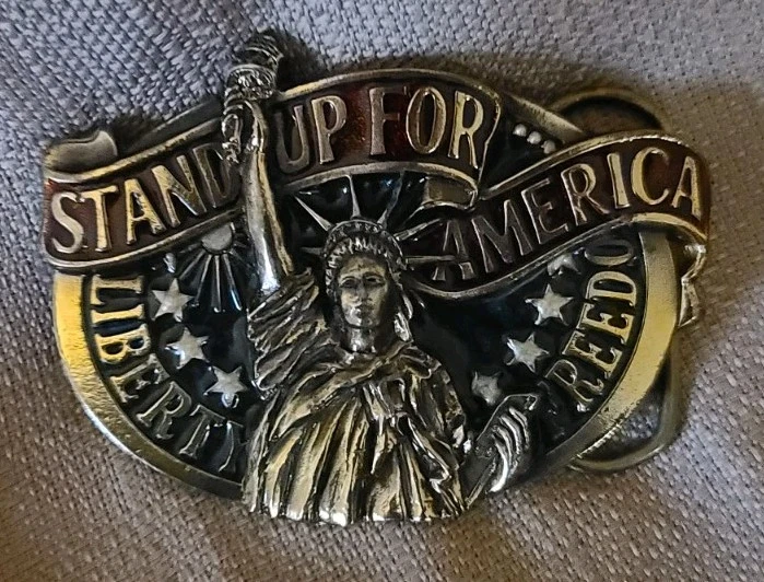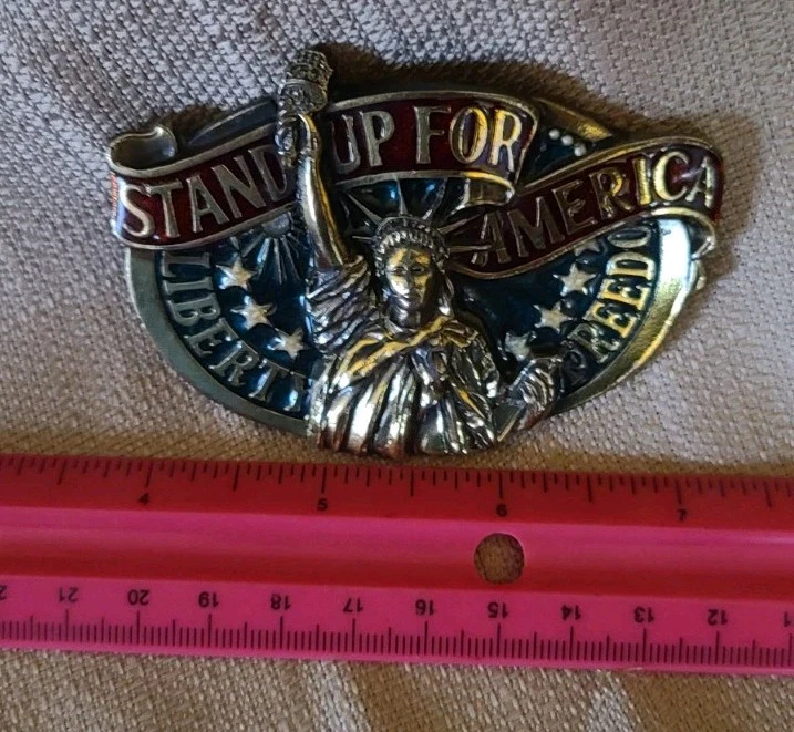 This vintage belt buckle from 1984 by The Great American Buckle Company features a patriotic "Stand Up For America" design in red, white, and blue colors. The buckle is made of metal and showcases a Flags & Political theme, specifically highlighting liberty and freedom. It has a military/Landgirl look and is suitable for adult unisex wear. Made in the United States, this original piece exudes a sense of American pride and heritage.