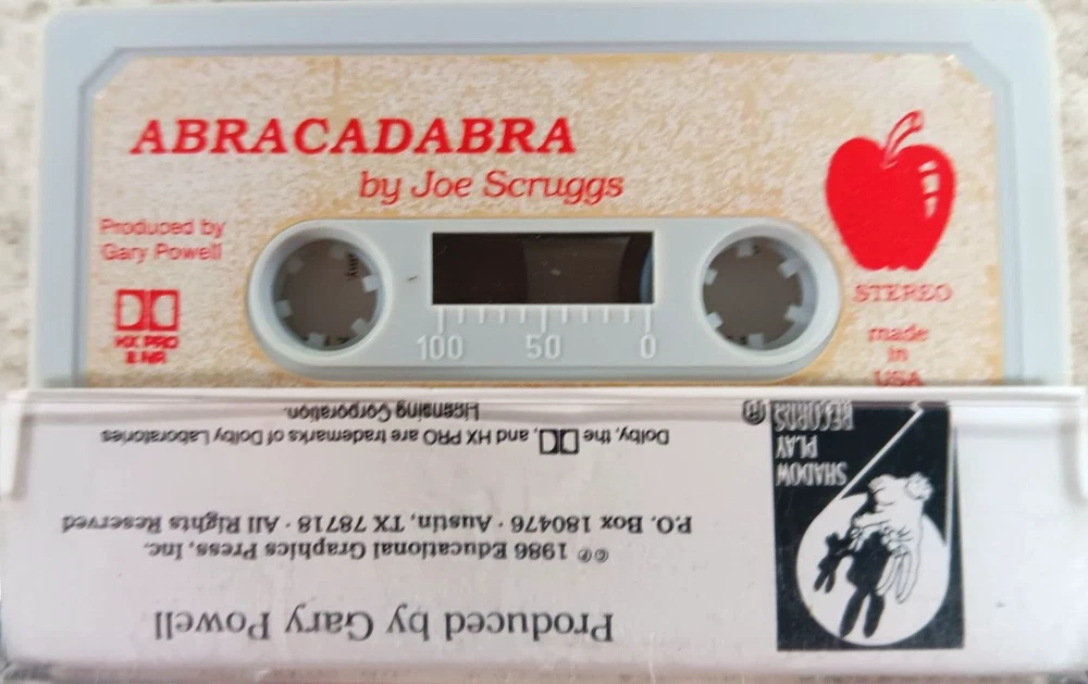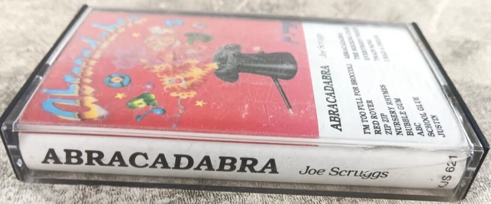 This is a vintage 1986 cassette tape of Joe Scruggs' album "Abracadabra" released by Geffen. The cassette comes in a standard multicolor jewel case. It is an educational album from the 1980s featuring English language songs. Made in the United States, this cassette is in excellent condition and is a single unit.