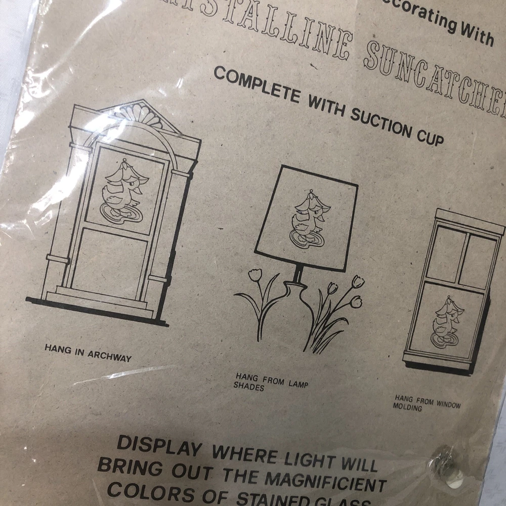 Add a touch of vintage charm to your home decor with this Tiffany-Like Duck Sun Catcher from 1986. This decorative suncatcher features a beautiful design that is sure to catch the eye of anyone who sees it. It is perfect for adding a cozy and welcoming atmosphere to any room in your home. Crafted with care, this suncatcher is a great addition to your collection of decorative accessories. It is a perfect gift for your loved ones or a nice treat for yourself. The duck design is whimsical and playful, making it a great addition to any space. This suncatcher is a great way to bring a touch of nature into your home. ** as seen in photos ,, yellow is faded in the duck design.