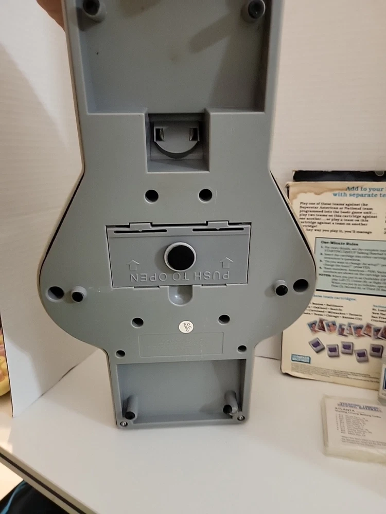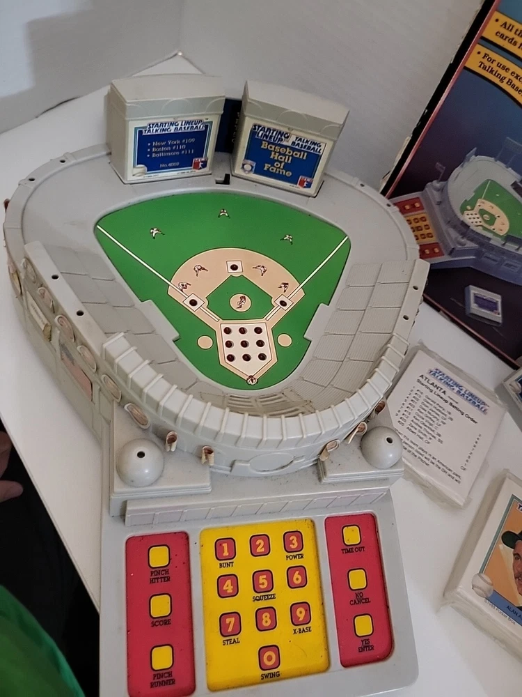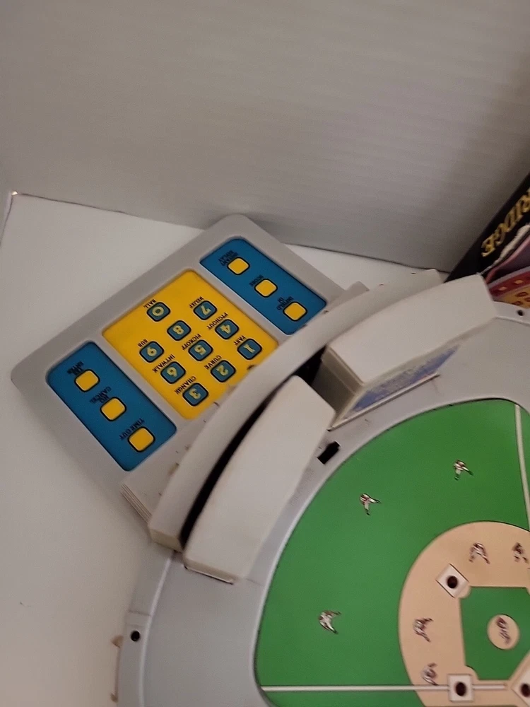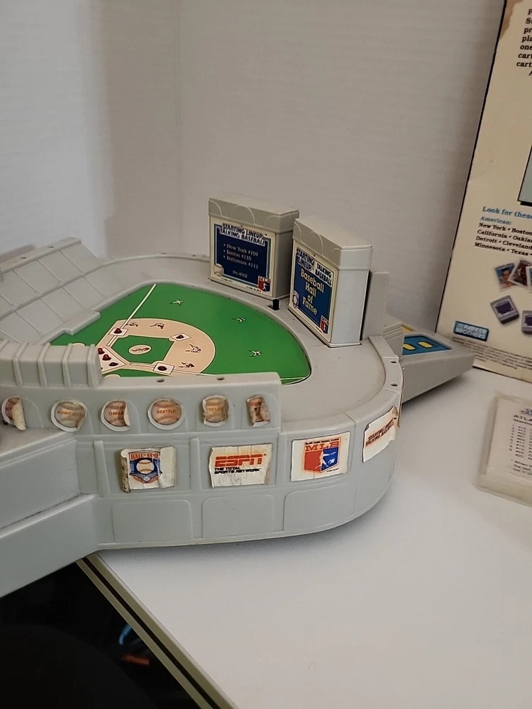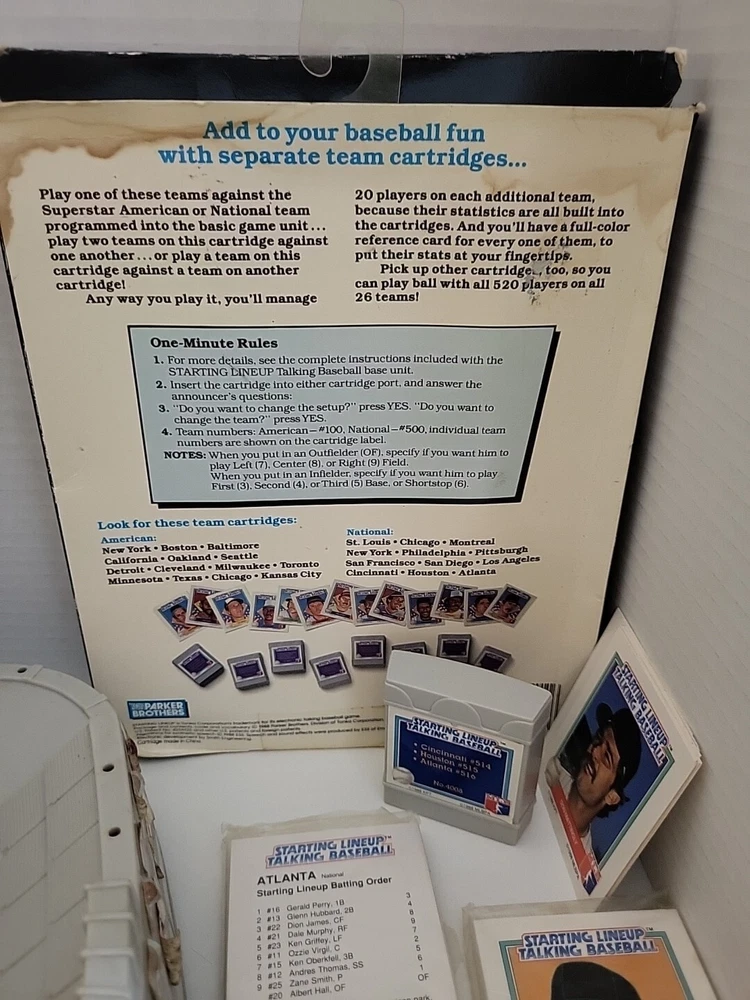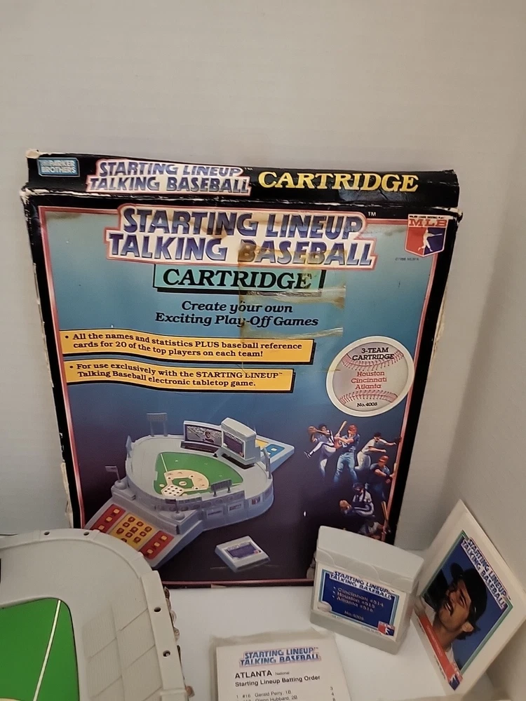 This vintage 1988 Parker Brothers Starting Lineup Talking Baseball Game is a must-have for any game collector. It comes with cartridges and is perfect for those who love board and traditional games. The game is made by a well-known brand, Parker Brothers, and is sure to provide hours of entertainment. The game is perfect for those who love baseball and want to experience it in a unique way. It is great for family game nights or for groups of friends who want to spend time together. This item falls under the Toys & Hobbies, Games, Board & Traditional Games, and Vintage Manufacture categories. *As is! Some stickers are curled up Battery compartment needs cleaning. New cartridge and 2 unopened packages of cards.