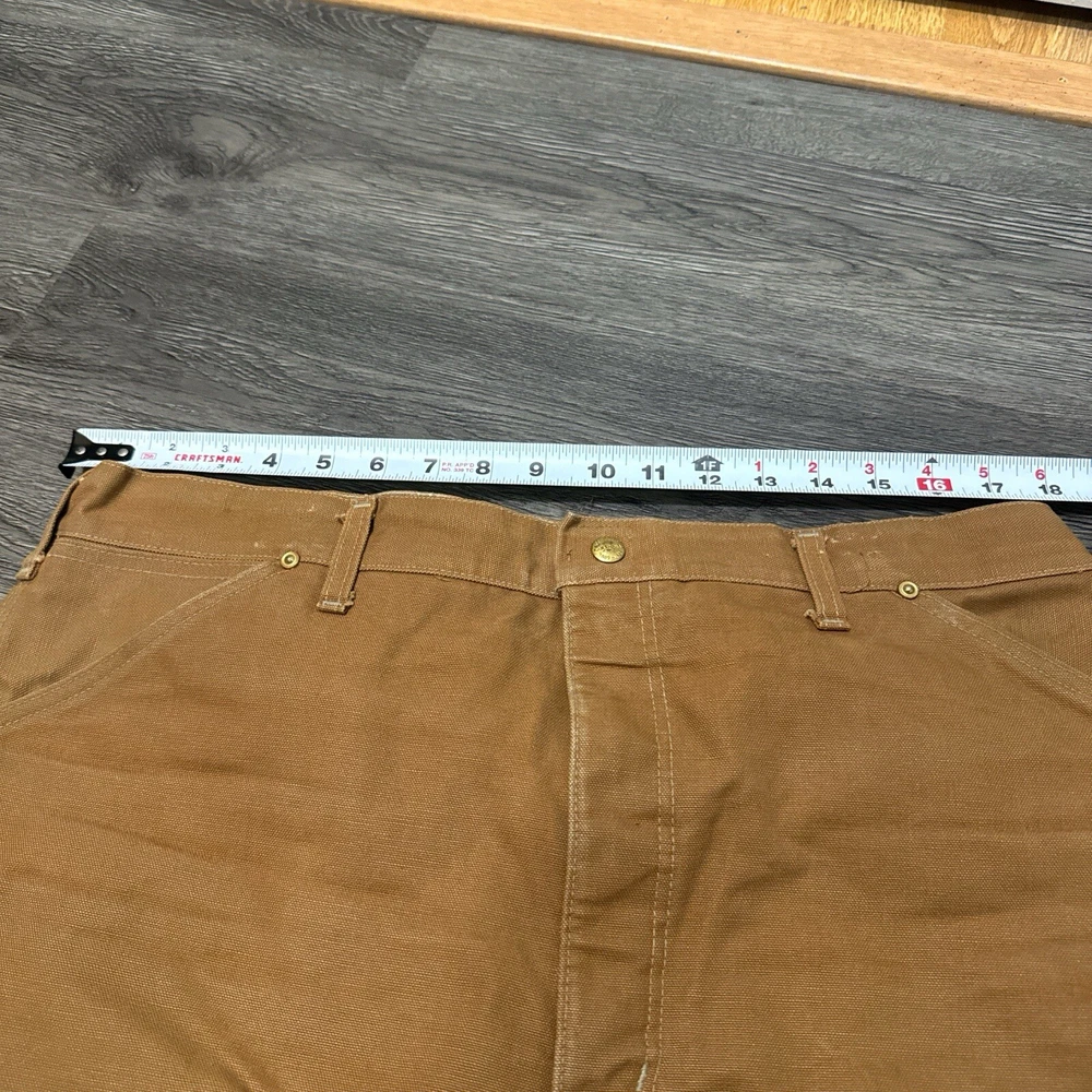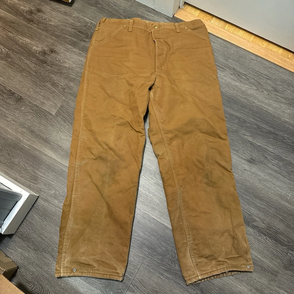 Vintage 1989 CARHARTT Tan Workwear Jeans Pants USAMade Red Quilted Lining Union Vintage 1989 Carhartt Lined Pants 100 Years Tagged Size 38x30 measurements fit 36x30 Great Fade & Wear & Stains Shown #carhartt #lined #vintage