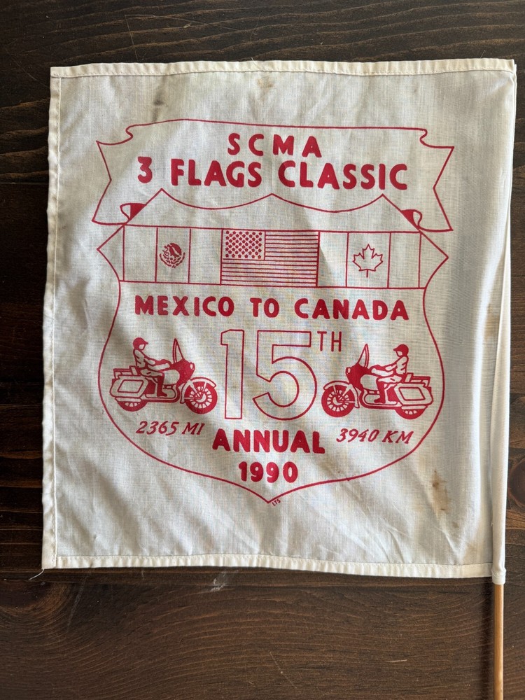 VINTAGE 1990 15TH ANNUAL SCMA 3 FLAGS CLASSIC MEXICO TO CANADA CLOTH FLAG FLAG IS APPROXIMATELY 13" by 12" WOOD POLE IS ABOUT 2 FEET LONG GOOD CONDITION, SOME COLOR FADING, SOME STAINS, GENTLE USAGE PLEASE ZOOM INTO OUR PICTURES SO YOU CAN SEE MORE DETAILS WE COMBINE SHIPPING THANK YOU FOR LOOKING Disclaimers All items are from local estate sales and garage sales around San Diego, Ca. All items sold by us are being described to the best of our ability and with utmost conscientiousness on our part, but please know we are not experts. To avoid any potential oversights, we respectfully request your assistance in thoroughly reviewing the description, photos and asking questions prior to Buying/Bidding. Any damage will be mentioned and included in photographs. Shipping Item(s) will be shipped within 1 business day (Monday-Friday) after payment has cleared. Depending on the fragility of the item, combined shipping may not be available on all items . Please message me to discuss shipping options. Return Policy 100% Satisfaction Guaranteed. We want to ensure that you are completely satisfied with your purchase. If not, then please let us know by messaging us on eBay before leaving any feedback & allow us to work with you to completely resolve any issues that you might be facing with your order. If you feel that you got an item that is different from what you ordered or if it arrived damaged or if you have any problems with the item, please email us & we will be glad to work with you in resolving any issues. All returns must reach us within 30 days after the item was delivered to you. The items must be in their original condition when they were sent to you. We will issue you a refund within 3 business days once the item has been received. Note: Depending on the reason for return, the original cost of shipping may not be included in refund amount.