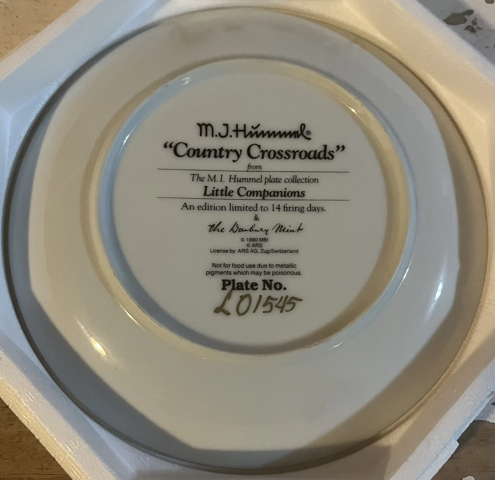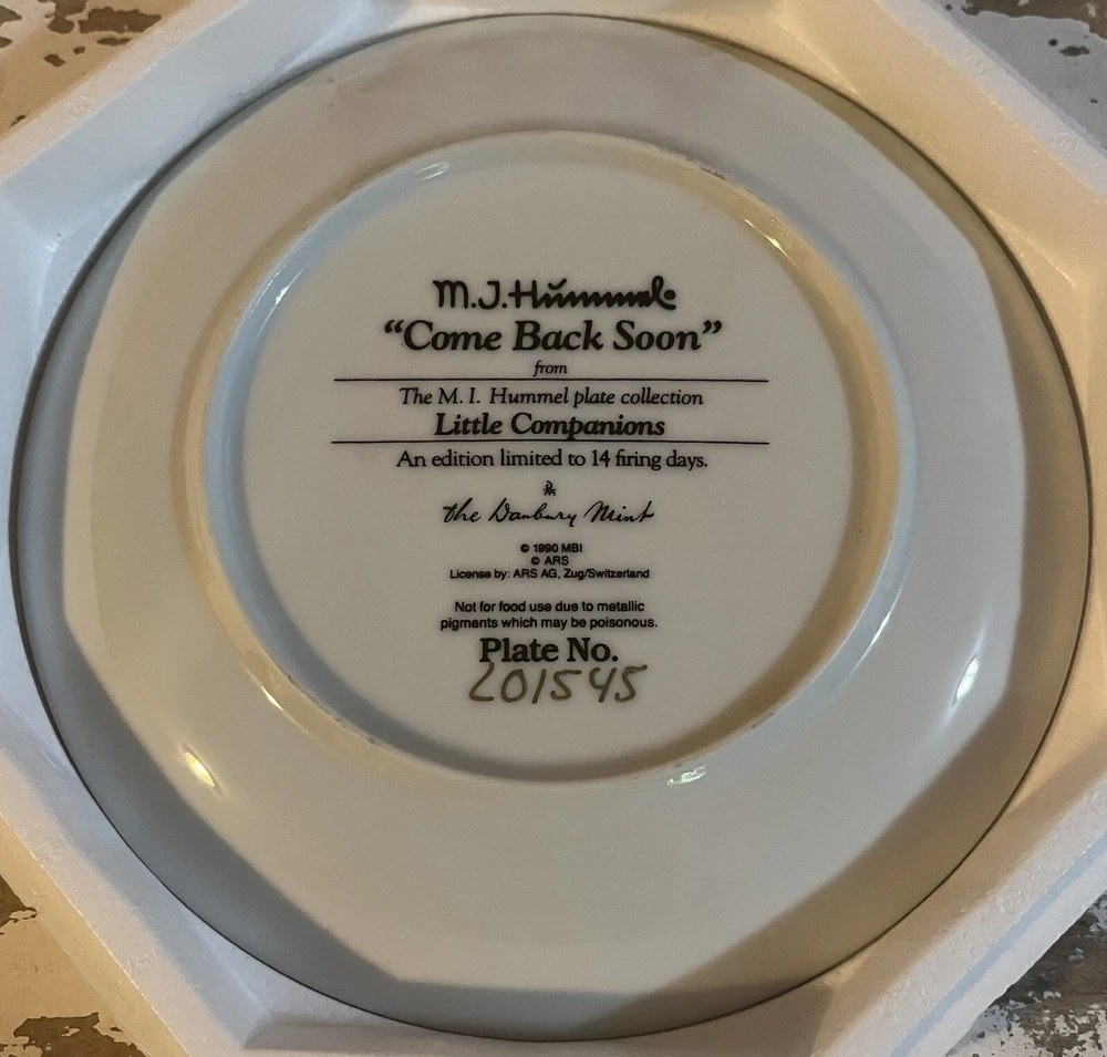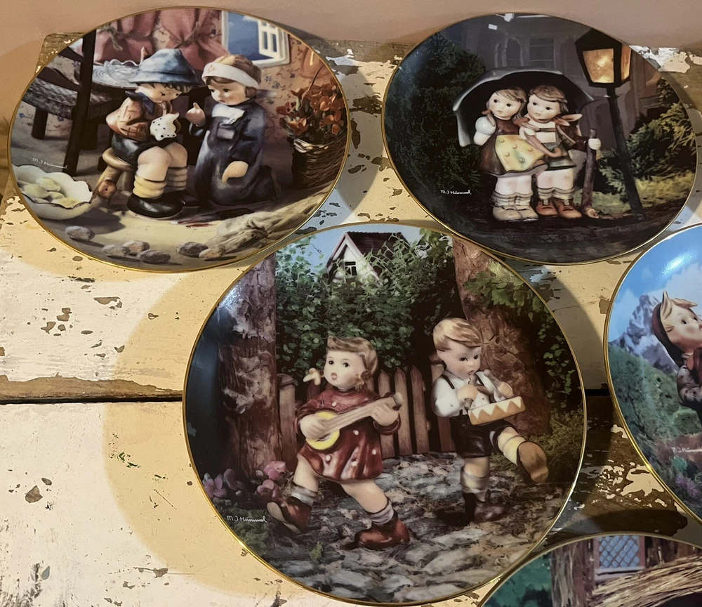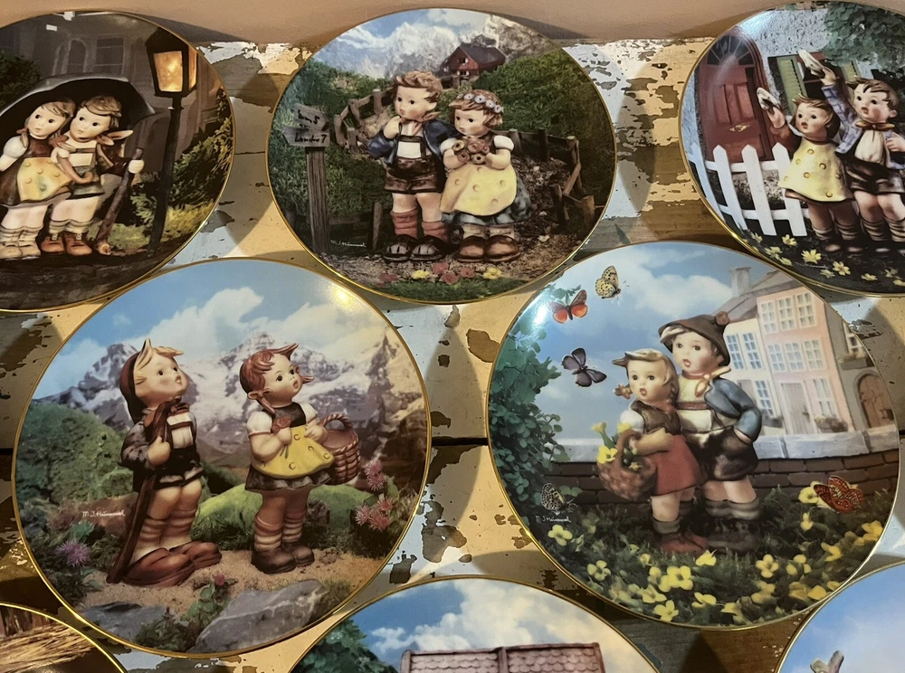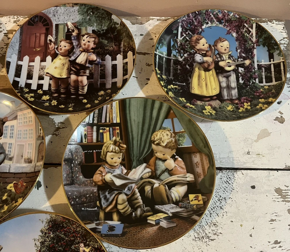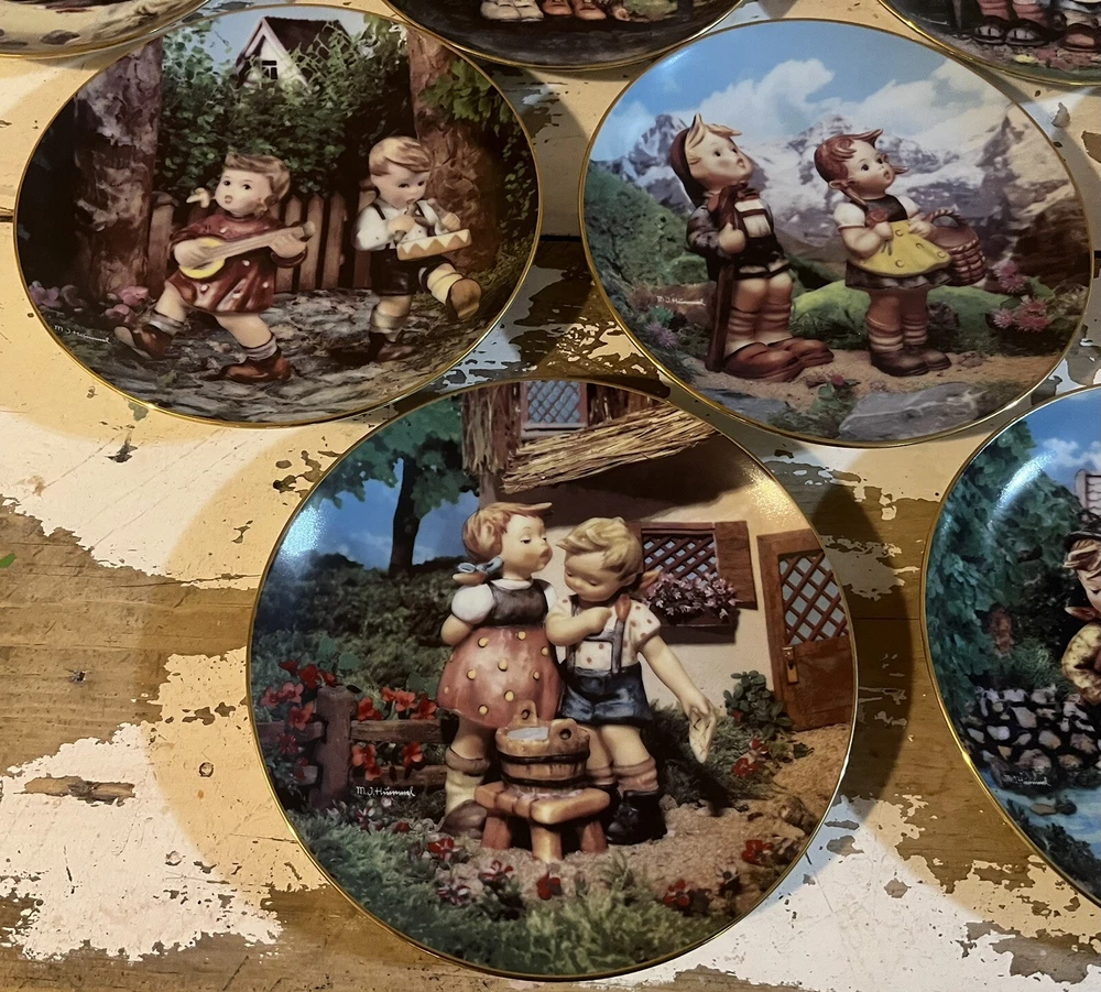 This is a vintage set of 12 collector plates from The Danbury Mint, featuring the M.I. Hummel Little Companions series. Each plate showcases a different scene of children, and is part of a product line that has become popular among collectors. The plates are a great addition to any decorative collectibles or collector plate collection. All plates are limited edition and part of a series that was only made for 14 firing days back in 1990. Each plate is numbered as well, helping to make this collection even more of a significant part of your collection. Each plate comes in its original packing as well, to help keep these plates safe during shipping as well as safe in your home when being stored as well. 1. Squeaky Clean 2. Private Parade 3. Tender Loving Care 4. Stormy Weather 5. Little Explorers 6. Hello Down There 7. Country Crossroads 8. Surprise 9. Apple Tree Boy & Girl 10. Budding Scholars 11. Come Back Soon 12. Little Musicians