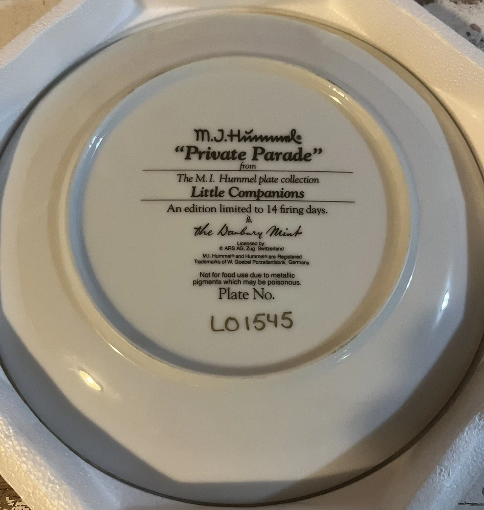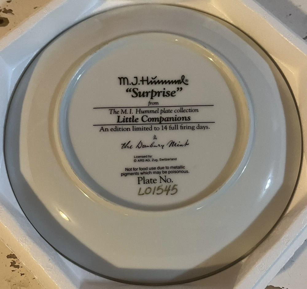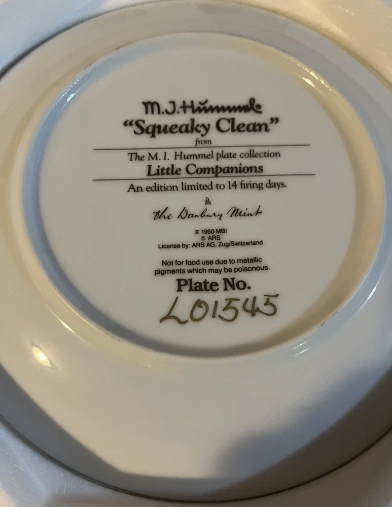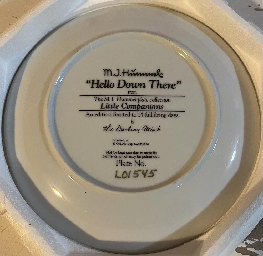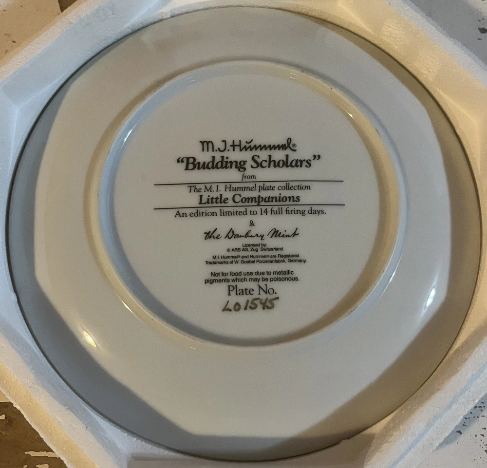 This is a vintage set of 12 collector plates from The Danbury Mint, featuring the M.I. Hummel Little Companions series. Each plate showcases a different scene of children, and is part of a product line that has become popular among collectors. The plates are a great addition to any decorative collectibles or collector plate collection. All plates are limited edition and part of a series that was only made for 14 firing days back in 1990. Each plate is numbered as well, helping to make this collection even more of a significant part of your collection. Each plate comes in its original packing as well, to help keep these plates safe during shipping as well as safe in your home when being stored as well. 1. Squeaky Clean 2. Private Parade 3. Tender Loving Care 4. Stormy Weather 5. Little Explorers 6. Hello Down There 7. Country Crossroads 8. Surprise 9. Apple Tree Boy & Girl 10. Budding Scholars 11. Come Back Soon 12. Little Musicians