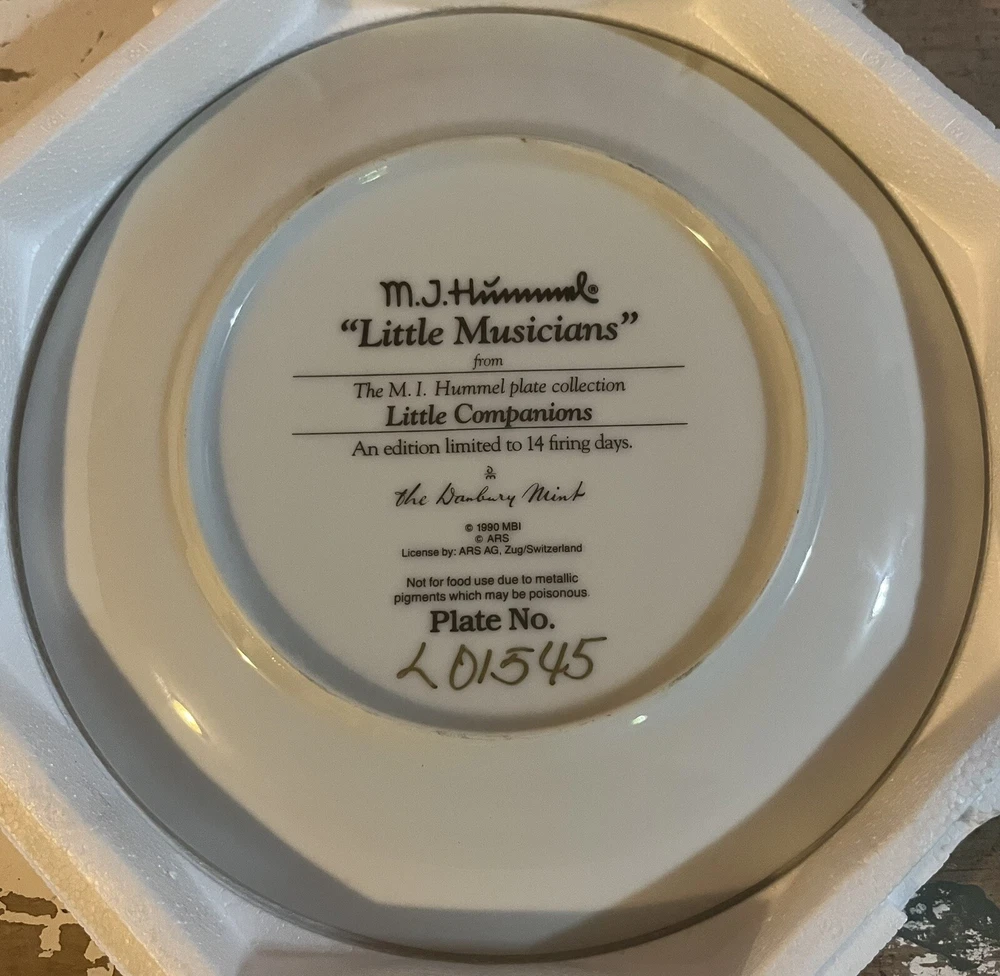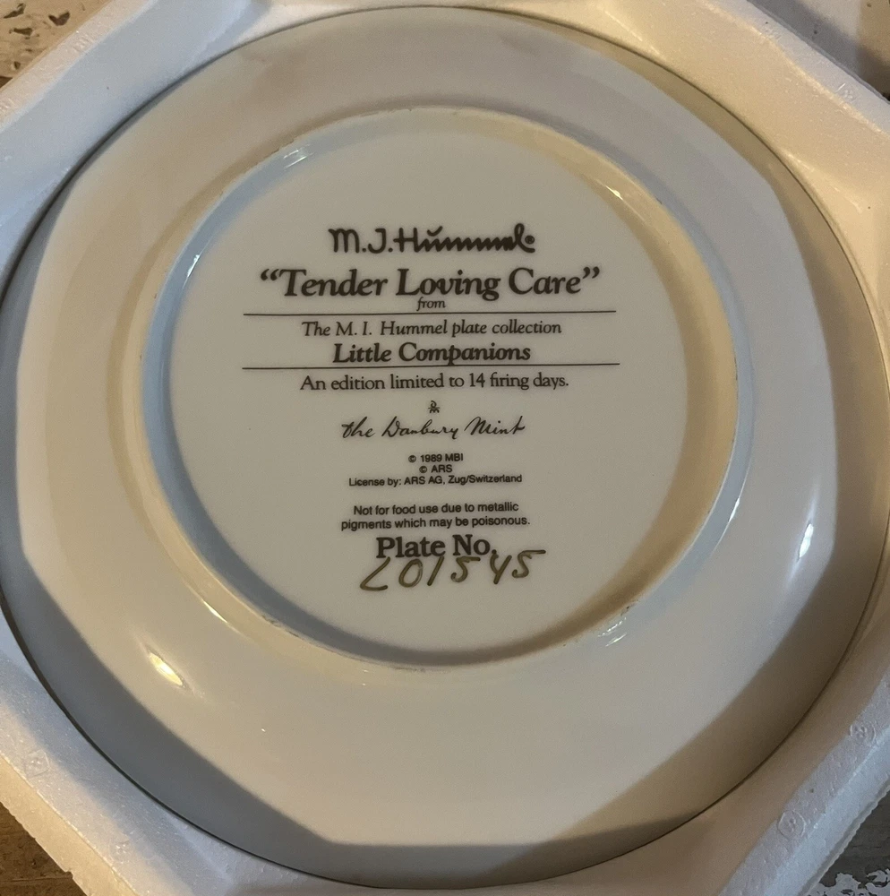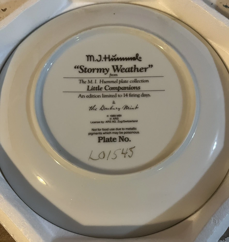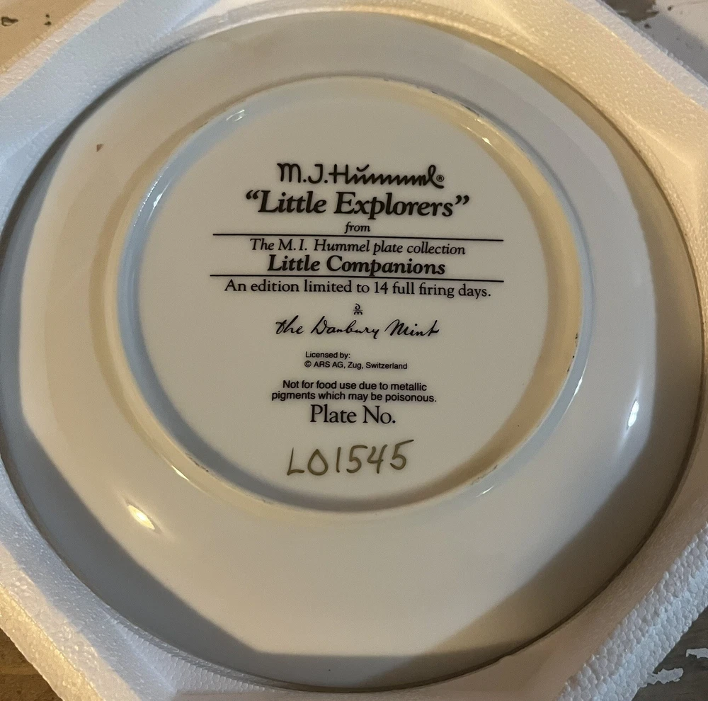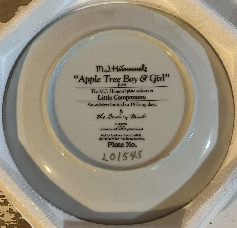 This is a vintage set of 12 collector plates from The Danbury Mint, featuring the M.I. Hummel Little Companions series. Each plate showcases a different scene of children, and is part of a product line that has become popular among collectors. The plates are a great addition to any decorative collectibles or collector plate collection. All plates are limited edition and part of a series that was only made for 14 firing days back in 1990. Each plate is numbered as well, helping to make this collection even more of a significant part of your collection. Each plate comes in its original packing as well, to help keep these plates safe during shipping as well as safe in your home when being stored as well. 1. Squeaky Clean 2. Private Parade 3. Tender Loving Care 4. Stormy Weather 5. Little Explorers 6. Hello Down There 7. Country Crossroads 8. Surprise 9. Apple Tree Boy & Girl 10. Budding Scholars 11. Come Back Soon 12. Little Musicians