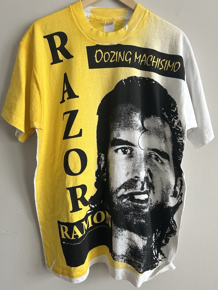 Vintage 1990s Razor Ramon Oozing Machismo AOP T Shirt New old stock Never Washed or Worn (Should Shrink after machine wash/ dry) Front Print Only Fruit of the Loom tag Made in USA 100% Cotton No flaws If you have any questions feel free to message Tagged Size XL Pit to Pit: 23.5” Length 32”