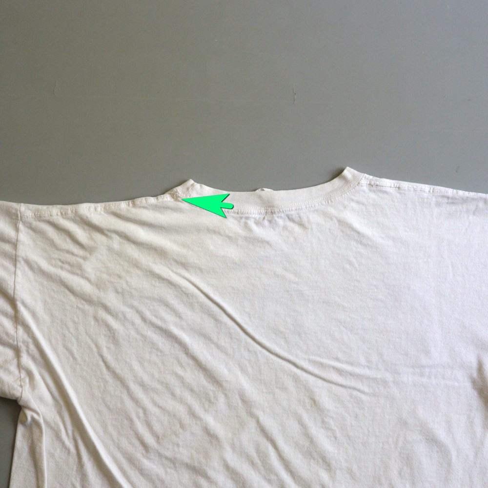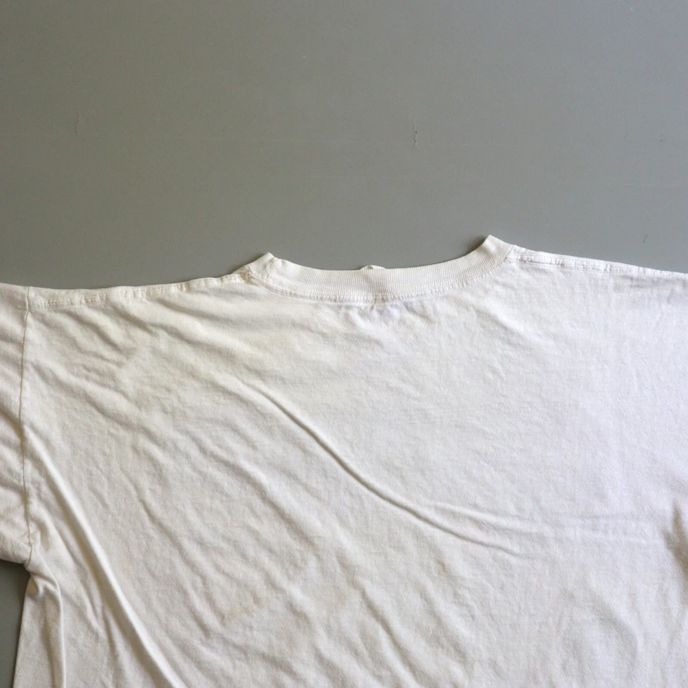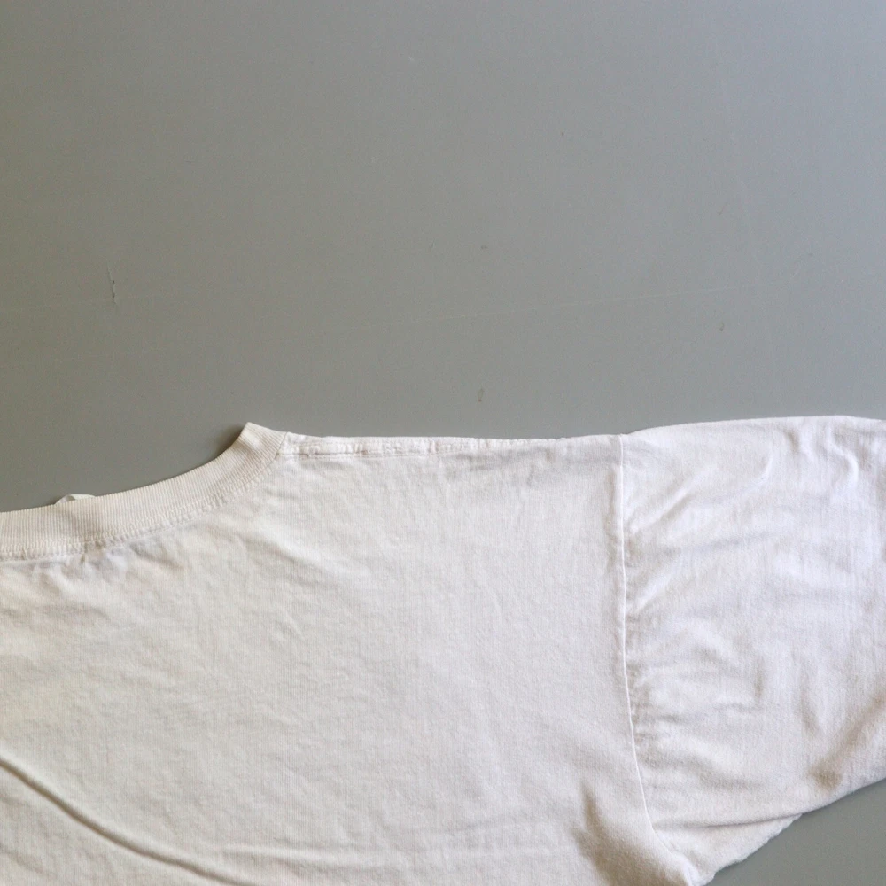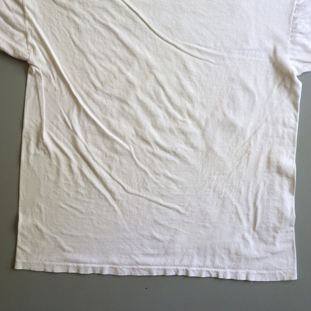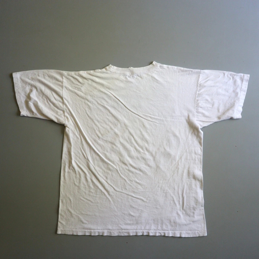 Unknown label The tag is faded and torn Printed design White Fabric material is unknown (most likely cotton) 1993 *** Original size is Unknown (the tag is too faded and torn to read) . ((We estimate a L/XL fit)). Since sizing varies from garment to garment, please measure for proper and desired fit.*** ****Cleaned and ready to wear. Faded and distressed. Fabric pilling. Wear / cracking to the print. Spots / staining throughout and to the underarms. Some tiny holes to the left shoulder. * *** Measurements are taken with the garment lying flat. Shoulder - 22.5" measured straight across the front, shoulder seam to seam Chest - 23" measured straight across the front, underarm seam to seam Length - 27" measured from the top of the collar to the bottom hem (down the back) The best thing to do is to compare the measurements here to the measurements of a similar item that you own and that fits you well. We are always happy to help. Please ask if you have any questions.