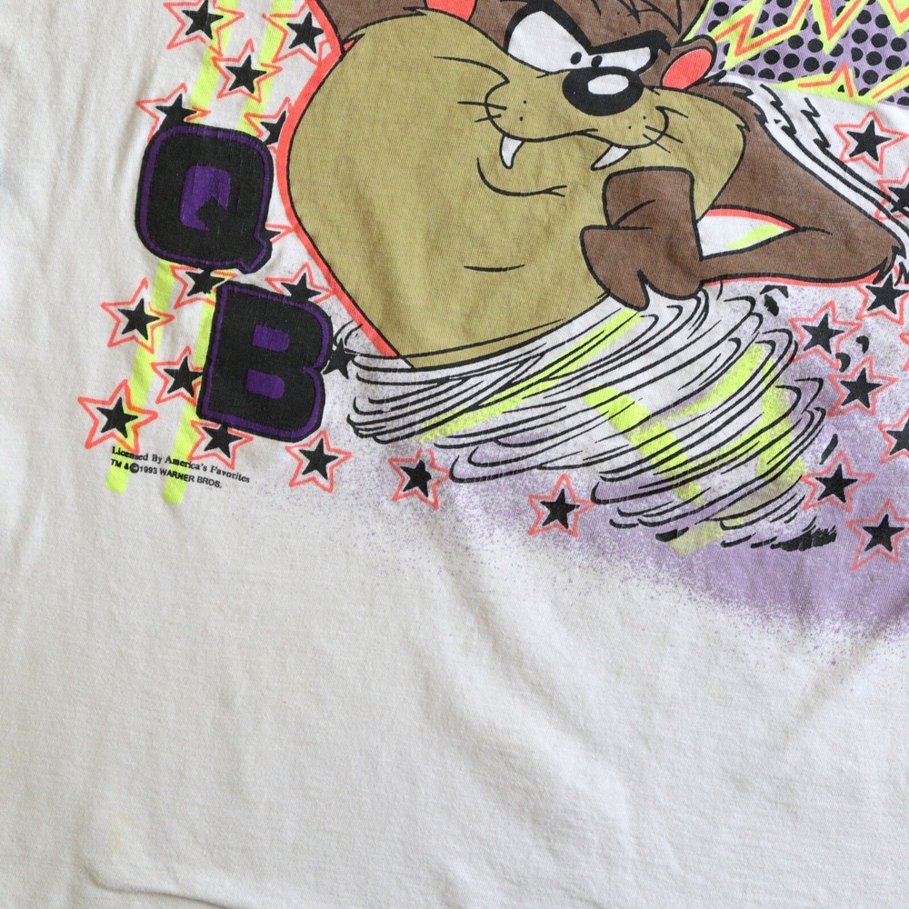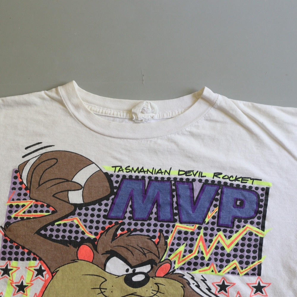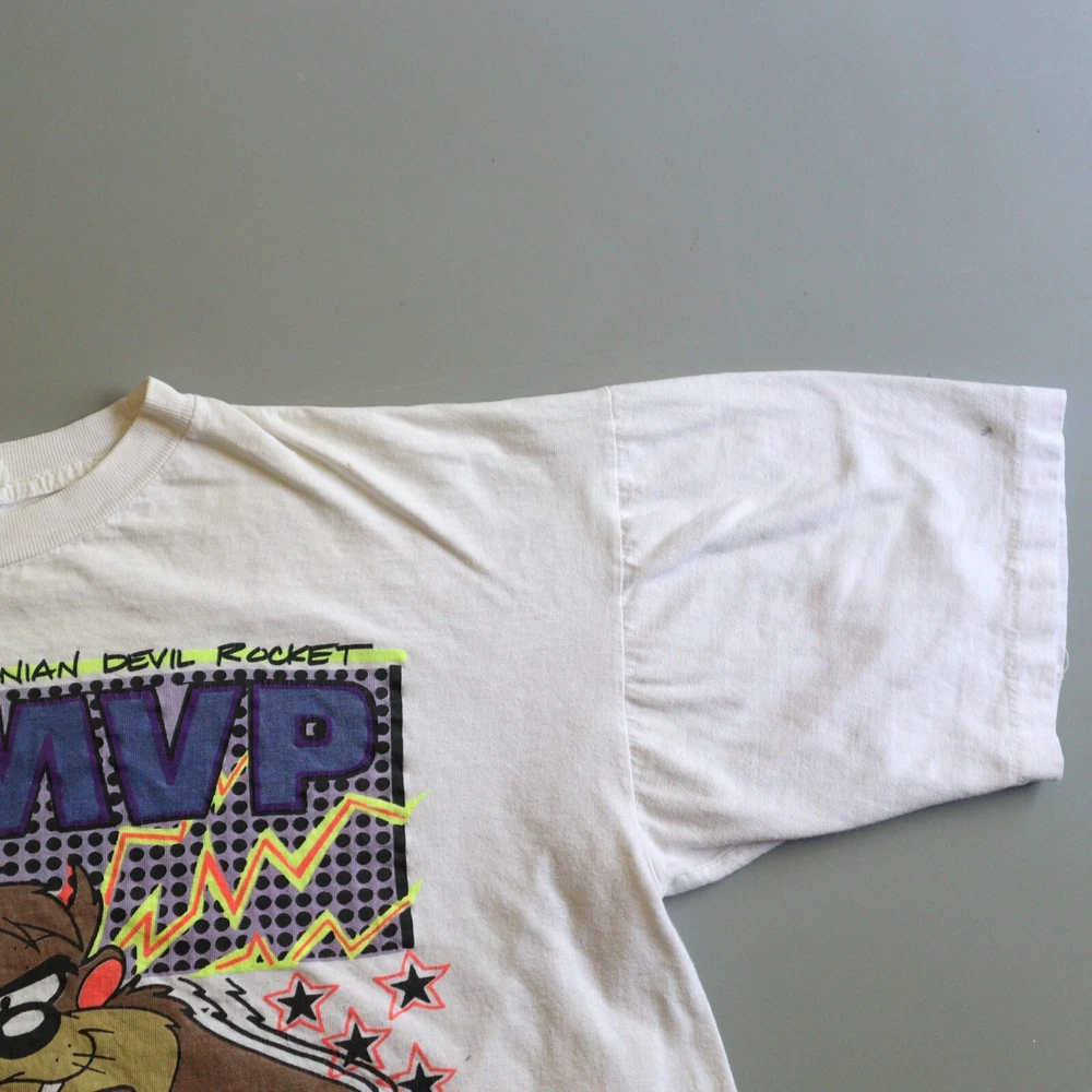 This vintage Taz shirt is a must-have for any Looney Tunes fan! The distressed look gives it authentic '90s charm, and the MVP football print is a fun throwback. The fabric is soft and comfy, with a relaxed fit that's great for casual wear. Some fading and minor wear add character—perfect for a laid-back, retro vibe. Love the unique design!