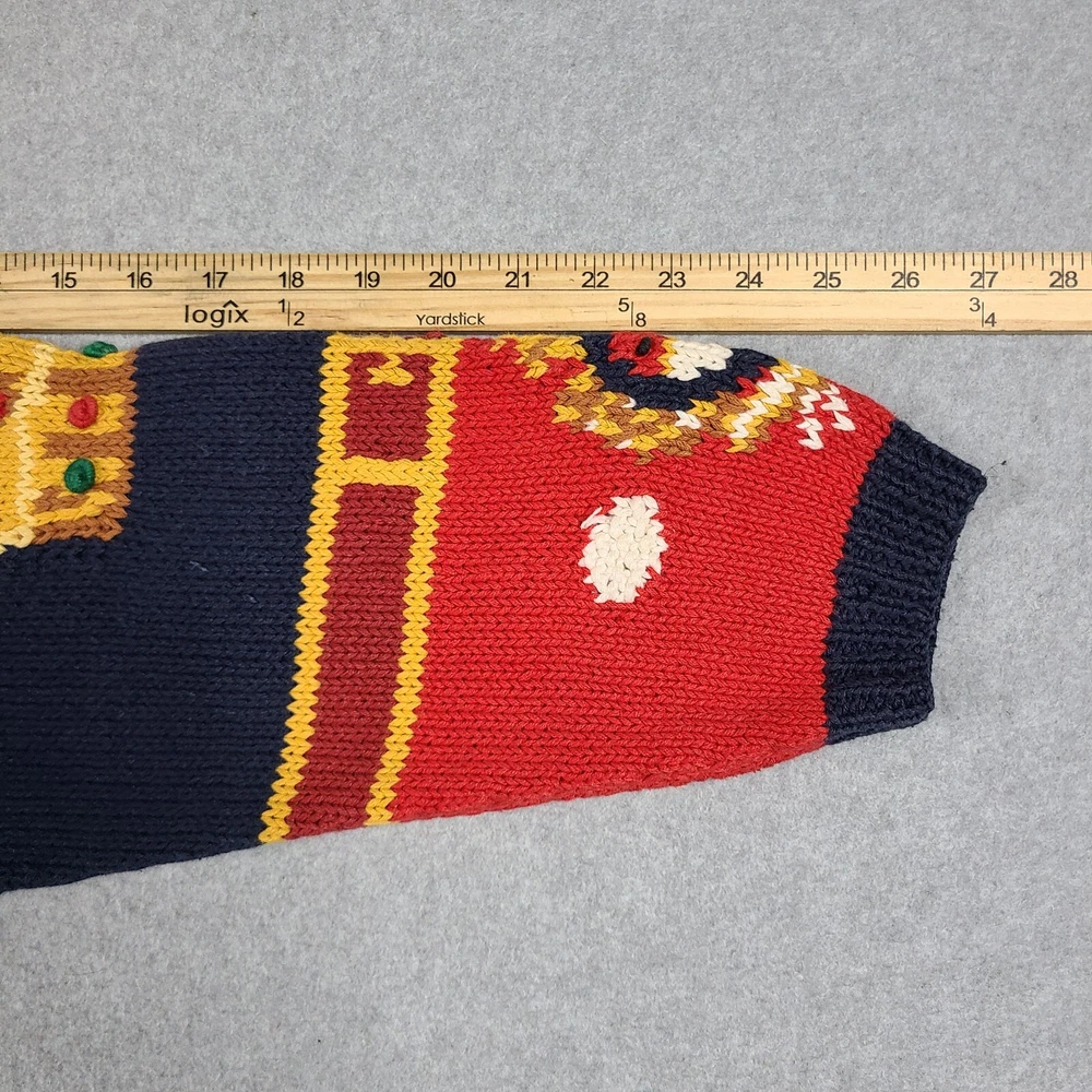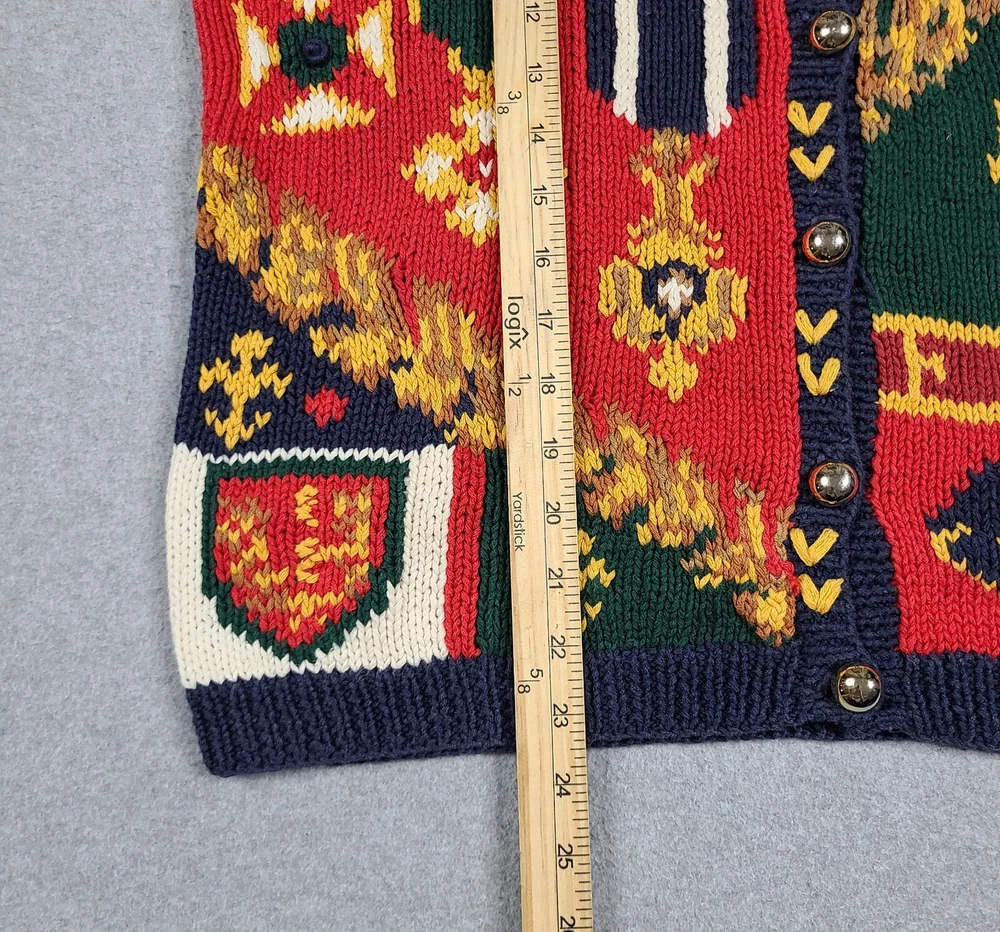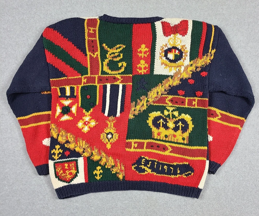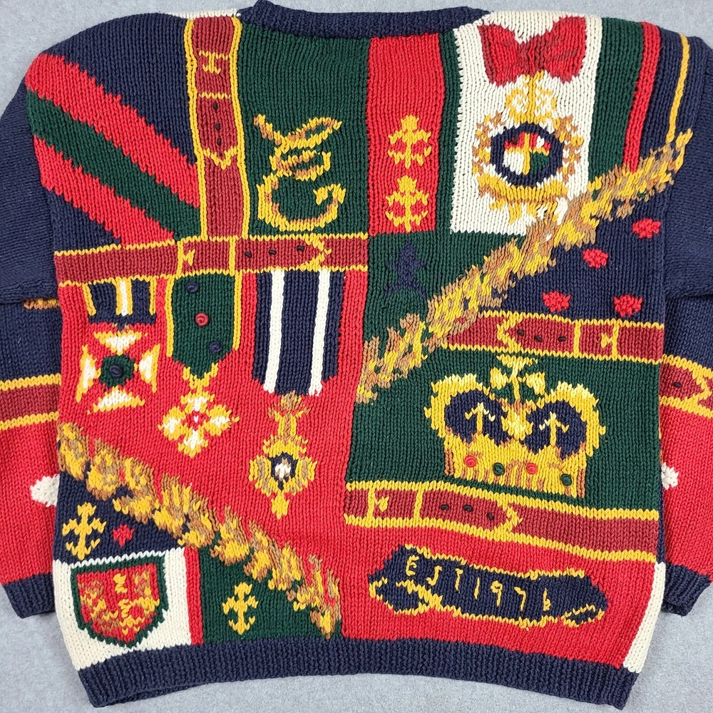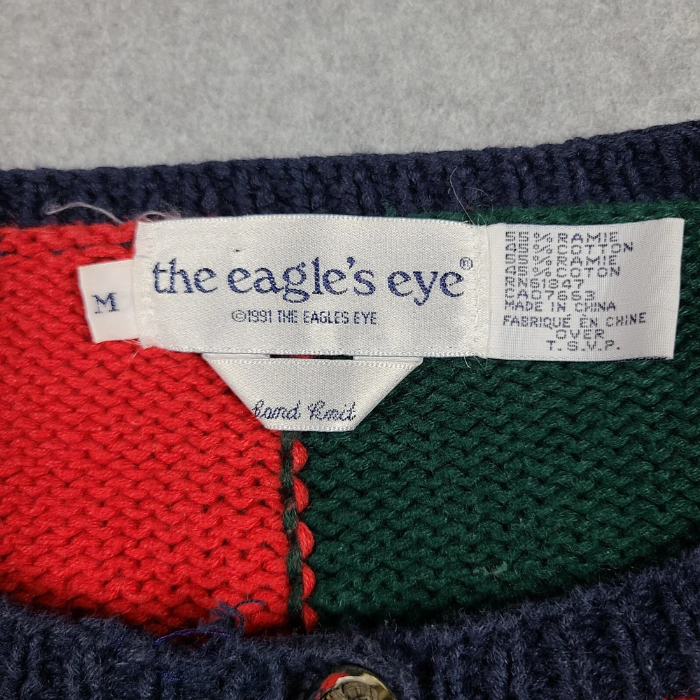 Small hole in front. Please see ALL pictures before purchasing. This vintage 1991 Eagles Eye Crown Royalty hand knit sweater cardigan is a must-have for any fashion-savvy woman. With its colorful, 90s-inspired design and heavyweight, shoulder-padded construction, this sweater is perfect for any occasion. The round neckline and collarless style add a touch of sophistication, while the button accents and knit fabric type give it a unique, vintage feel. Made from a blend of ramie and cotton materials, this sweater is easy to care for and should be hand washed only. It comes in a size M, with a regular fit and long sleeves. This sweater is perfect for anyone looking for a comfortable, stylish, and unique piece of clothing.