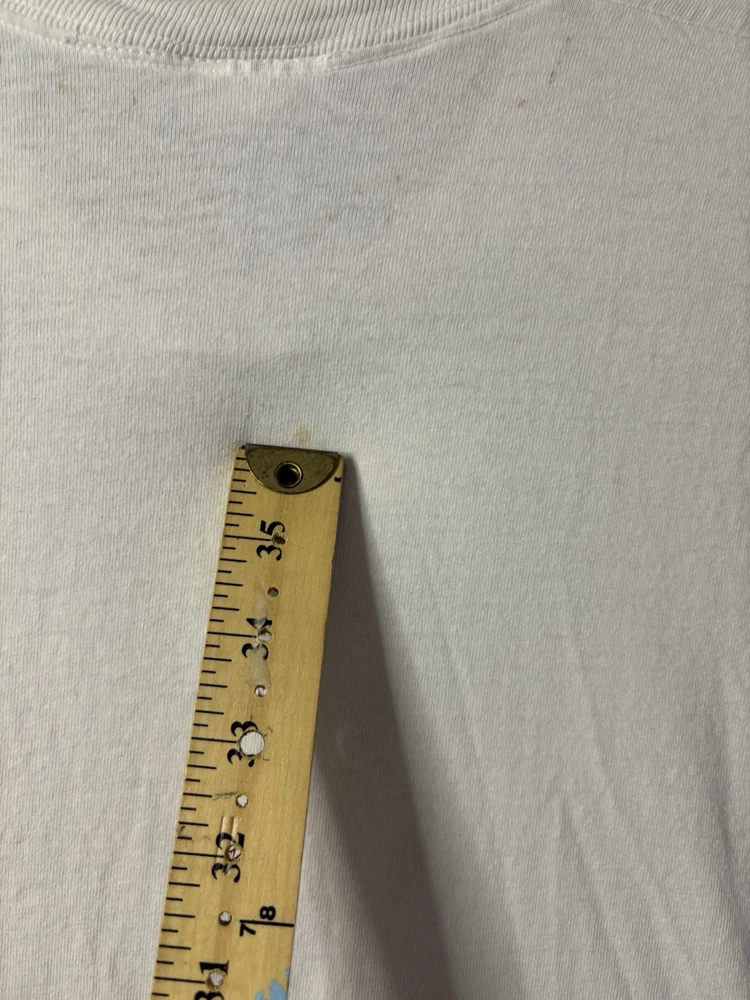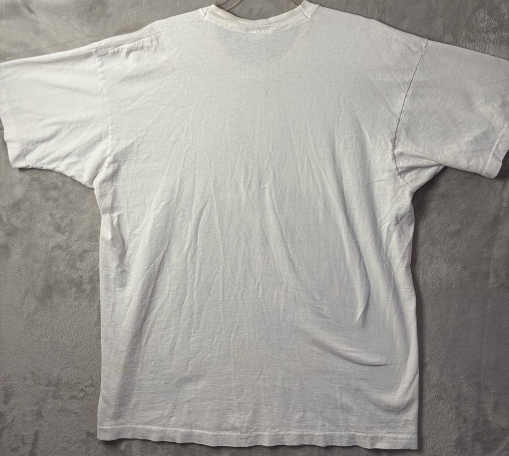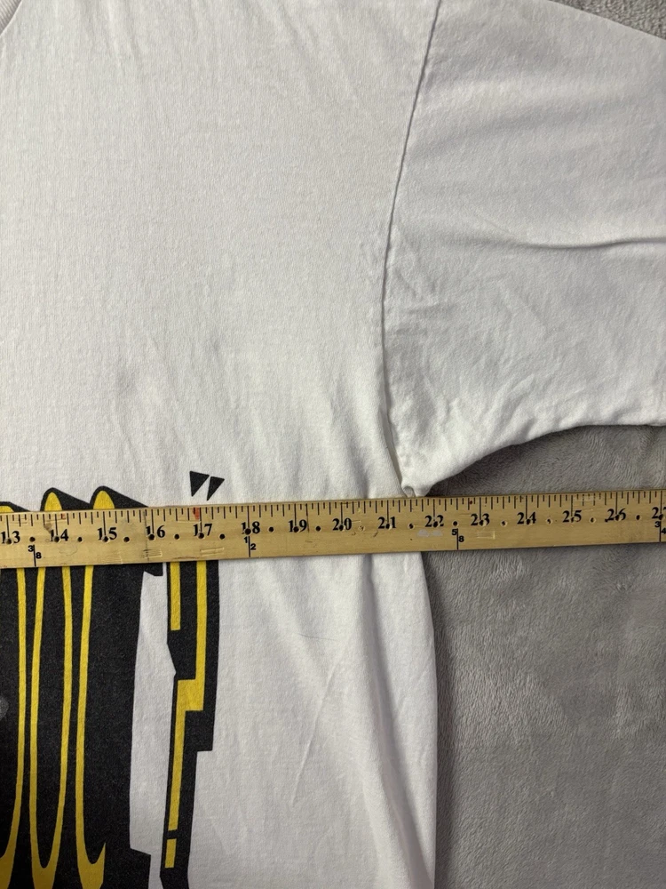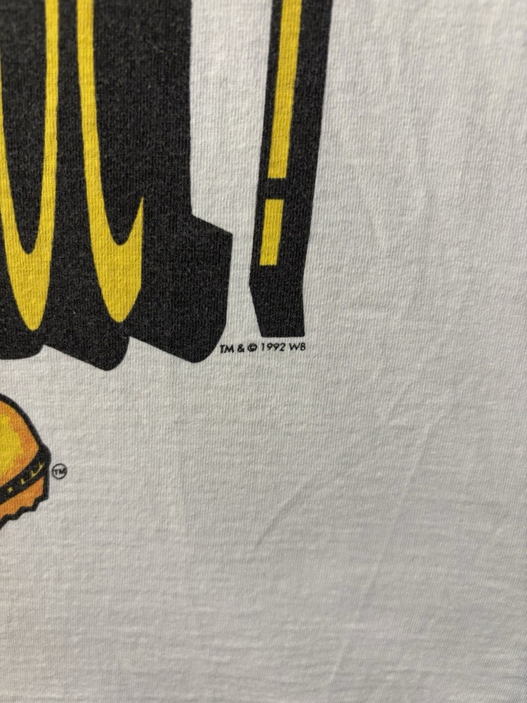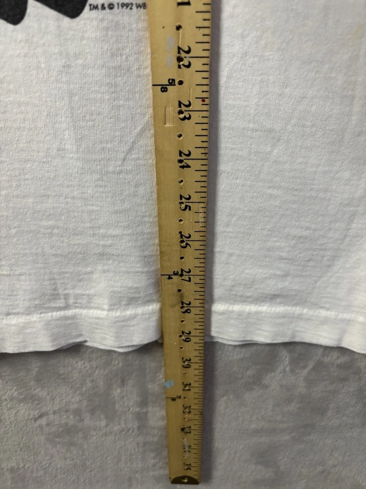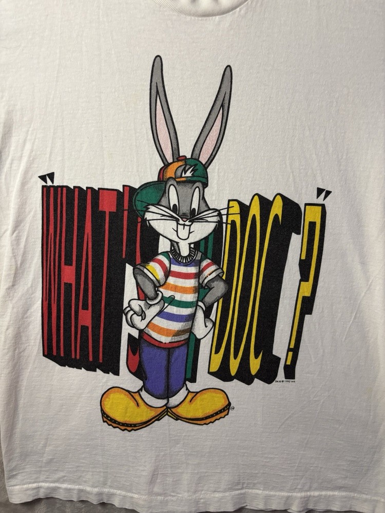 Vintage 1992 Bugs Bunny Looney Tunes Graphic T-Shirt Classic early 90s piece featuring Bugs Bunny with a bold “What’s Up Doc” graphic. Dated 1992 and officially licensed by Warner Bros.. Great vintage cartoon tee with strong front hit and nostalgic appeal. Features: • Original 1992 Warner Bros copyright • Bugs Bunny “What’s Up Doc” graphic • Jerry Leigh tag • Single stitch era construction • White cotton t-shirt Condition: GOOD PRE-OWNED CONDITION. There is visible storage/discoloration around the collar area as shown in photos. Light general wear consistent with age. Please review all photos carefully for full condition details. Measurements: Pit to Pit: 22 inches Length: 29 inches Please Note: TAGGED SIZE UNKNOWN. FITS APPROXIMATELY A MEN’S LARGE (22X29). PLEASE REVIEW MEASUREMENTS. Colors may vary slightly due to lighting. Customer Satisfaction: We carefully inspect all branded items and only sell genuine merchandise. Shipping: Item will be shipped within handling time. We package with care.