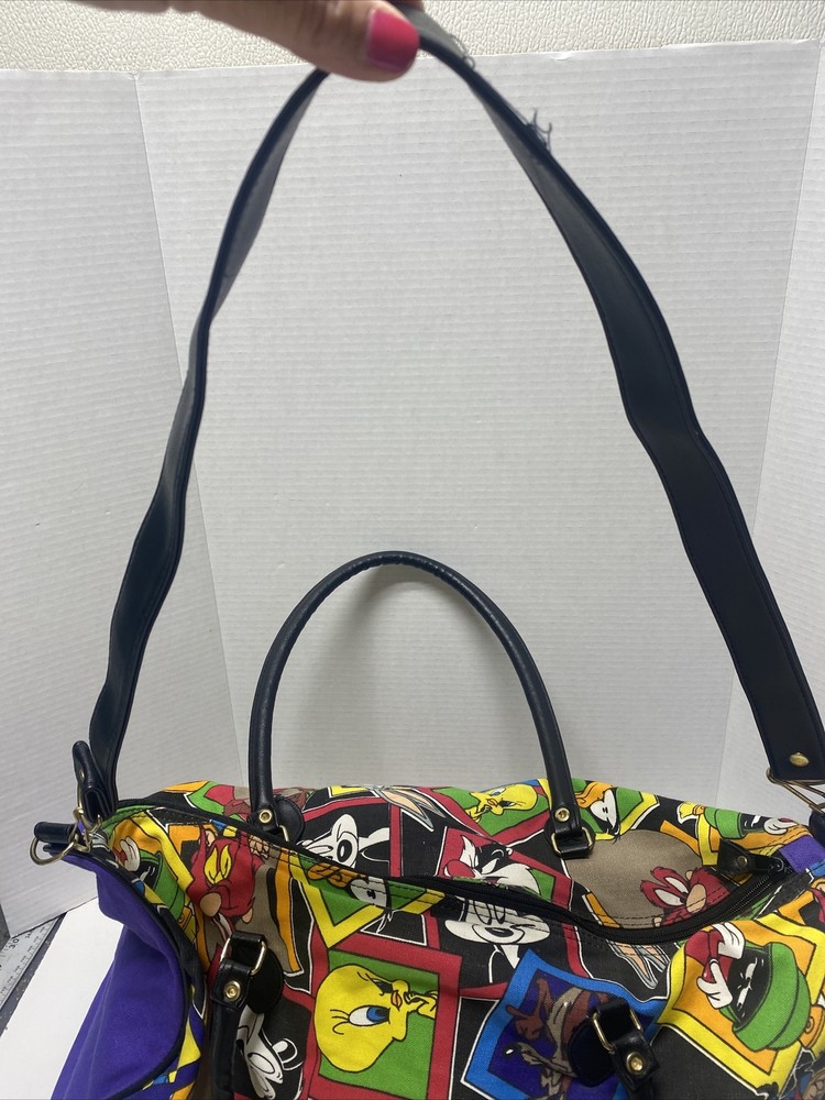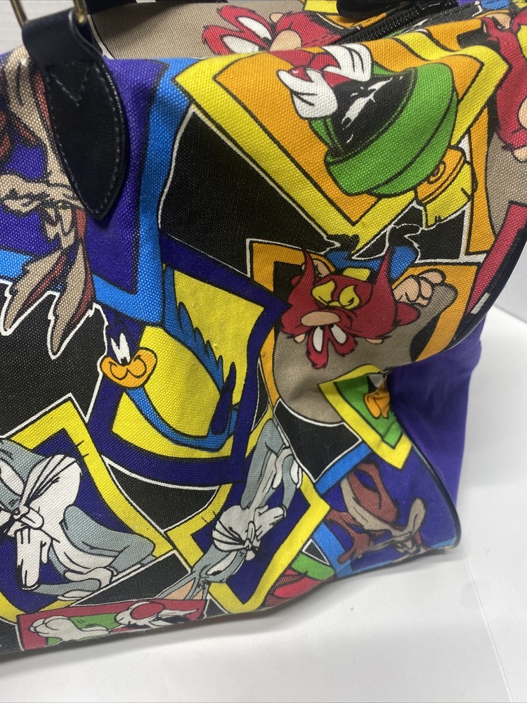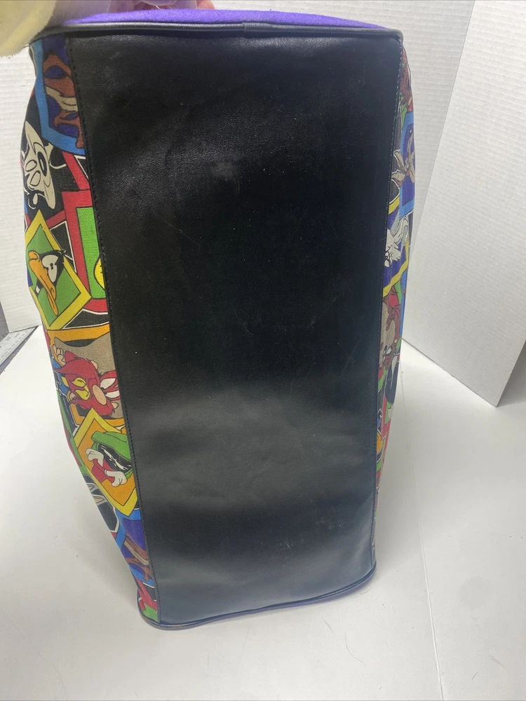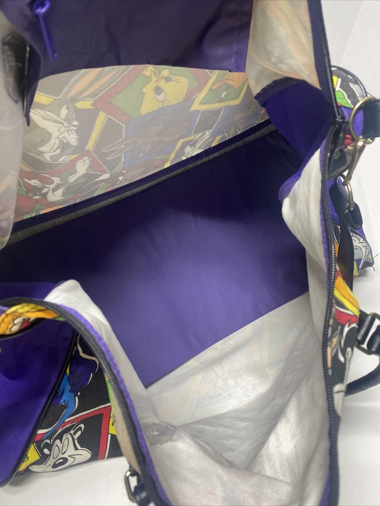 Vintage 1993 Looney Tunes Duffle Bag Bugs Taz Tweetie Characters purple black Large 20 x 14 x 9" Pre owned in great condition