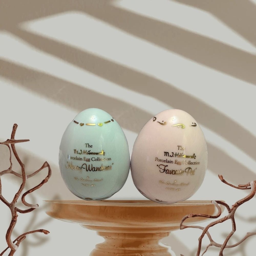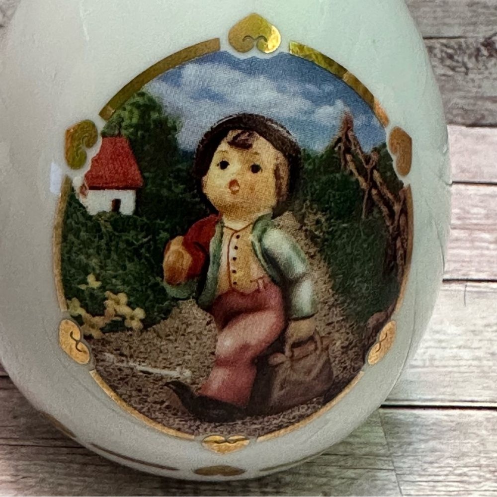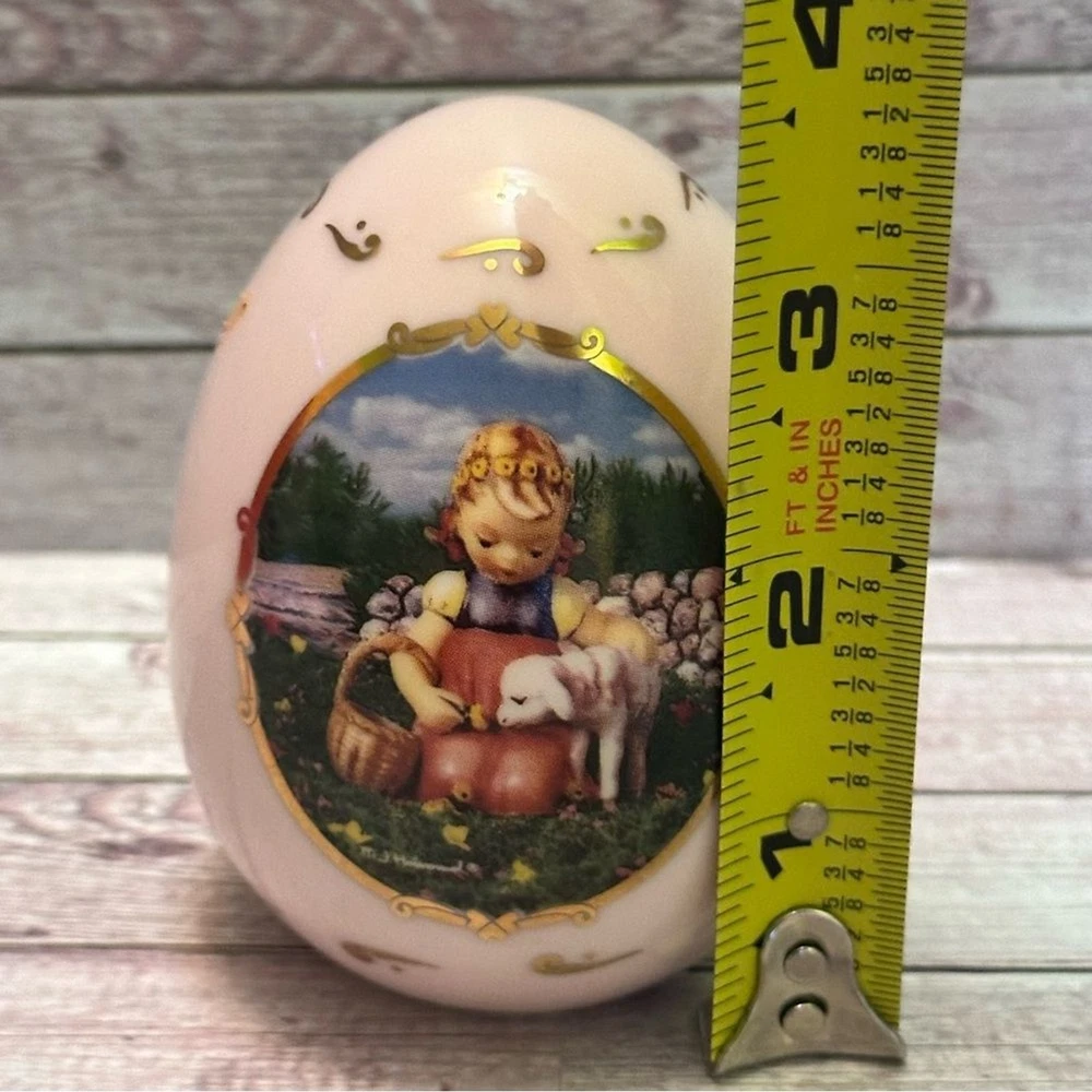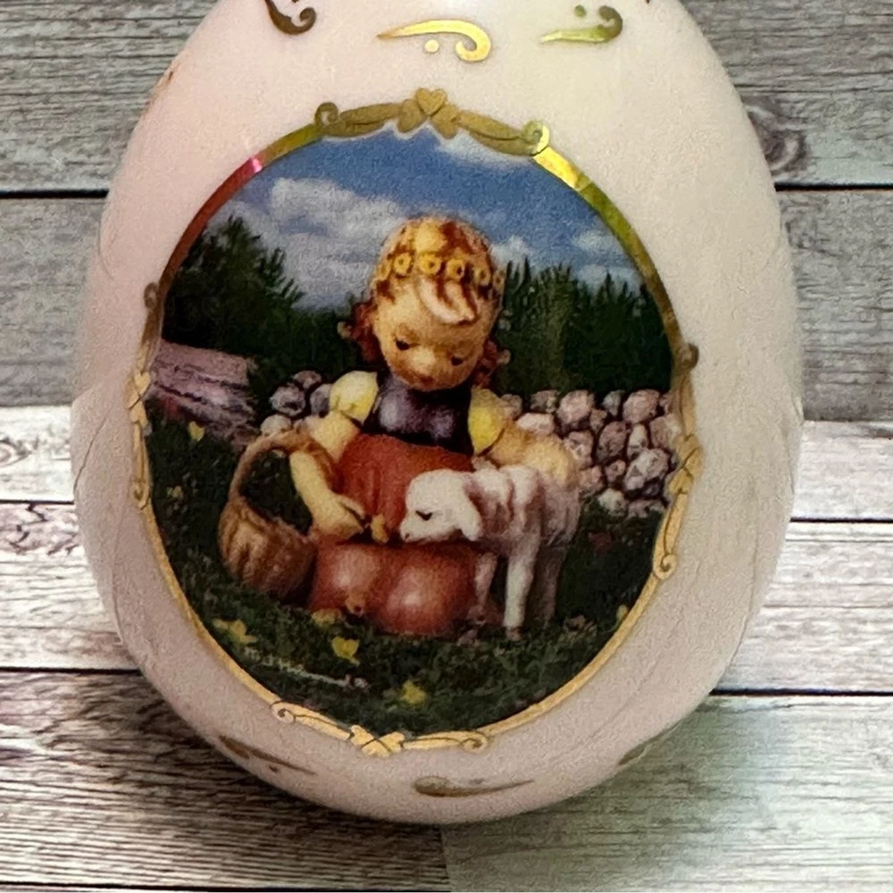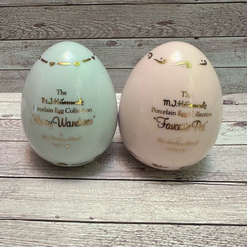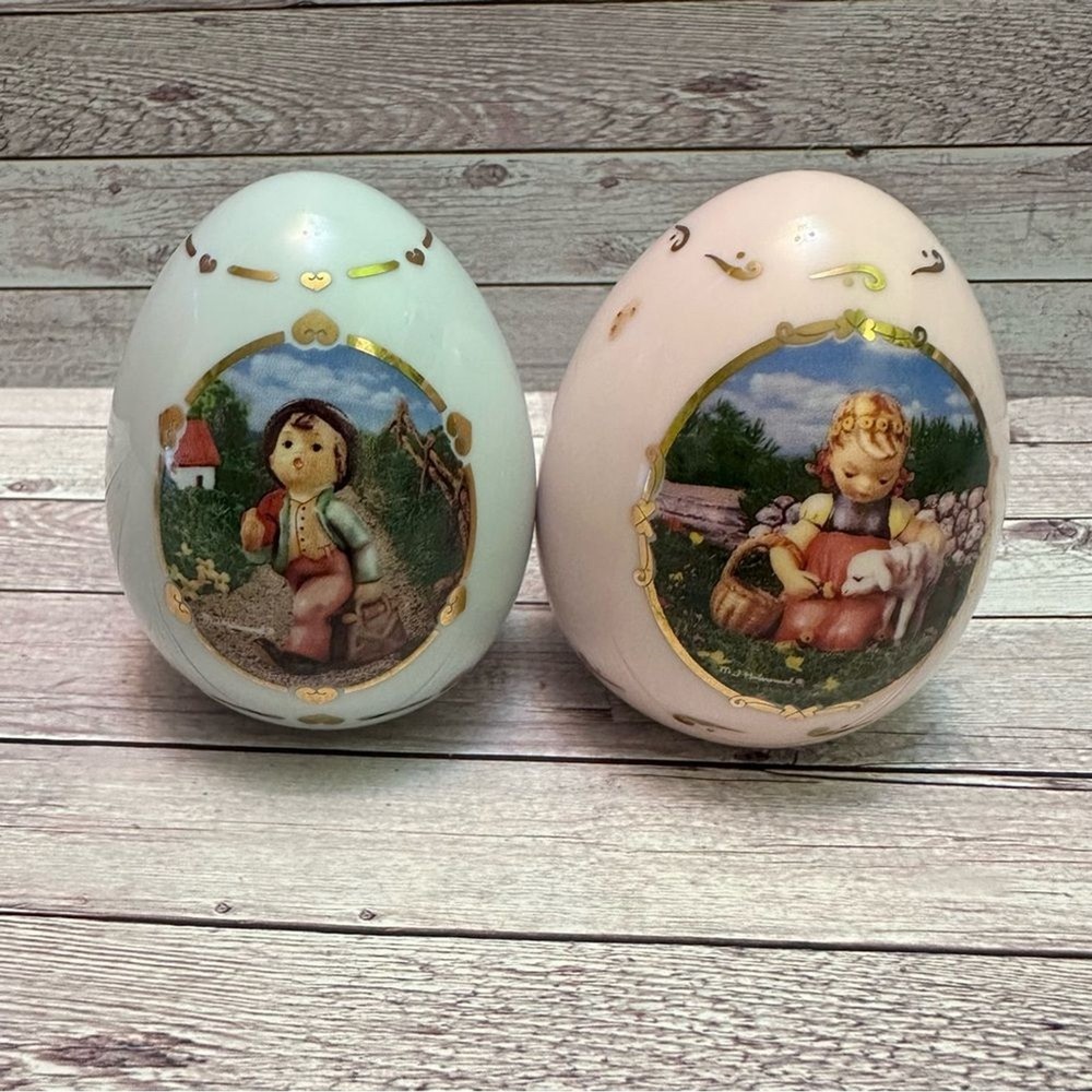 M J Hummel collectibles eggs Set of two decorative egg figurines with pastoral scenes. Features pastel green and cream colors with gold accents.vintage 1993 Great Condition free smoke