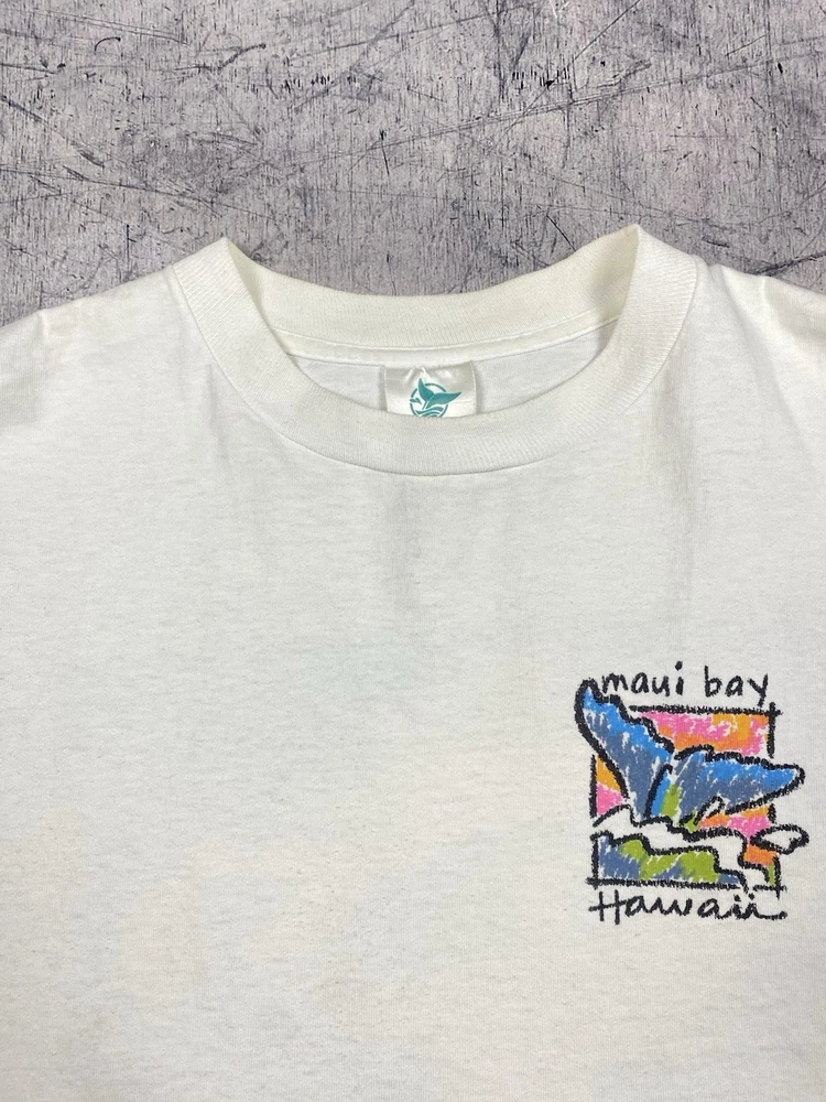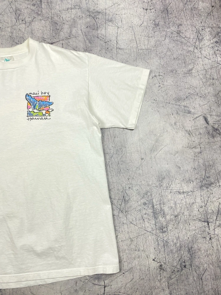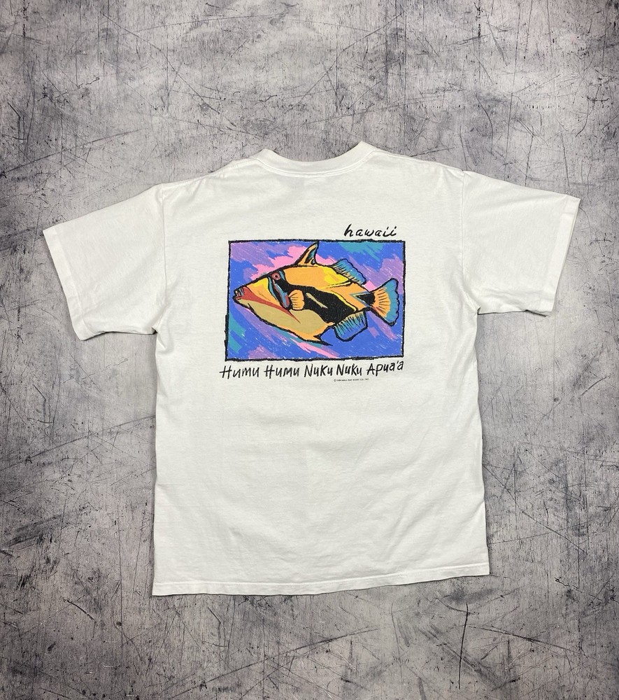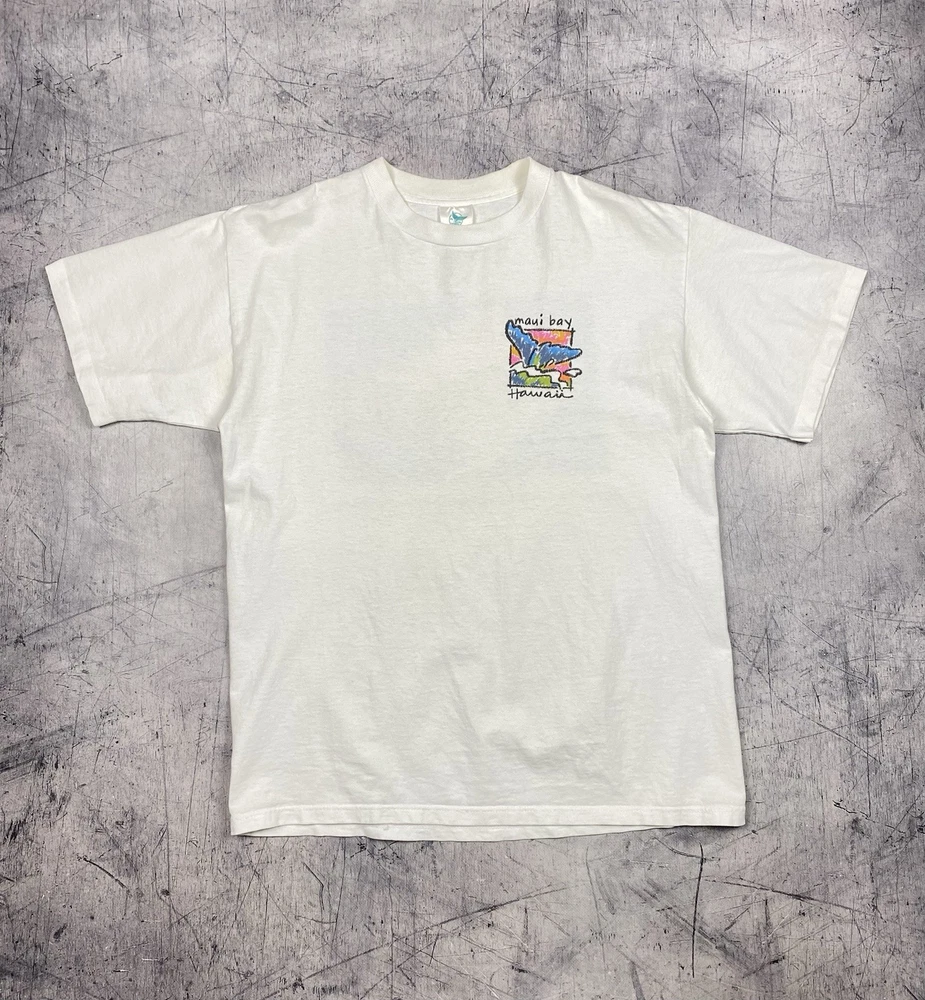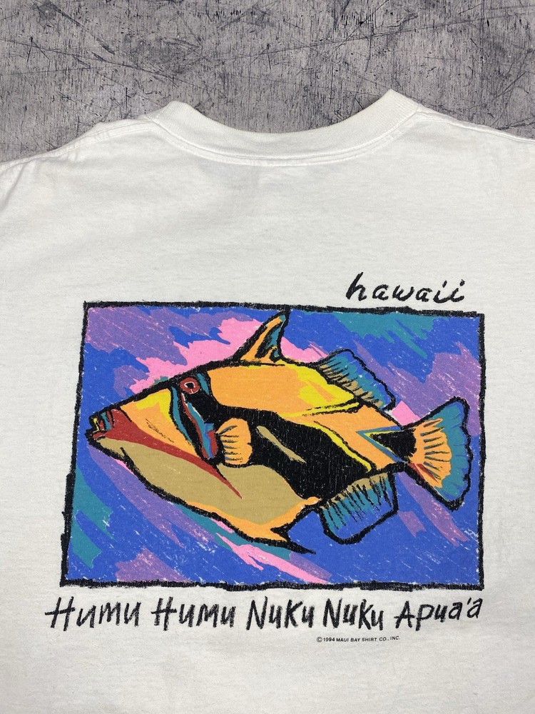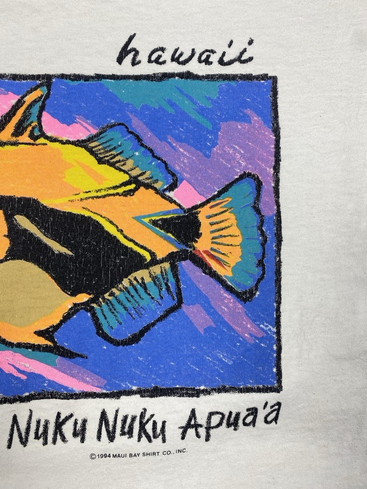 Vintage Maui Bay Hawaii fish graphic T-shirt from 1994. Condition: pre-owned vintage condition. No holes. There are yellowish visible stains under the armpits and on the collar. The graphic print shows cracking due to age and wear. All flaws are clearly shown in the photos. Overall still a nice authentic vintage piece. Original Maui Bay Shirt Co. item. Made in USA. 100% cotton. Measurements (approx.): • Shoulders: 53 cm / 20.9 in • Chest (pit to pit): 55 cm / 21.7 in • Length (back): 71 cm / 28.0 in Please review all photos carefully and check measurements before purchasing. Feel free to ask any questions.