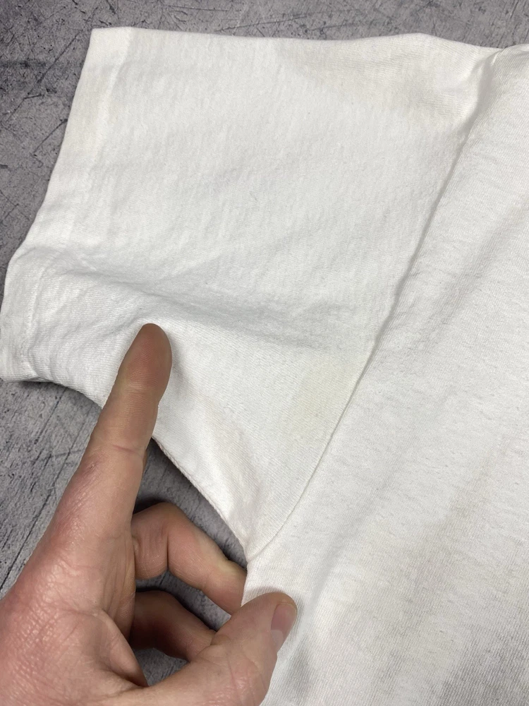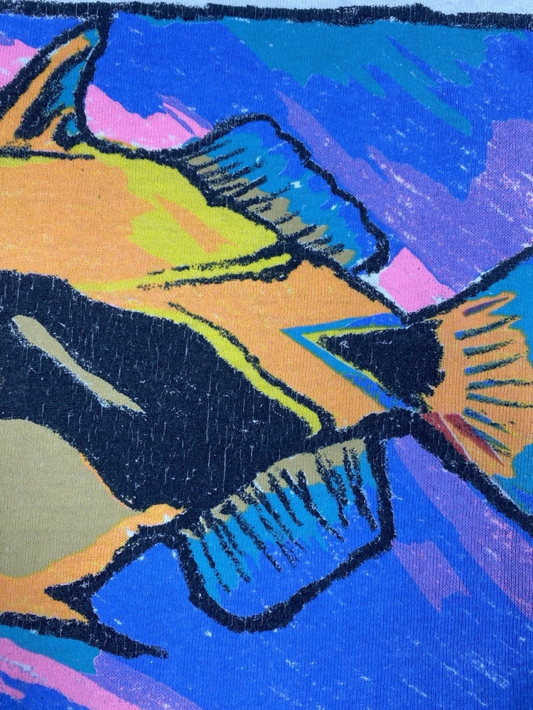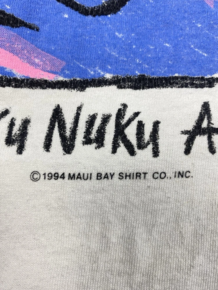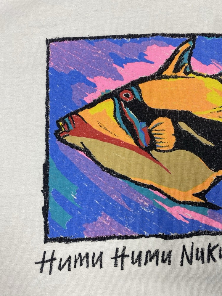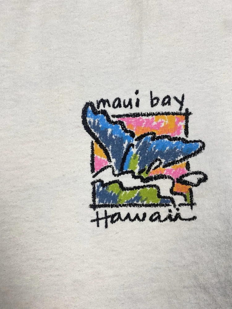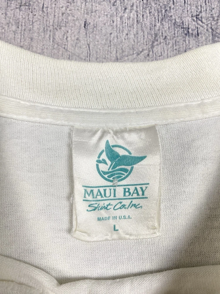 Vintage Maui Bay Hawaii fish graphic T-shirt from 1994. Condition: pre-owned vintage condition. No holes. There are yellowish visible stains under the armpits and on the collar. The graphic print shows cracking due to age and wear. All flaws are clearly shown in the photos. Overall still a nice authentic vintage piece. Original Maui Bay Shirt Co. item. Made in USA. 100% cotton. Measurements (approx.): • Shoulders: 53 cm / 20.9 in • Chest (pit to pit): 55 cm / 21.7 in • Length (back): 71 cm / 28.0 in Please review all photos carefully and check measurements before purchasing. Feel free to ask any questions.