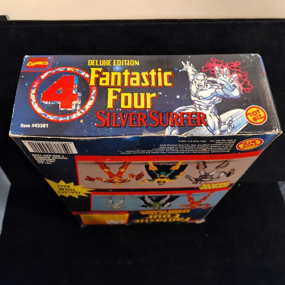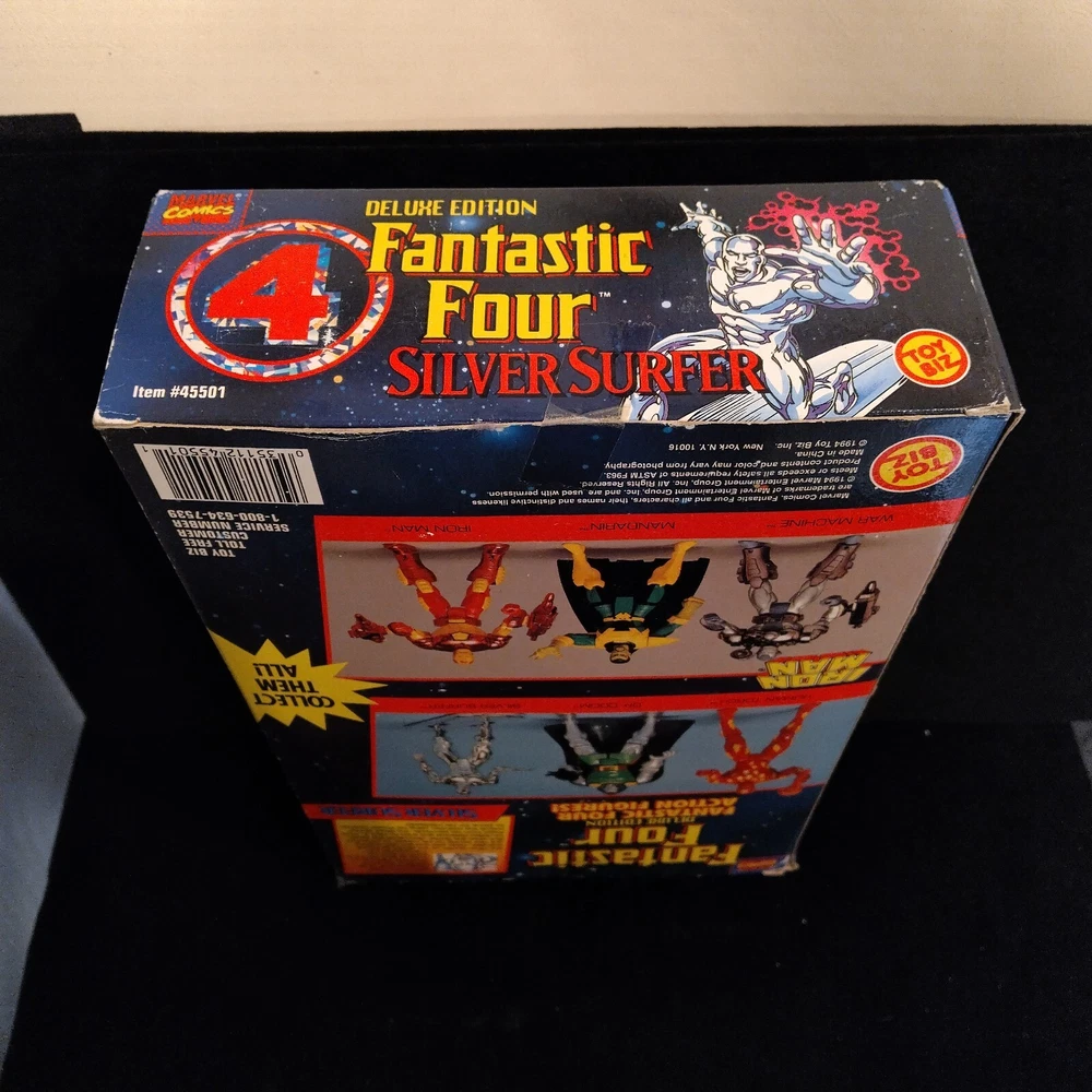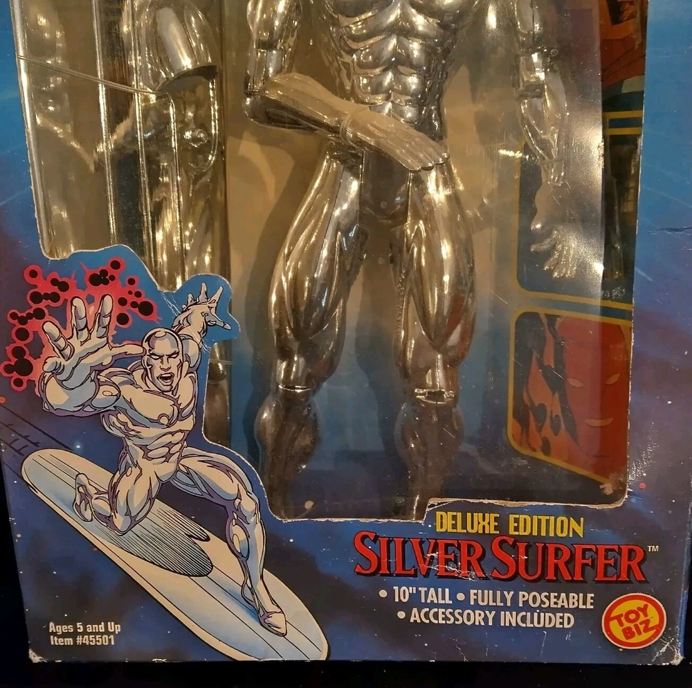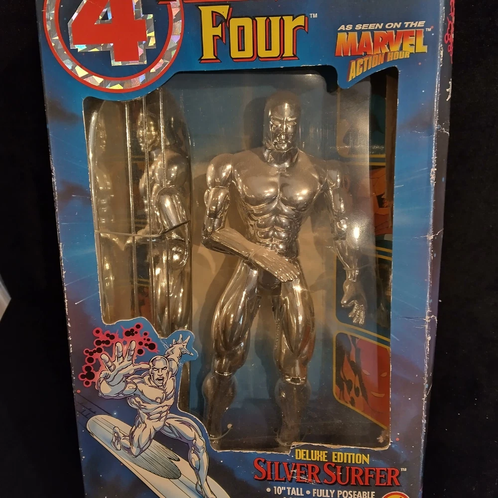 This vintage Toy Biz Marvel Fantastic Four Silver Surfer Action Figure is a must-have for any comic book hero collector. This 1st edition, boxed figure features the iconic Silver Surfer character from the Fantastic Four TV show and movie franchise. The figure stands at 10 inches tall and is made of high-quality plastic material with a silver color finish. The action figure is a licensed reproduction from the original 1994 Toy Biz collection and is perfect for fans of the Fantastic Four series. This item includes a helmet and surfboard, and is suitable for ages 8-11 years. Don't miss your chance to own a piece of Marvel history with this original Silver Surfer action figure. There is some damage to box, the plastic has separated from cardboard on one side. Please see photos for exact condition.