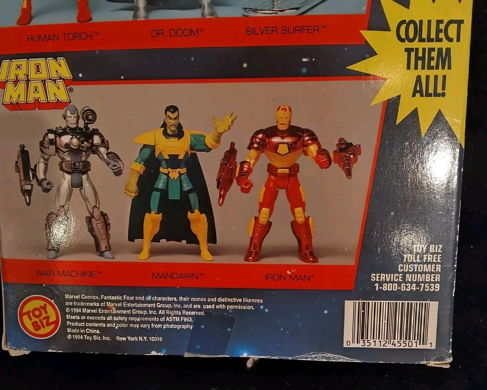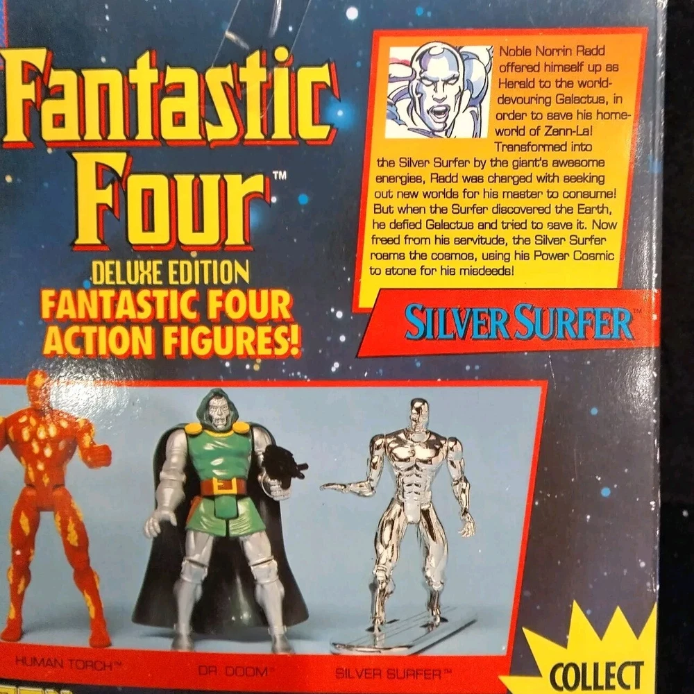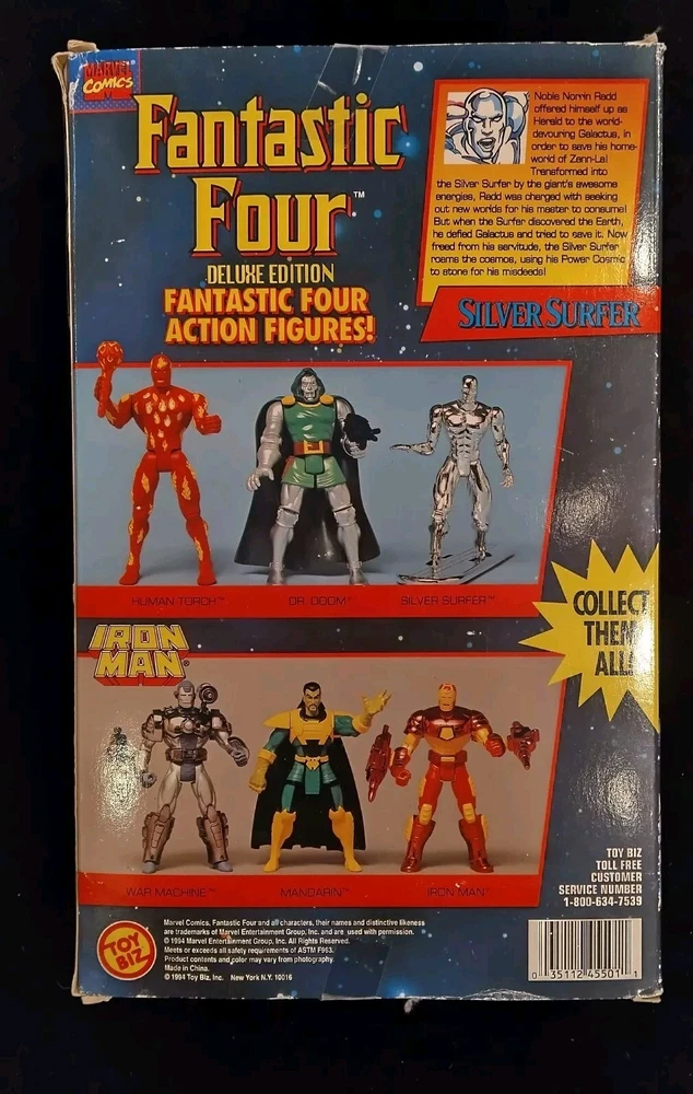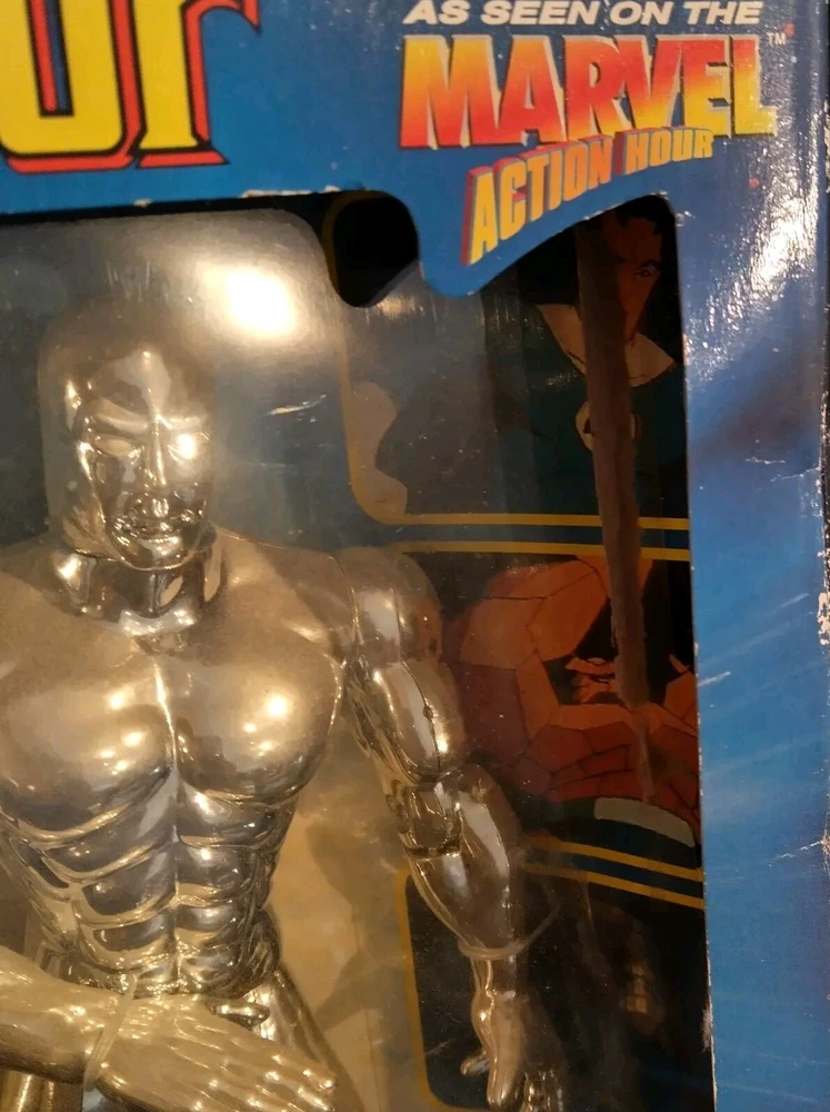 This vintage Toy Biz Marvel Fantastic Four Silver Surfer Action Figure is a must-have for any comic book hero collector. This 1st edition, boxed figure features the iconic Silver Surfer character from the Fantastic Four TV show and movie franchise. The figure stands at 10 inches tall and is made of high-quality plastic material with a silver color finish. The action figure is a licensed reproduction from the original 1994 Toy Biz collection and is perfect for fans of the Fantastic Four series. This item includes a helmet and surfboard, and is suitable for ages 8-11 years. Don't miss your chance to own a piece of Marvel history with this original Silver Surfer action figure. There is some damage to box, the plastic has separated from cardboard on one side. Please see photos for exact condition.