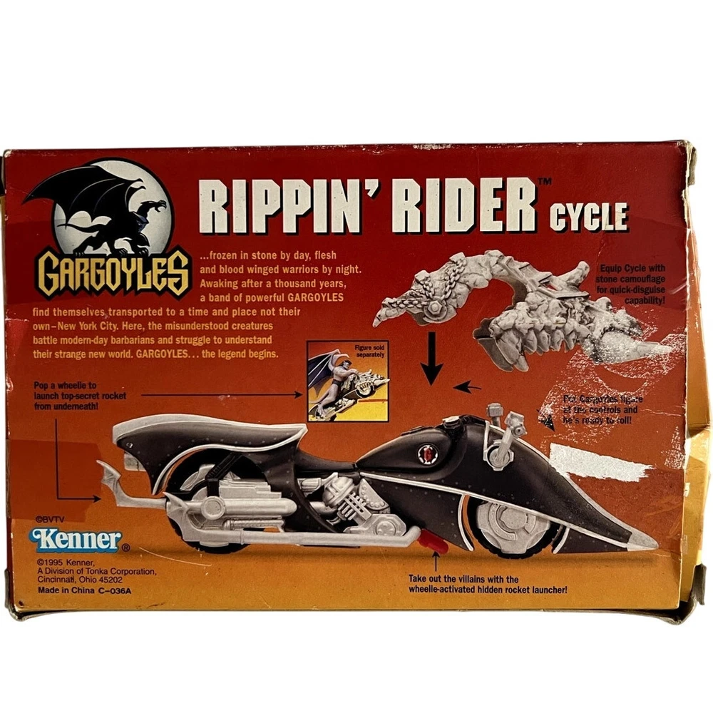 This vintage Kenner Hasbro Gargoyles Rippin' Rider Cycle is a must-have for any Star Trek fan or collector of action figures. With its unique design and intricate details, this toy vehicle is sure to impress. Featuring the iconic Gargoyle character and manufactured in 1995, this cycle is a true gem for any fan of the franchise.The brand of this toy is Kenner, and it falls under the category of action figures and toys. This vehicle is perfect for display or play, and would make a great addition to any collection. Don't miss out on the opportunity to own this one-of-a-kind piece of Star Trek history.