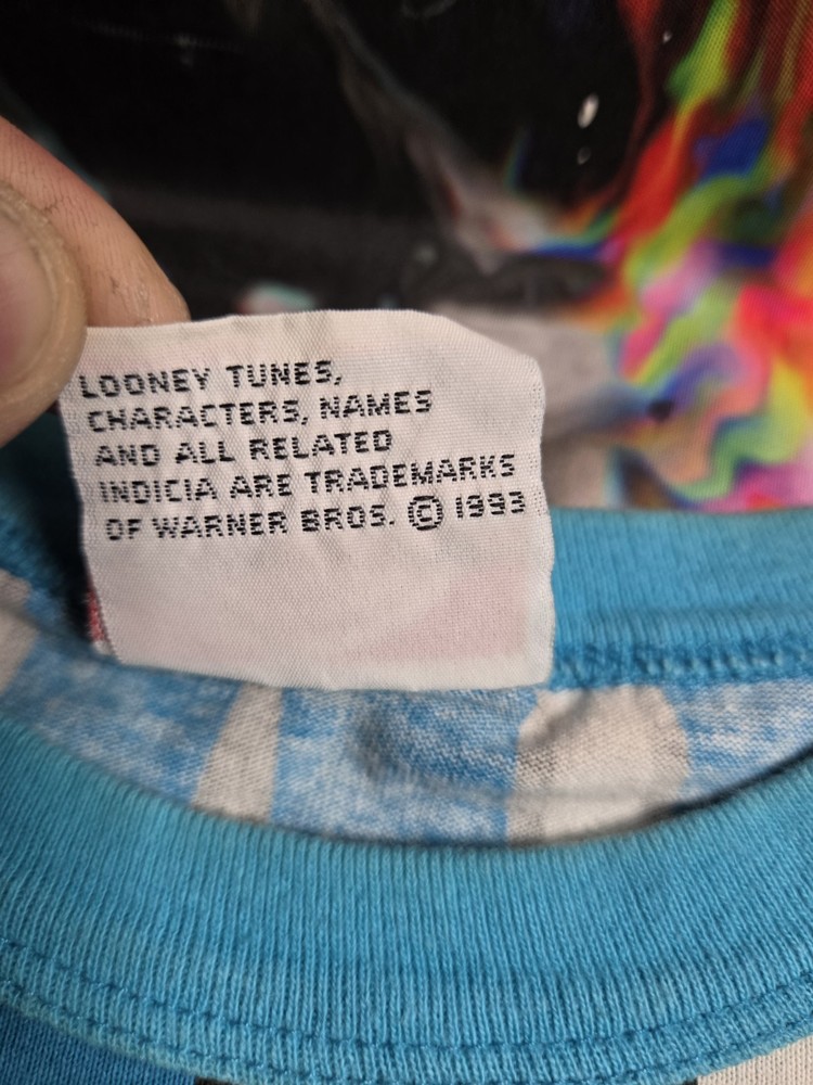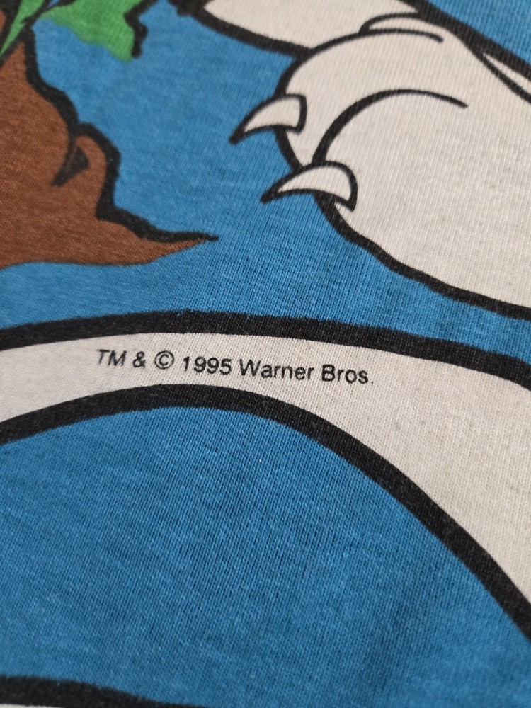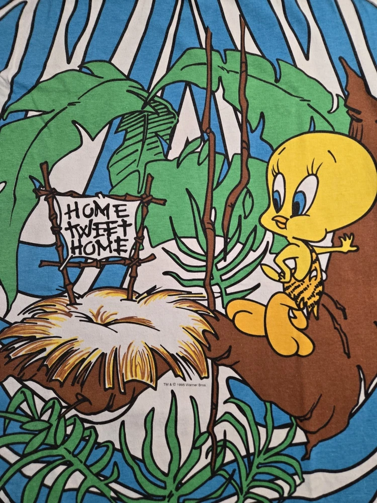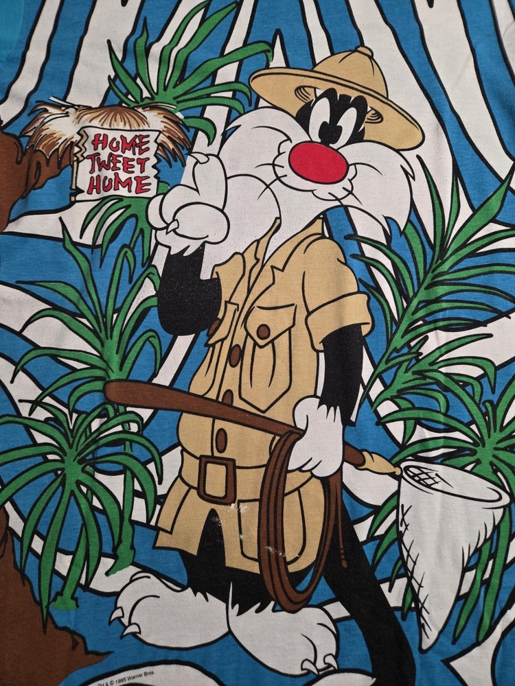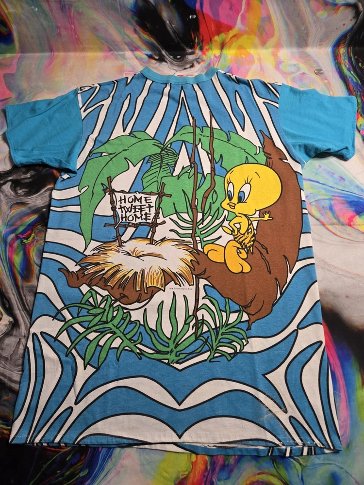 Vintage 1995 Looney Tunes Sylvester & Tweety All-Over Print T-Shirt Vintage 1995 Warner Bros Looney Tunes all-over print tee featuring Sylvester & Tweety in jungle safari scene with “Home Tweet Home” graphic. Bright blue base with bold full-coverage print. Classic 90s cartoon AOP. Officially licensed. No holes; light wear consistent with age. Size: Adult (see measurements) Condition: Good vintage condition Copyright: © 1995 Warner Bros. Price: $175