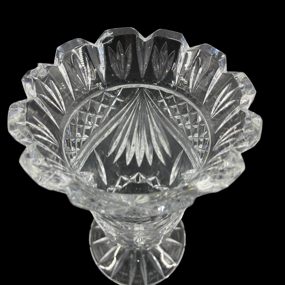Vintage Waterford Crystal 1995 WS Waterford Society Footed Penrose Flower Vase Gorgeous WS Waterford Society vase with castle cut top rim. Acid etched on base. 8 1/2" tall and 5" diameter at top rim.