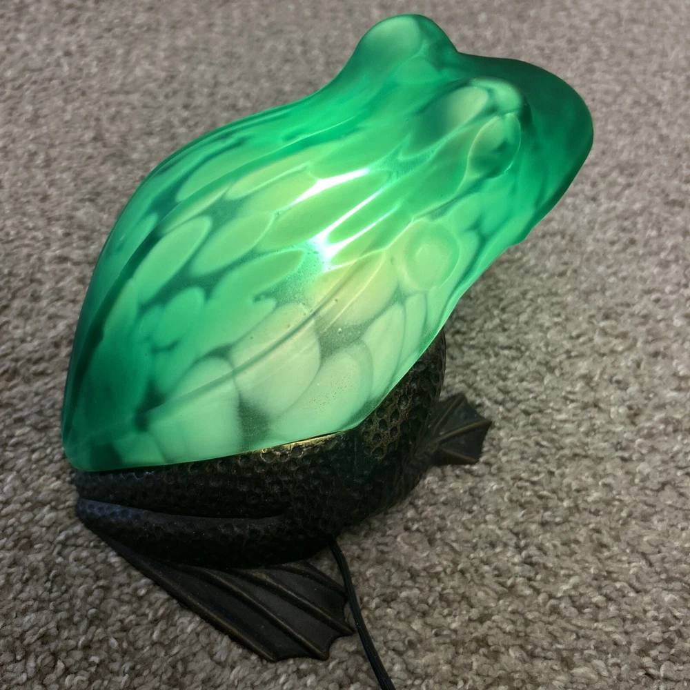 Illuminate your space with a touch of whimsy using the Vintage 1996 C. Sadek Green Glass and Brass Electric Lamp. Perfect as a nightlight or a quirky desk lamp, this charming piece features a novelty design that's sure to spark conversations. Crafted from a combination of glass and solid brass, it exudes an Art Deco style that effortlessly blends with both contemporary and traditional décor. The lamp comes in a rich green hue, complemented by a coordinating black cord, and is ready to be a functional vintage accent in your home. Designed for everyday use, it offers a warm glow with a simple switch control. Ideal for all age groups, this original 1990s creation by Andrea by Sadek is a delightful nod to the past, ready to brighten your nights or add a nostalgic touch to your living space.