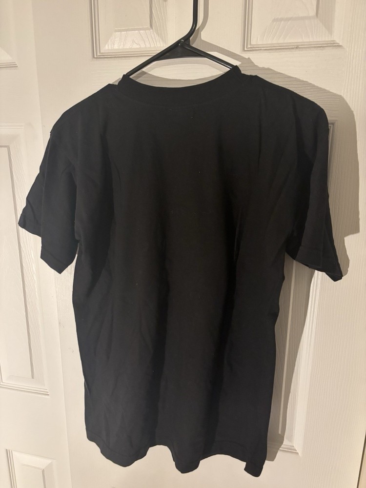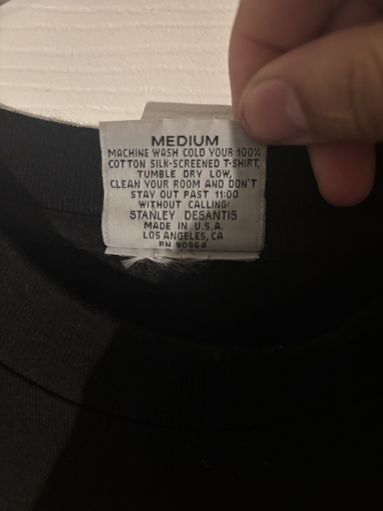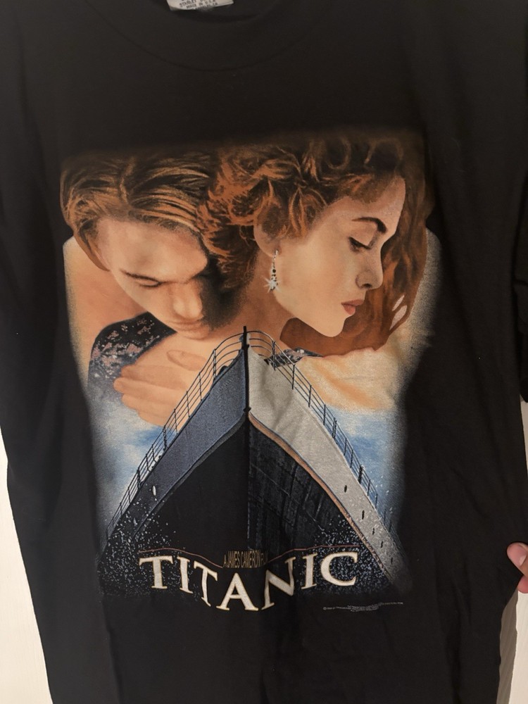 This Vintage 1997 Titanic Movie T-Shirt by Stanley Desantis in size medium is a must-have for any movie enthusiast. Made of comfortable cotton material, this black t-shirt features a crew neck and is perfect for men who appreciate retro fashion. The theme of the shirt is centered around the iconic movie "Titanic," making it a unique and nostalgic piece to add to any wardrobe. Perfect for casual wear or to show off your love for classic cinema.