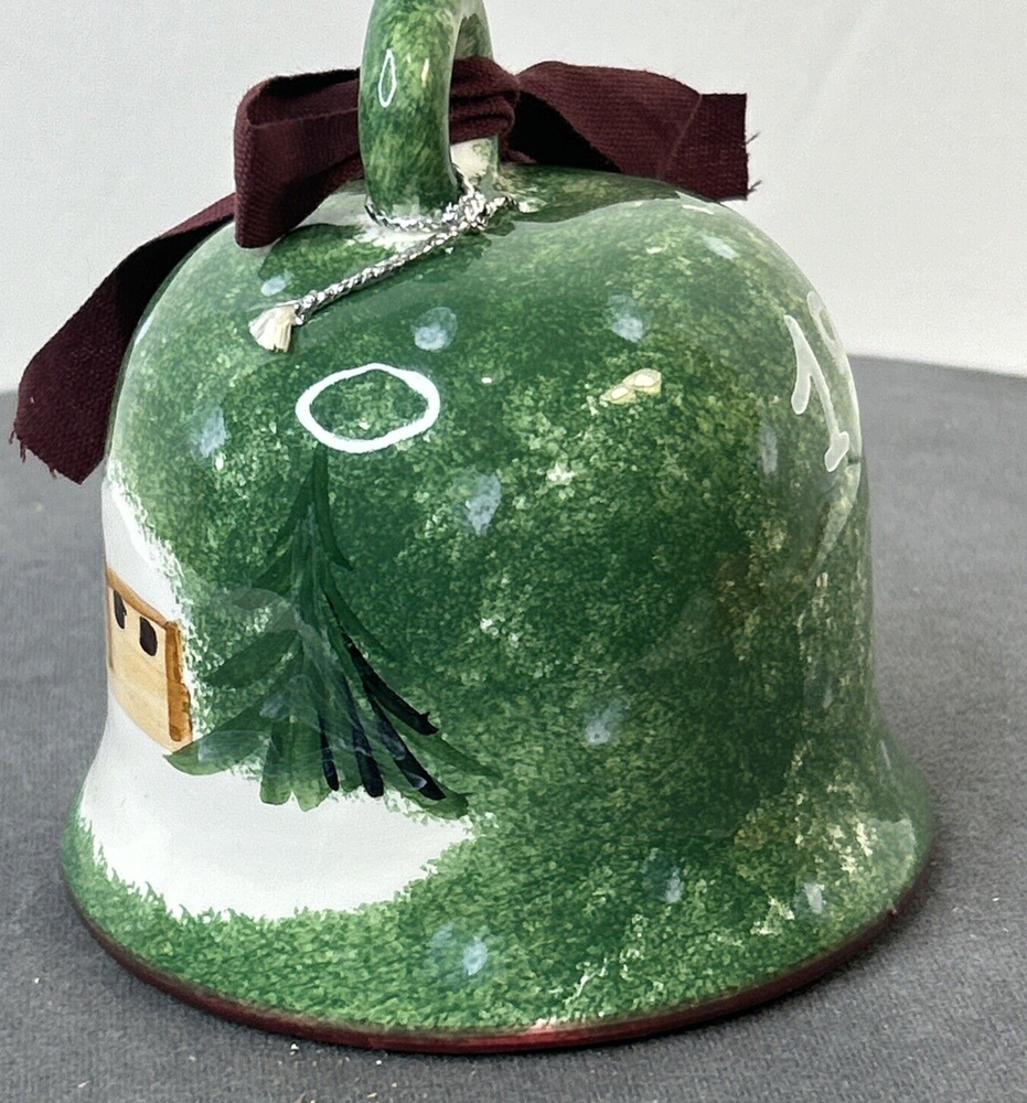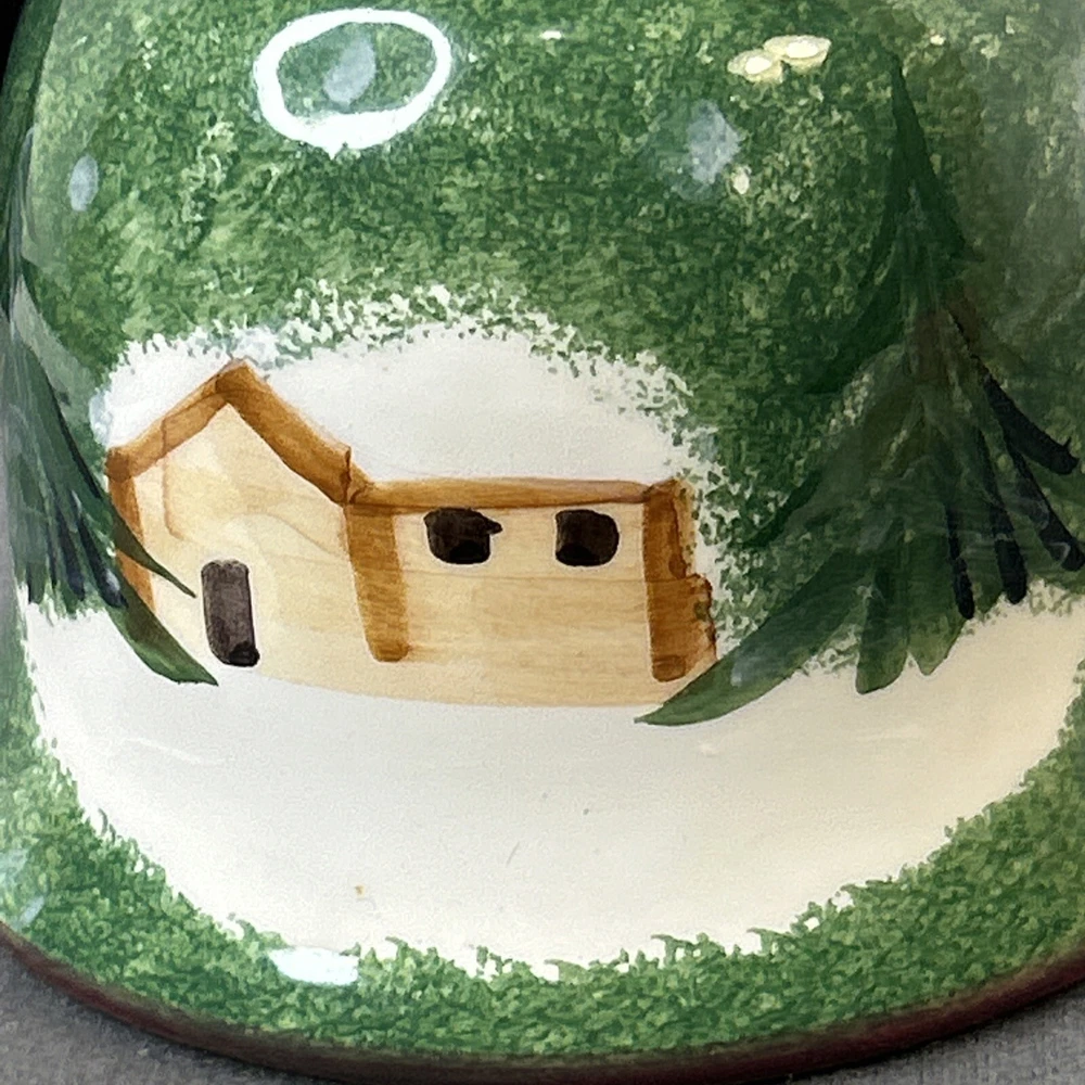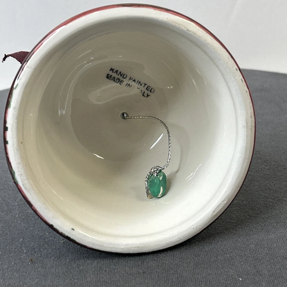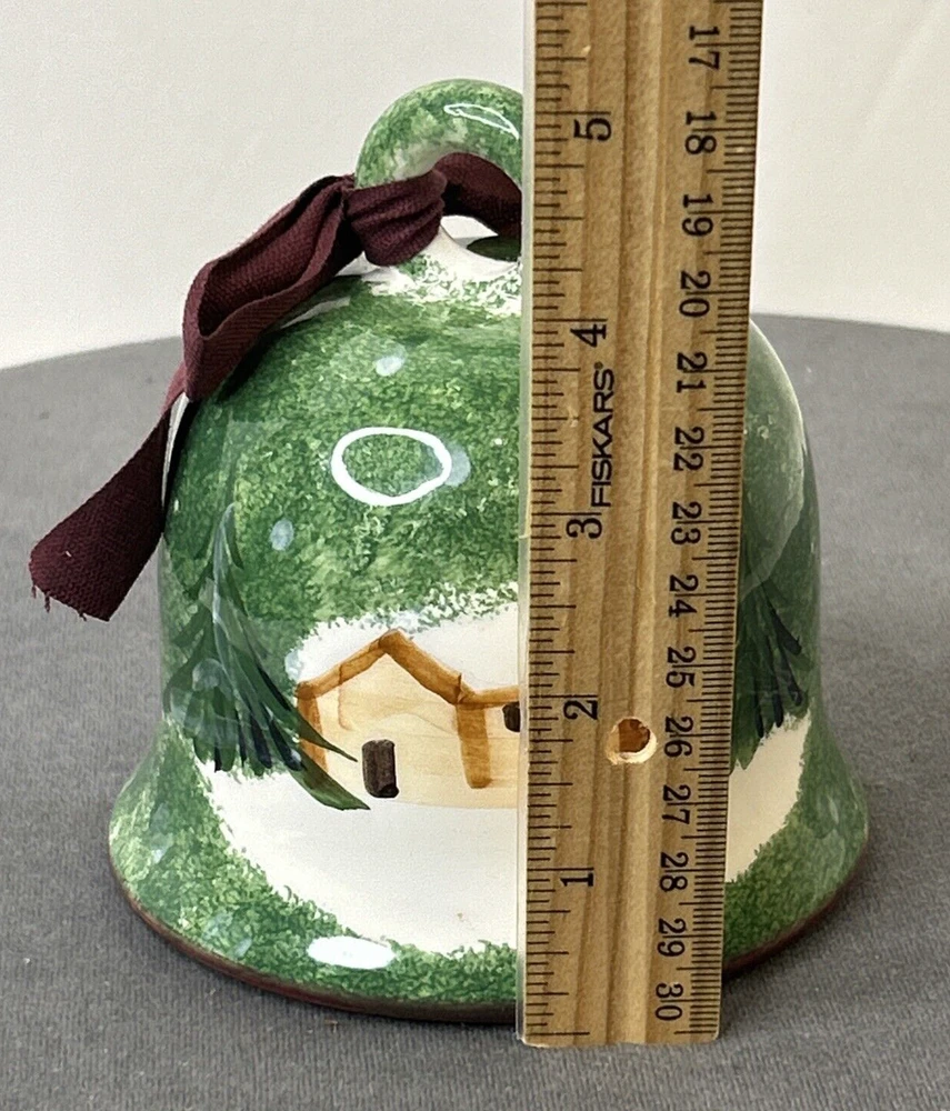 This vintage ceramic bell from Italy is a beautiful addition to any Christmas or winter-themed collection. Hand-painted with intricate details, this bell features a glossy finish and is made with high-quality pottery techniques. The bell is a perfect representation of the art pottery style from the late 20th century. The green color of the bell adds a touch of elegance to the festive décor. The bell is a great gift or souvenir for anyone who loves vintage items or wants to add a unique touch to their holiday decorations. Made in 1998, this bell is a true collector's item that will bring joy for years to come. Vintage Christmas Hand Painted Ceramic Bell Made In Italy 1998, is in excellent vintage pre-owned condition, with NO chips, cracks or repairs. Please review all pictures for proper assessment of its excellent vintage pre-owned condition.