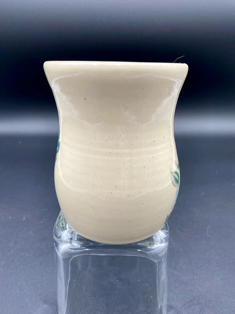 This beautiful vintage mug from Kovack Pottery features a hand-painted Hummingbird and Flowers design on either side of the mug. The delicate blue blossoms are contrasted with the green, deep teal and orange of the hummingbird and leaves. The mug is made of glossy stoneware and has a good-sized sculpted handle. It weighs 12 ounces and measures 4 inches in height and 3.25 inches in diameter. With the handle, the mug measures 5 inches across. This unique piece of art pottery was signed by Kovack CSK in 1998 and has an incised backstamp indicating that it was made for the 5th Annual Spring Festival and was number 72 out of 120. It is an original and handmade item that can be used for all occasions. The mug is in excellent condition. There are no chips, cracks or signs of wear.