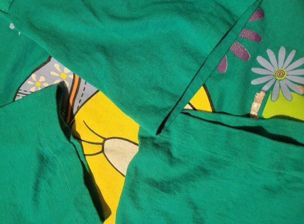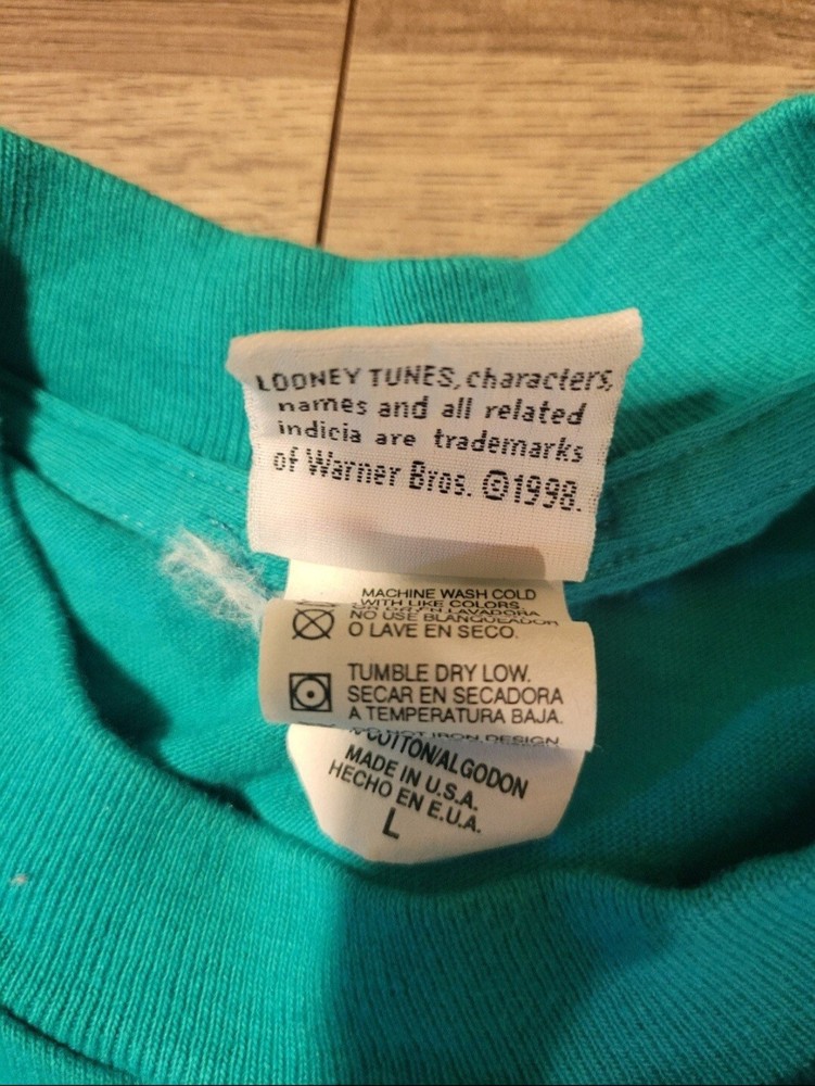 Vintage 1998 Looney Tunes Tweety Bird Spoil Me shirt. Huge print across front and sleeves. Single stitched. Tealish green colored shirt. Size Large, measures approx 20" chest x 28" length. Please use measurements provided for approximate size. Has a small pinhole near collar, see picture.