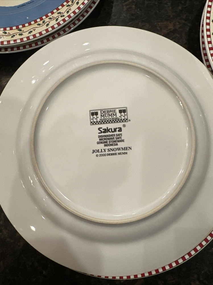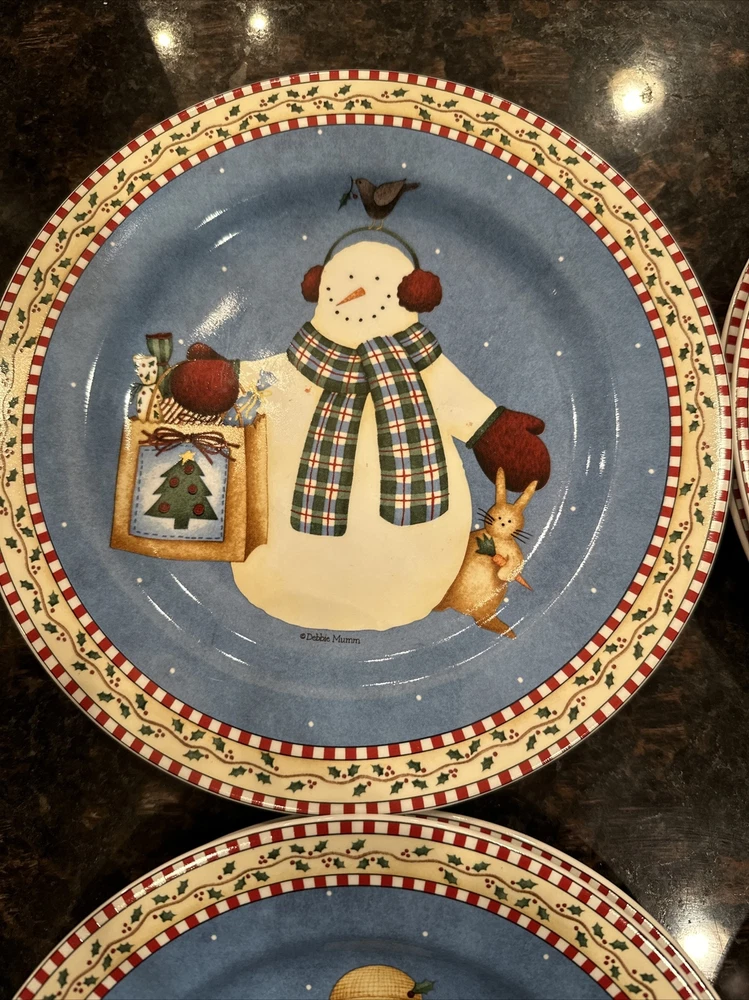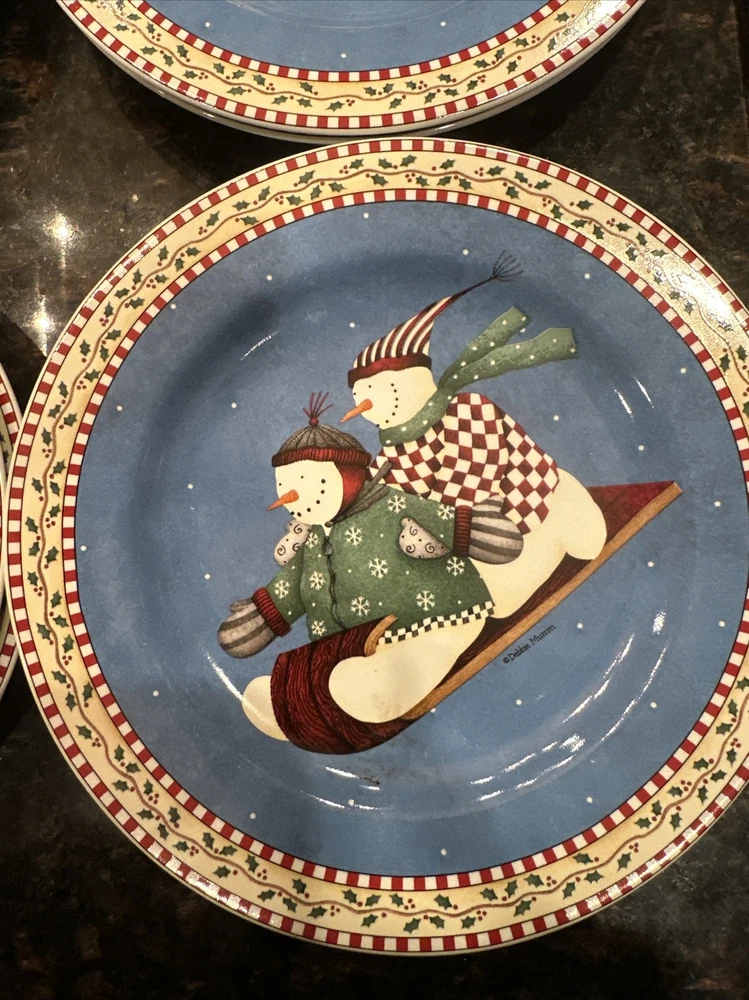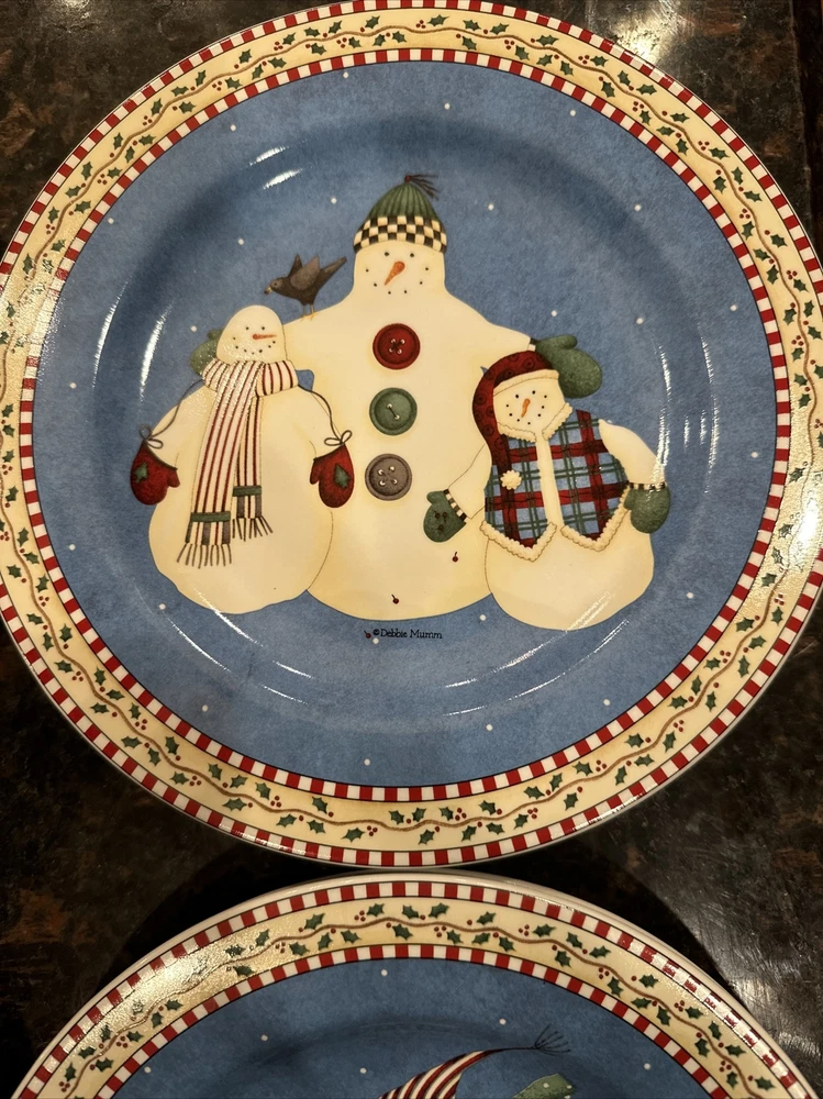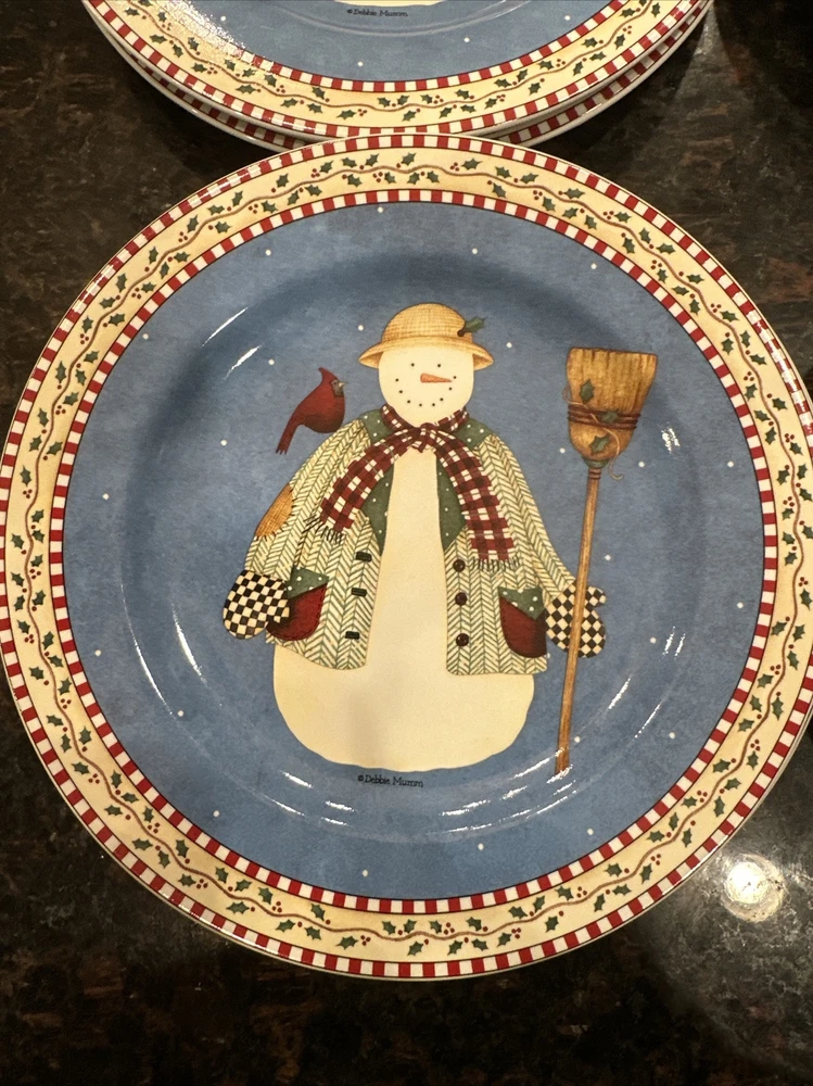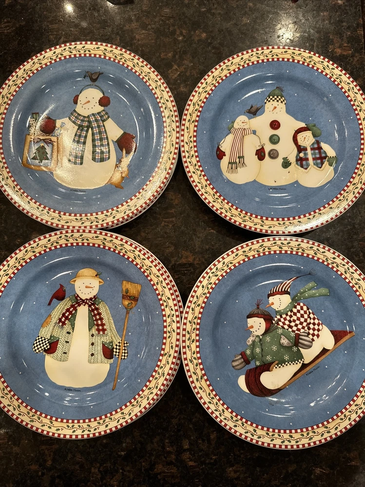 Vintage 2000 Jolly Snowmen Debbie Mumm Sakura Set of 4 Luncheon Salad Plates. Condition is Used. Shipped with USPS Ground Advantage.