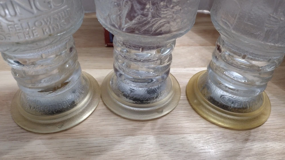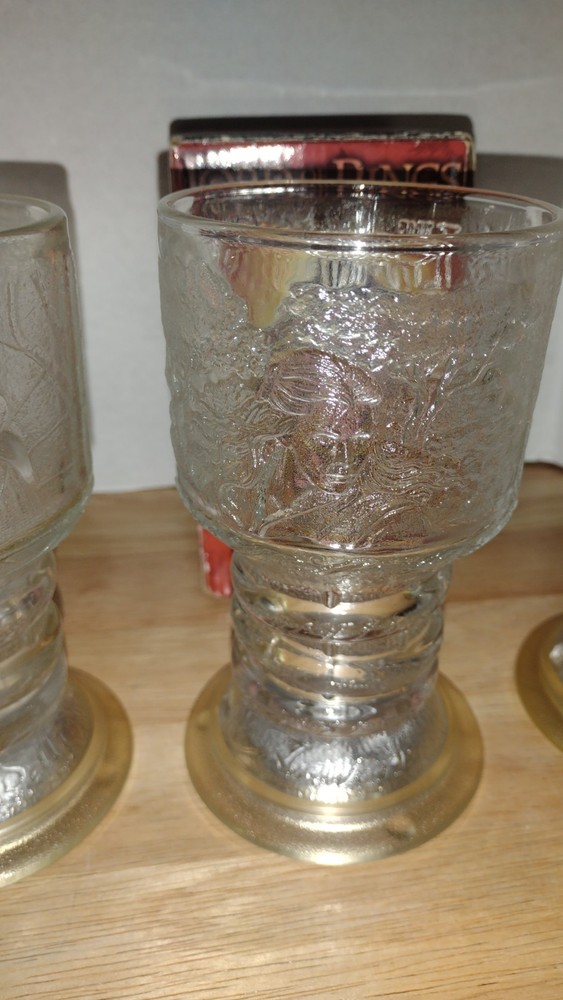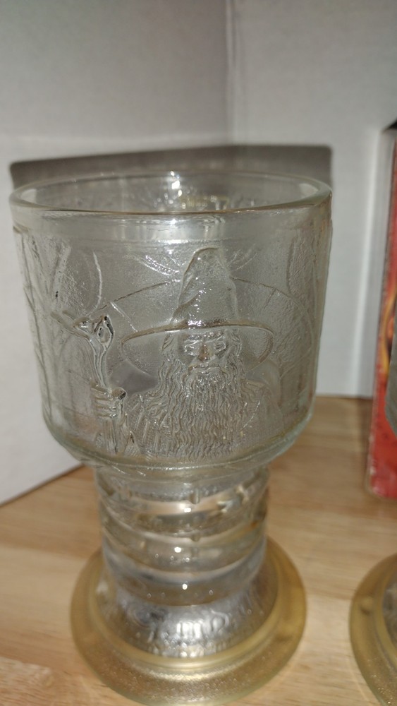 Three Lord of the rings vintage Burger King glass goblets. One still has the box includes two Gandalf and one of Awen the elf. All of these will need batteries and I am unsure if they even still light up but they are still very cool and collectible offers welcome any questions or concerns please ask.