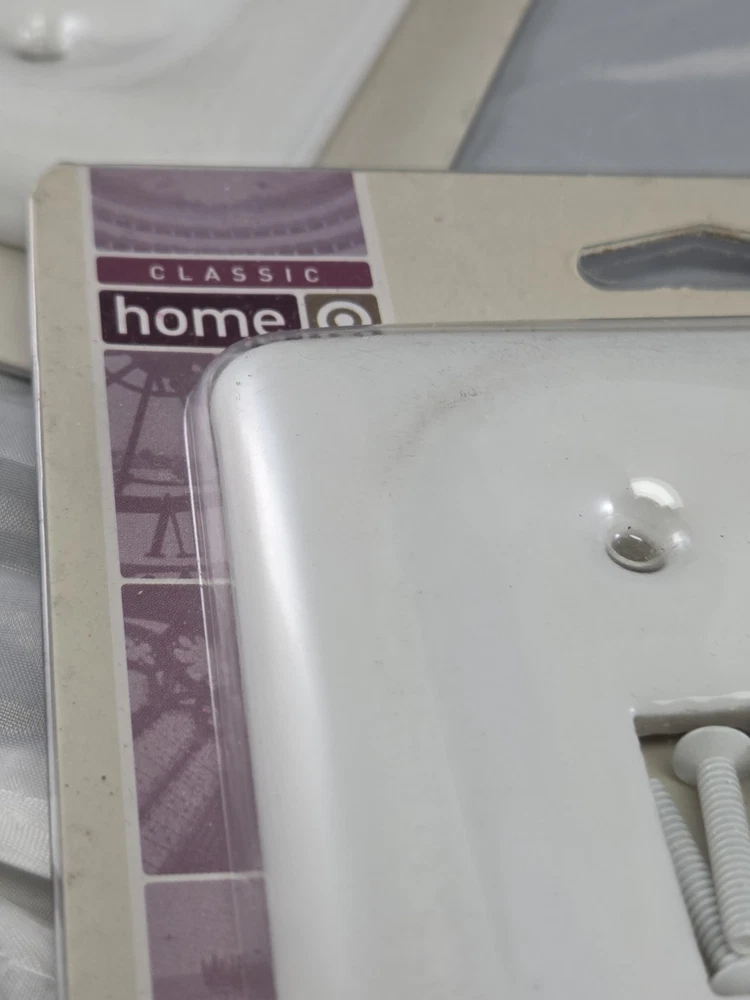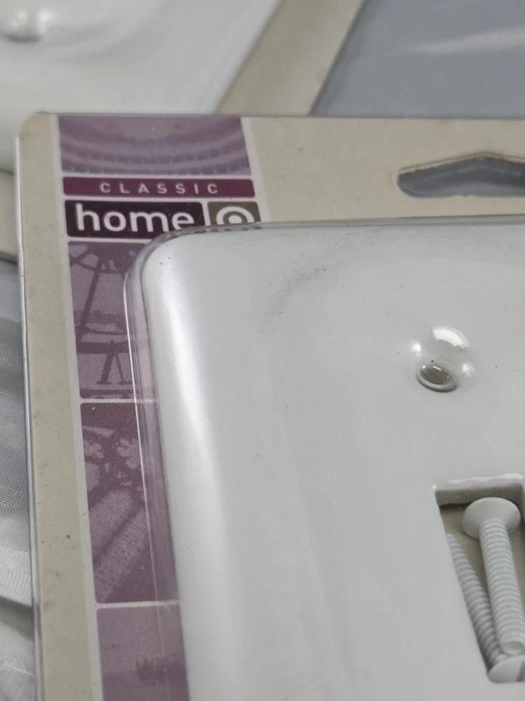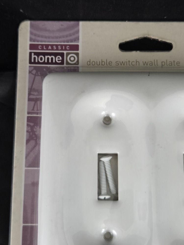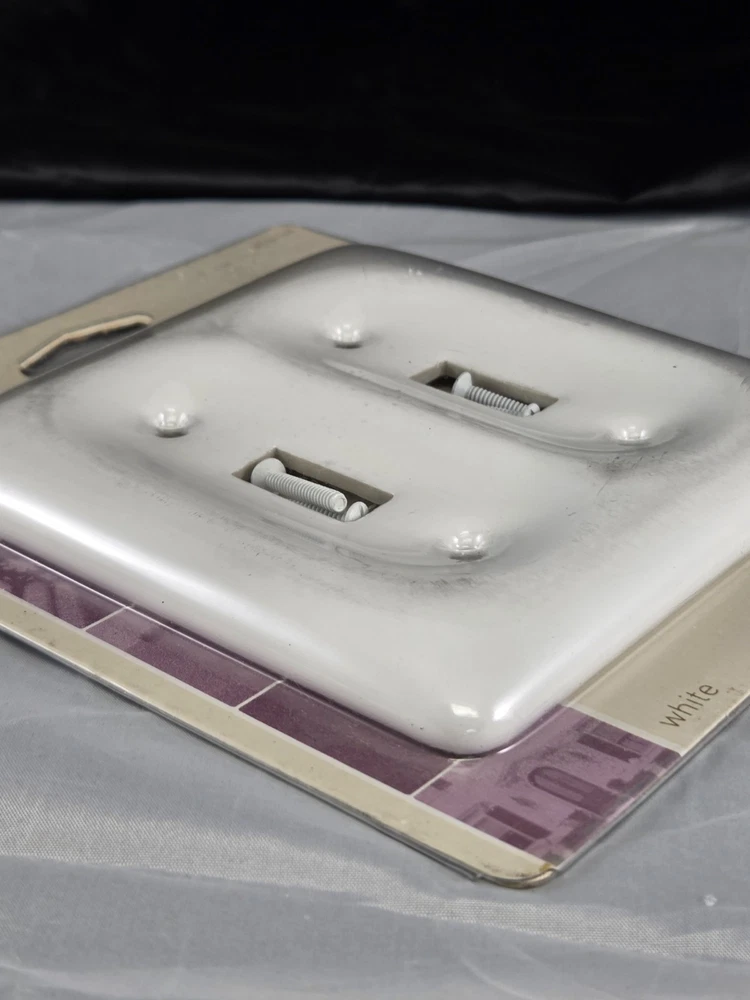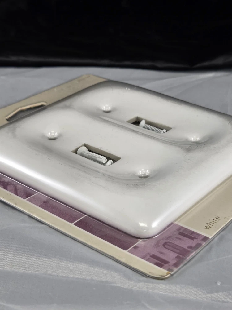 The Vintage Classic Home Heavy White Porcelain Double Switch Plate is a stylish and durable wall plate designed for interior use. Made of ceramic with a glossy finish, this 2005 original pack features a vintage decorator/rocker switch style with a square box shape. Suitable for any room, this plate is perfect for light control and adds a touch of elegance to your home décor. With a mounting style of screws and an operation method of on/off, this switch plate is a practical and decorative choice for your electrical outlets.