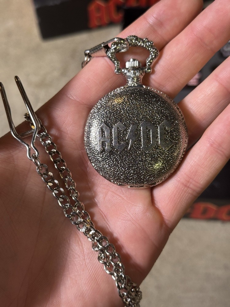 The vintage 2007 AC/DC pocket watch, keychain, and wallet set features a quartz movement and a classic design perfect for casual wear. The pocket watch has a 12-hour dial and is in the style of the iconic rock band AC/DC, making it a unique and stylish accessory. With its analog display and unisex appeal, this set is sure to be a standout piece for any AC/DC fan or watch enthusiast looking to add some rock 'n' roll flair to their collection.