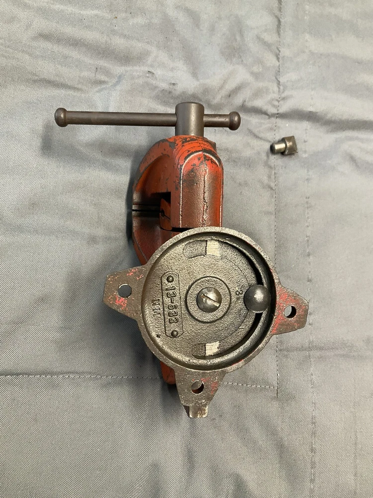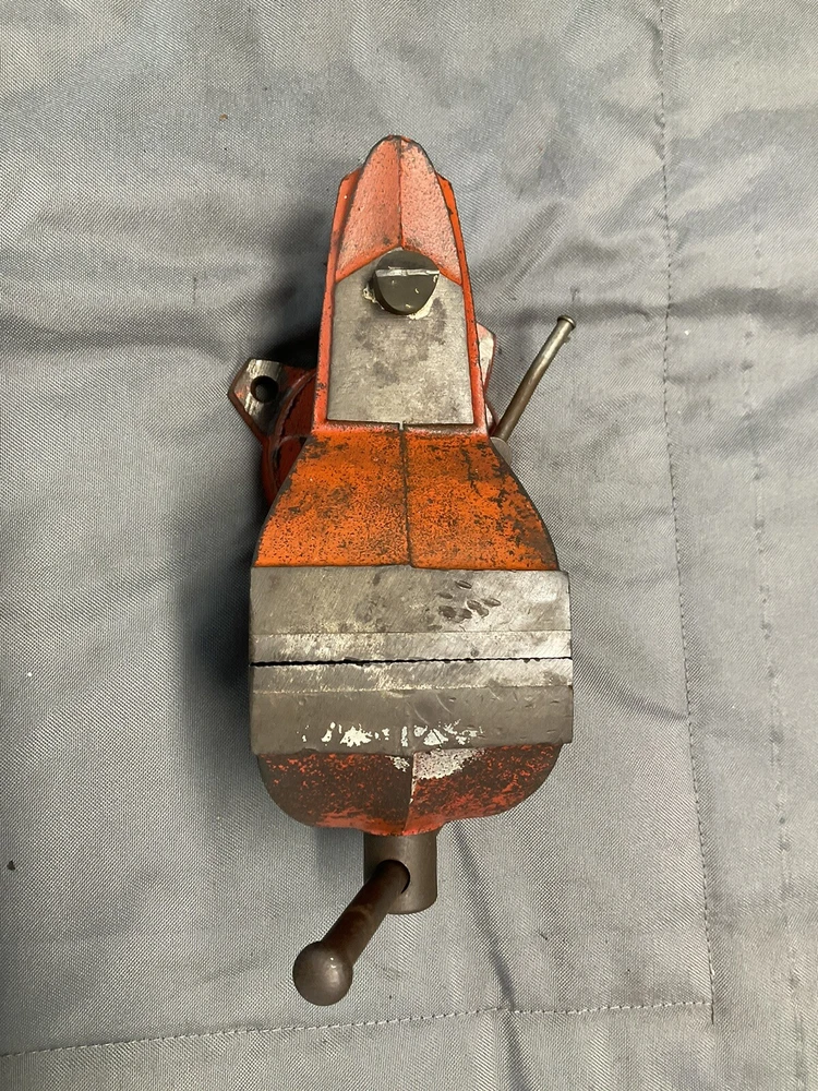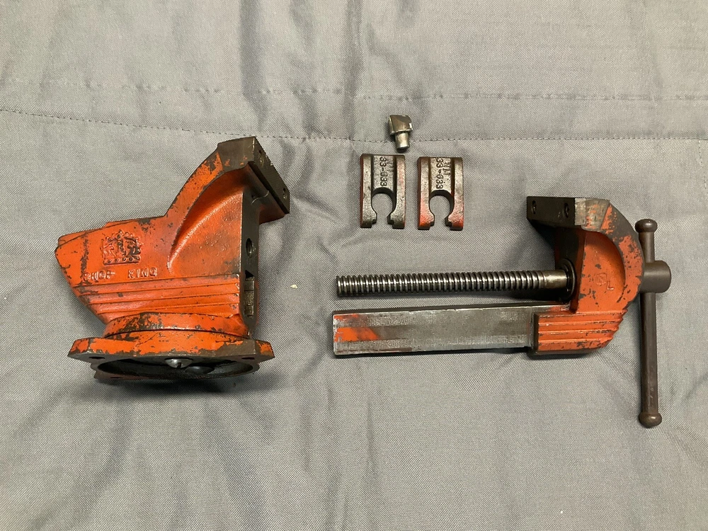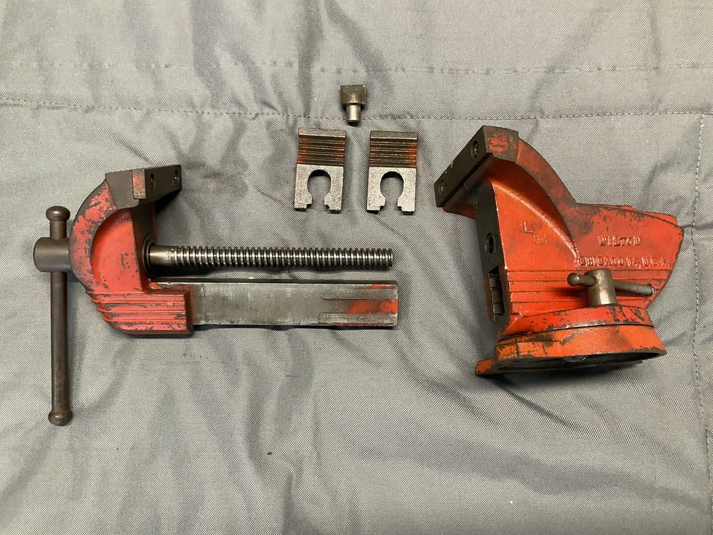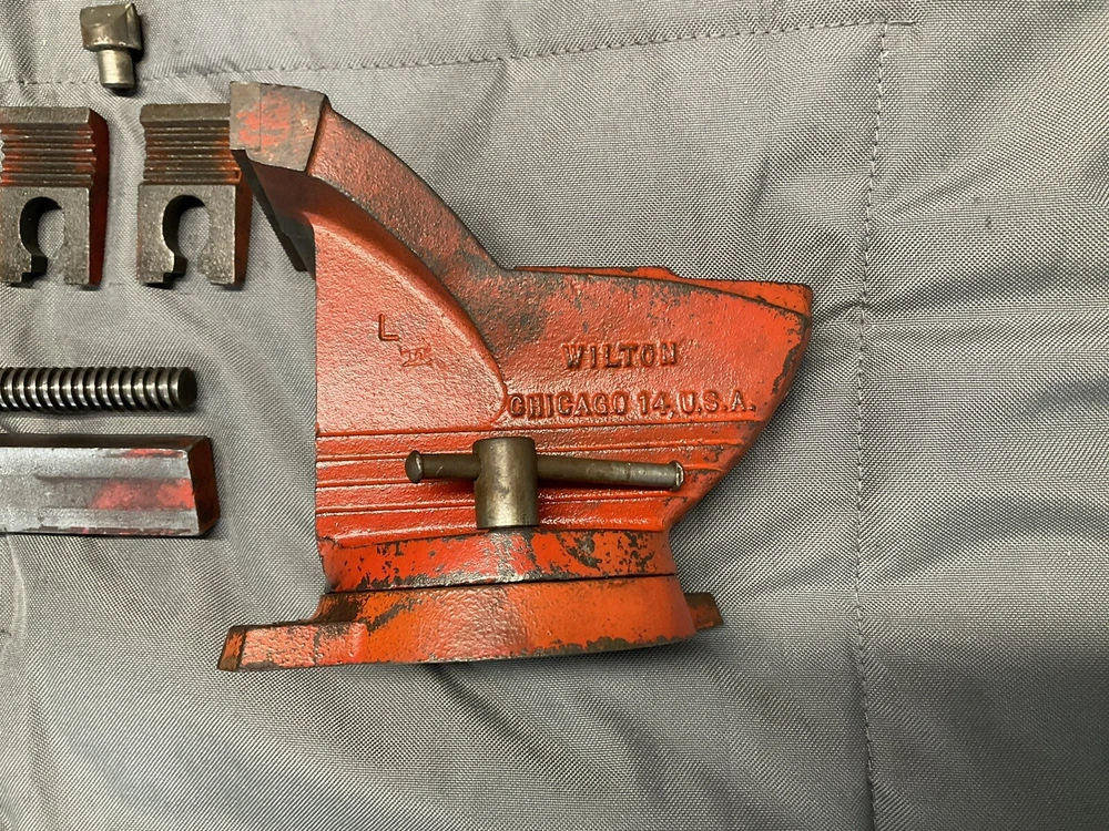 A vintage Wilton Shop King 3 1/2" bench vise with the shaping tool on the anvil (this is usually missing). The paint is worn, but there are no apparent chips, cracks, cuts, etc., just some ordinary wear. The handle is straight and opens and closes the jaws smoothly. It swivels as it should and locks in place firmly. The jaws are in good shape. When closed there is a slight gap on one side, which seems to decrease as it is tightened, as seen in picture. Holds material just fine. Made in the 1950s and will probably last another century or two. Weighs 16 lbs.