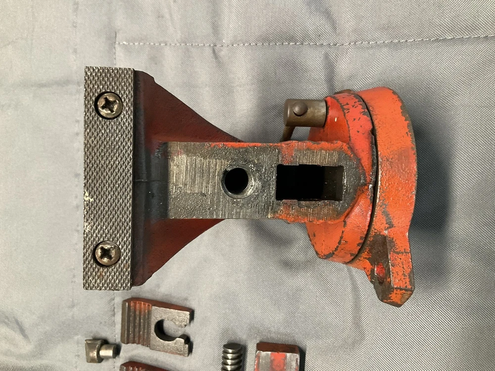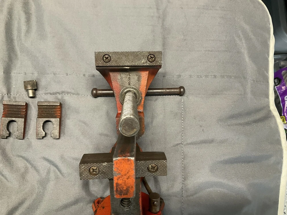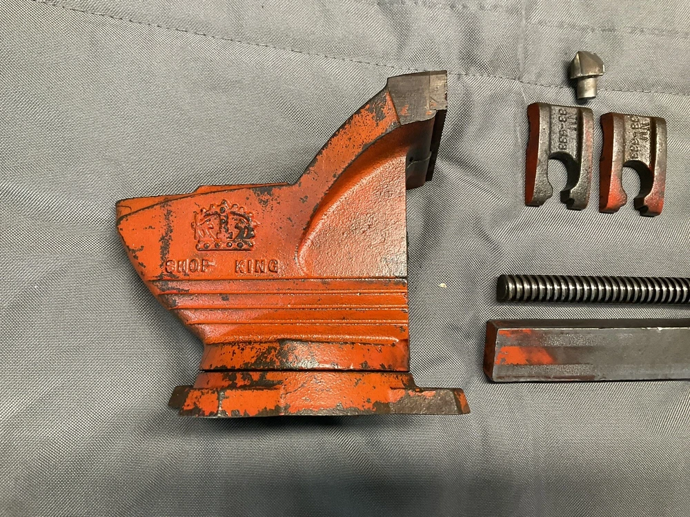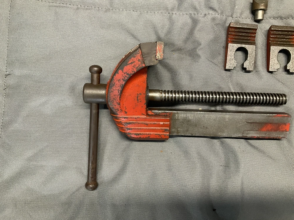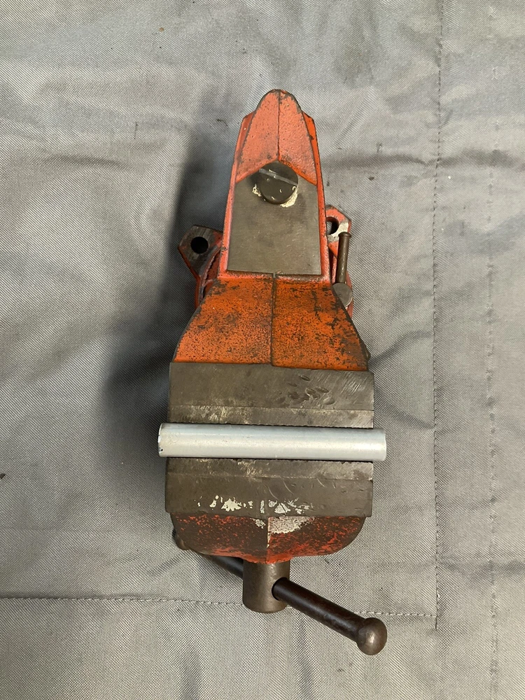 A vintage Wilton Shop King 3 1/2" bench vise with the shaping tool on the anvil (this is usually missing). The paint is worn, but there are no apparent chips, cracks, cuts, etc., just some ordinary wear. The handle is straight and opens and closes the jaws smoothly. It swivels as it should and locks in place firmly. The jaws are in good shape. When closed there is a slight gap on one side, which seems to decrease as it is tightened, as seen in picture. Holds material just fine. Made in the 1950s and will probably last another century or two. Weighs 16 lbs.