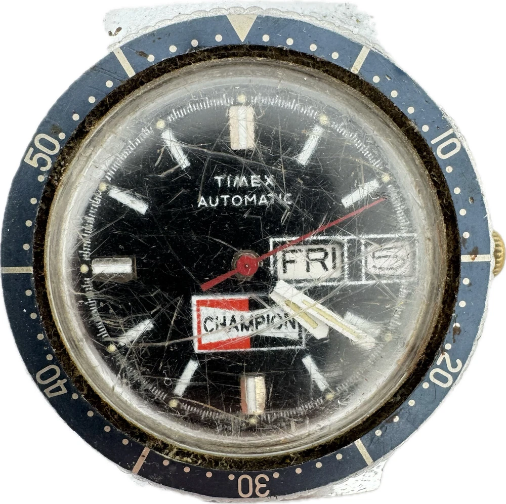 Vintage 38mm Timex Champion Spark Plugs Men's Automatic Wristwatch for Repair Product Description Item: Wristwatch Brand: Timex Model: Champion Spark Plugs Movement: Automatic Case Material: Stainless Steel and Chrome Gender: Men's Size: 38mm Product Measurements Diameter: 38mm Lug Width: 18mm Tip to Tip of Lugs: 41mm Product Condition Poor, overall condition for its age. Not running as it is for parts. There is plating wear through and scratches on the case. There are scratches on the crystal. There are scratches on the dial.