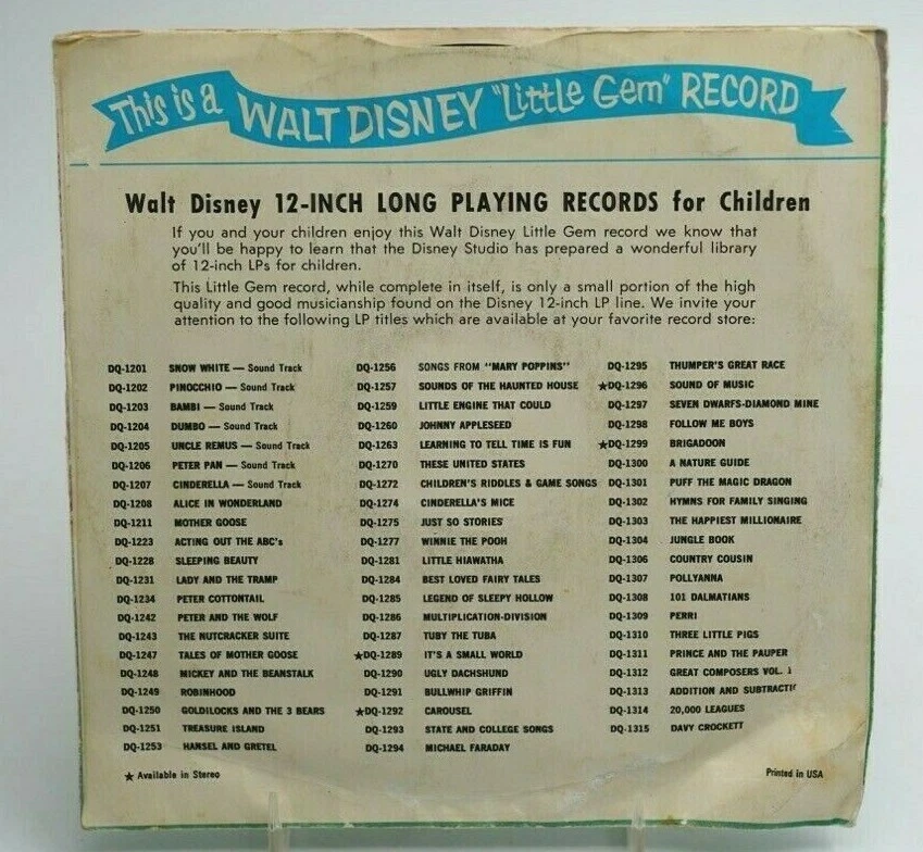 Genre:Musicals DisneySoundtrack Songs Records:Singles with sleevesType:SingleRecord Label:sides numbered, 1 side has circular pen marksRecord Size:7"Speed:45RPMCountry/Region of Manufacture:United StatesRecord Tested: No Skipping:Retro Vtg Vintage, Vinyl Collectible RareRecord Grading:Plays Well, scratches, fingerprintsRare vinyl Single Records 7":Disneyland Records, Walt Disney Little Gem Record