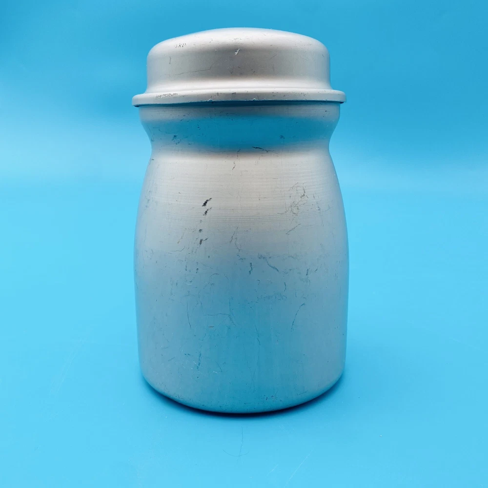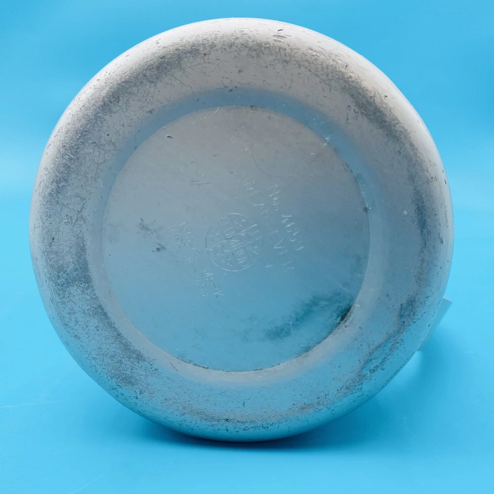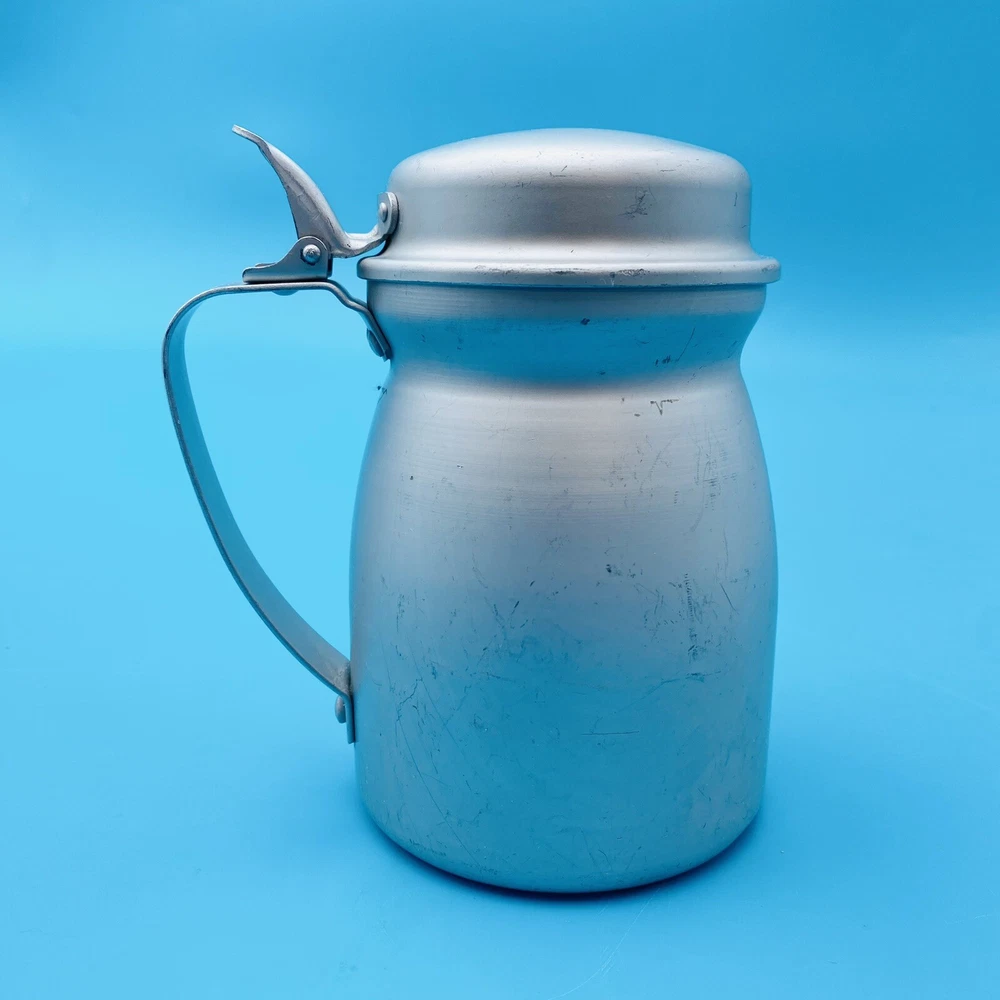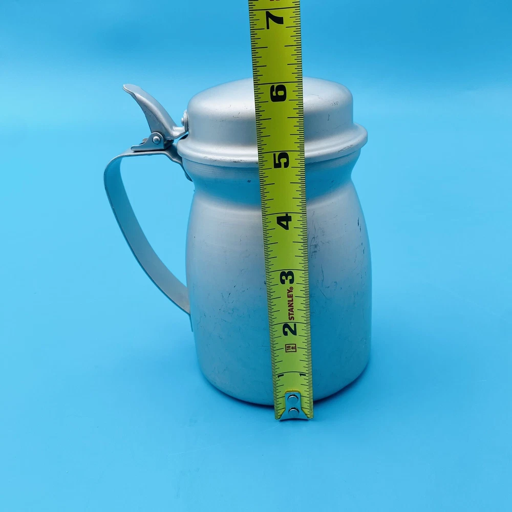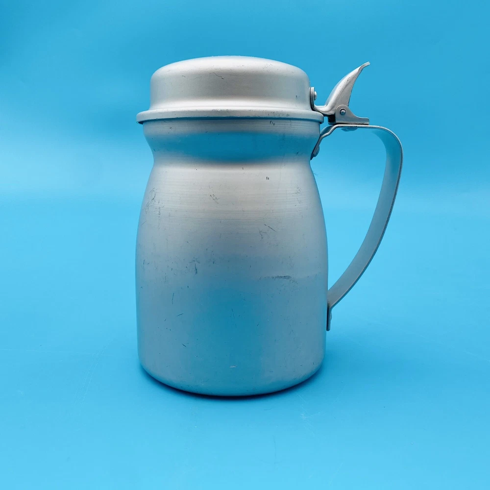 This vintage molasses dispenser pitcher is a unique addition to any collection. Made in the United States by Wear Ever, it is crafted from durable aluminum that ensures long-lasting use. The object type is a molasses dispenser, perfect for those who love to add a touch of vintage charm to their kitchen. The brand is well-known for its quality products, making this a reliable item for collectors and enthusiasts alike. The material is aluminum, which adds to its durability and longevity. This item is perfect for those who appreciate vintage metalware and want to add a touch of history to their collection. This is all Aluminum container. Spring is wore out/ broke.