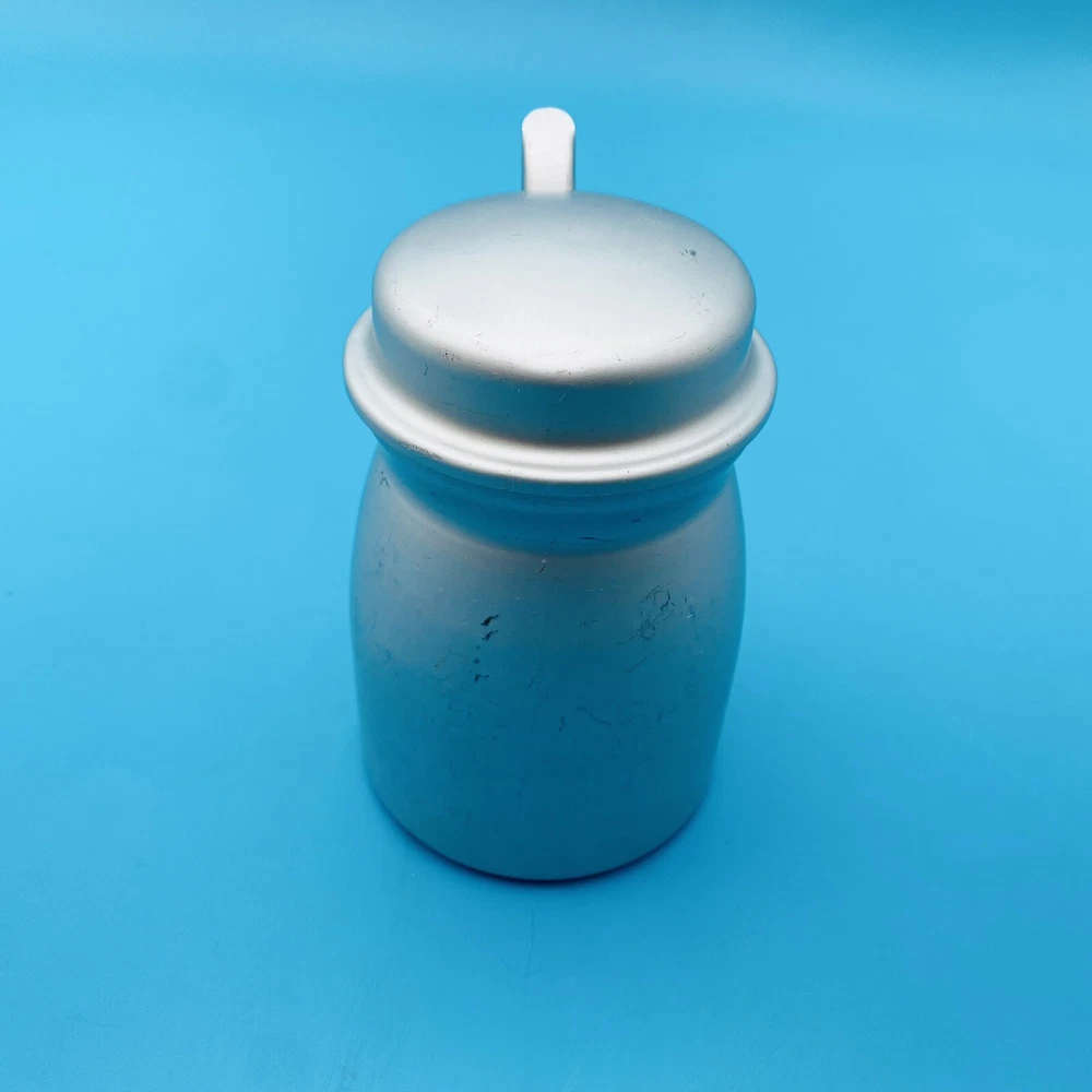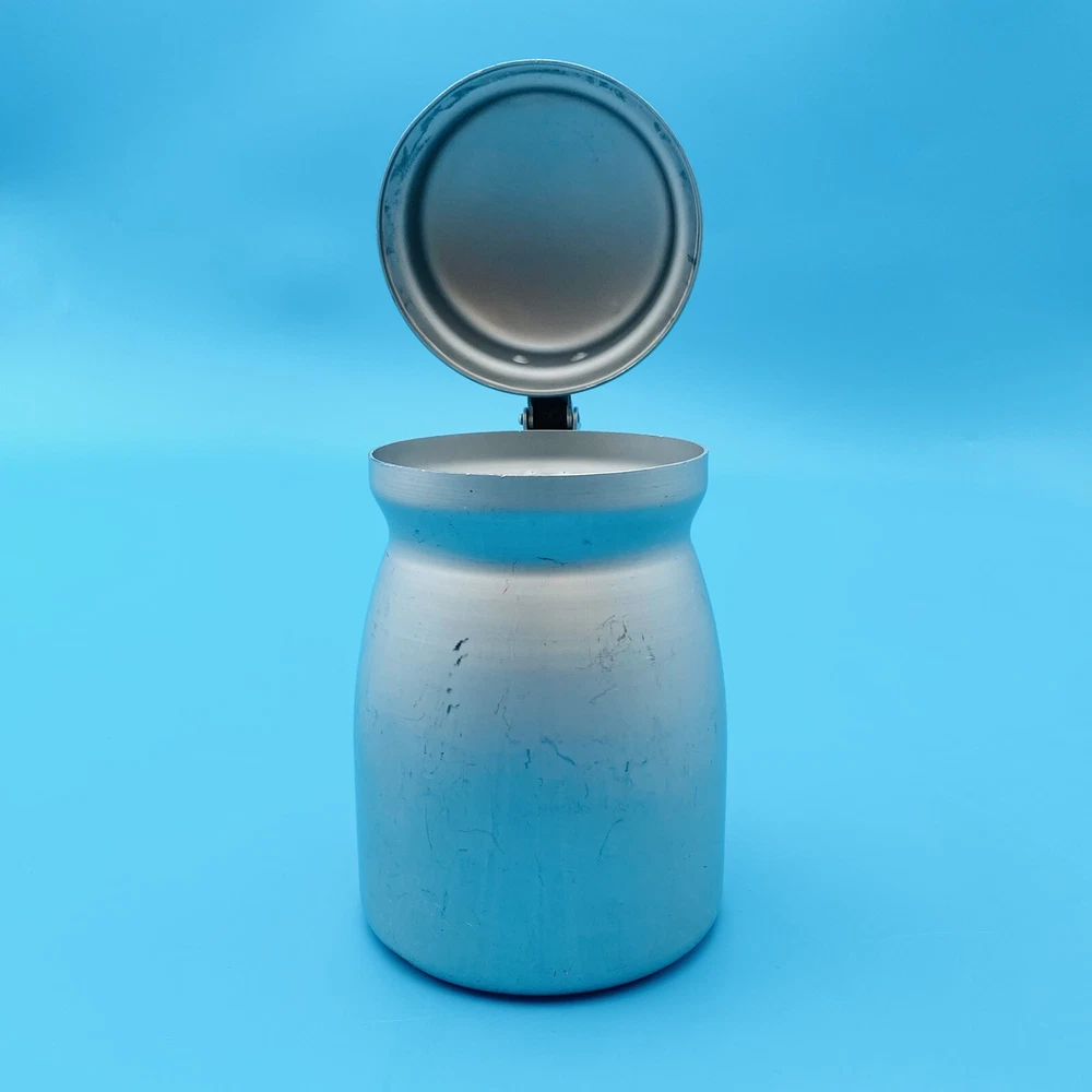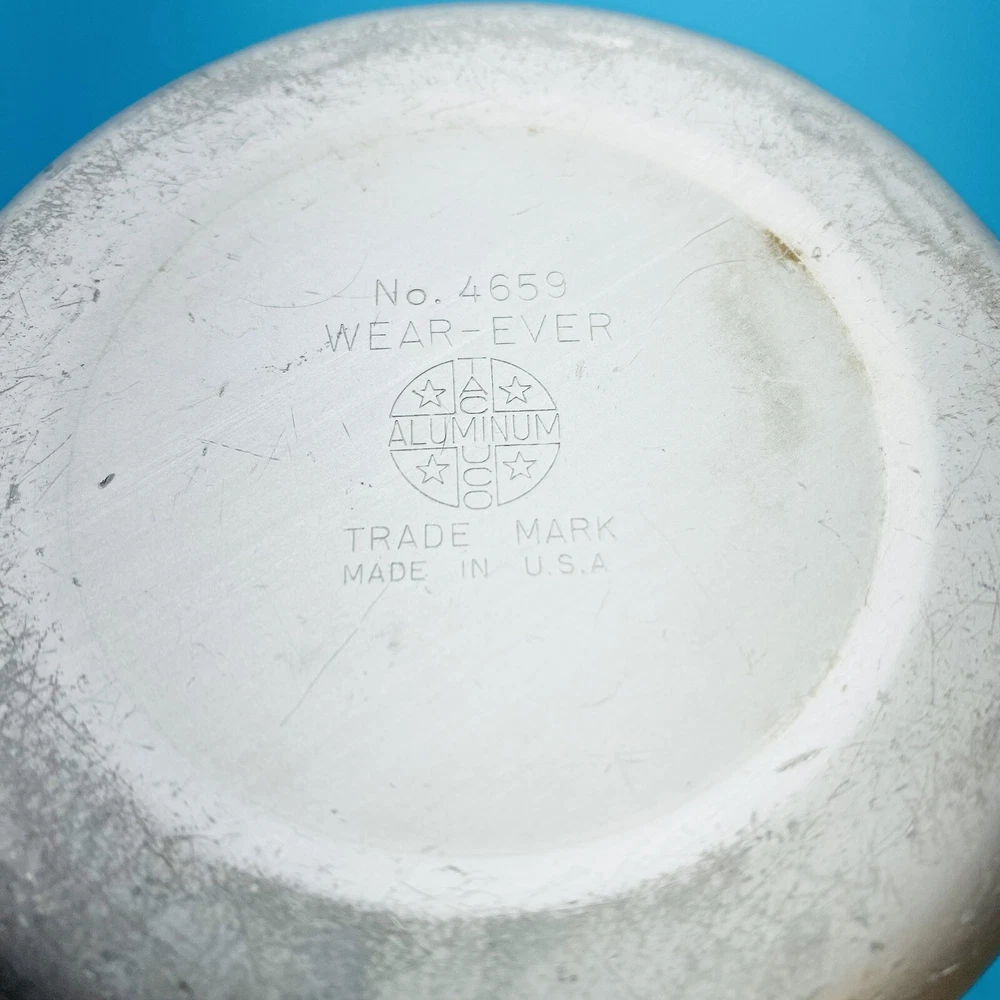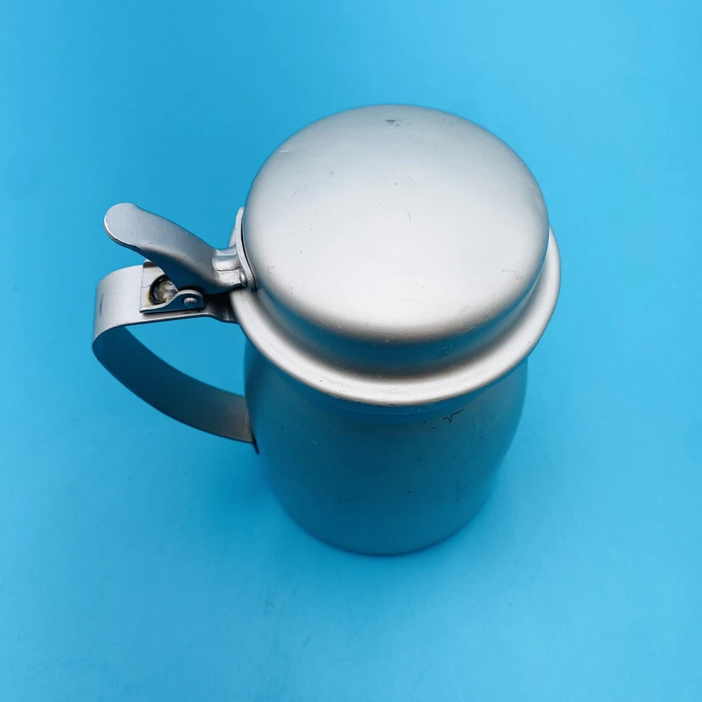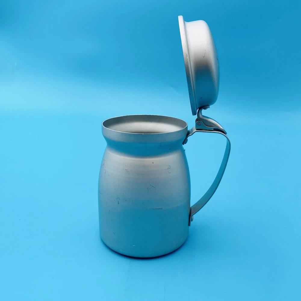 This vintage molasses dispenser pitcher is a unique addition to any collection. Made in the United States by Wear Ever, it is crafted from durable aluminum that ensures long-lasting use. The object type is a molasses dispenser, perfect for those who love to add a touch of vintage charm to their kitchen. The brand is well-known for its quality products, making this a reliable item for collectors and enthusiasts alike. The material is aluminum, which adds to its durability and longevity. This item is perfect for those who appreciate vintage metalware and want to add a touch of history to their collection. This is all Aluminum container. Spring is wore out/ broke.