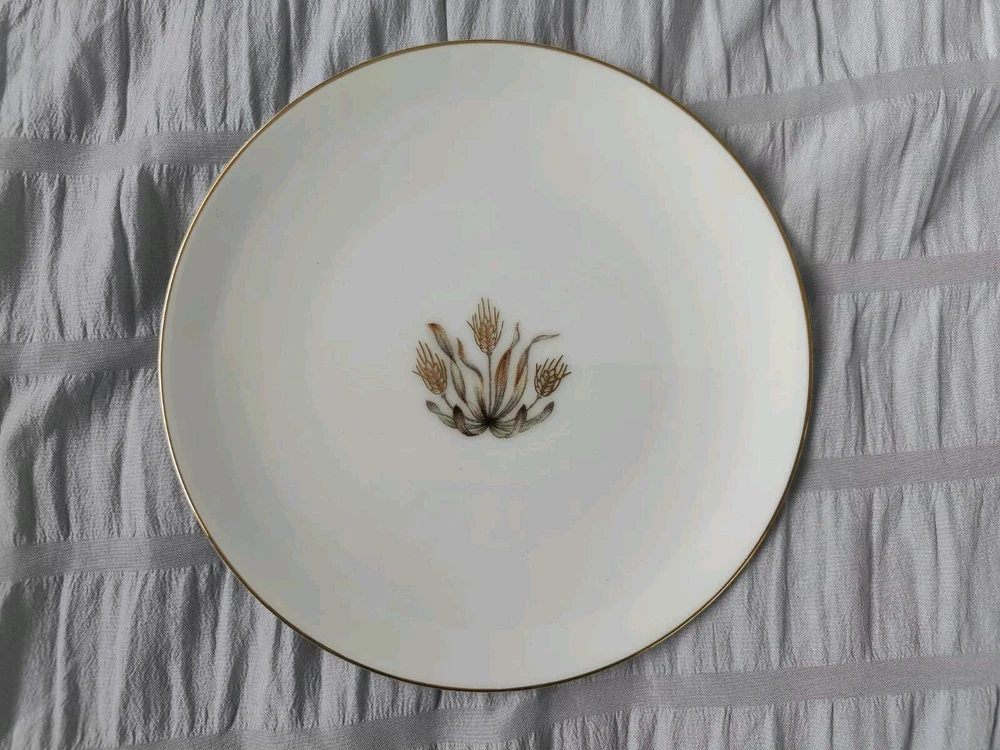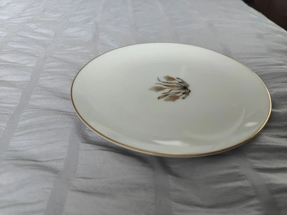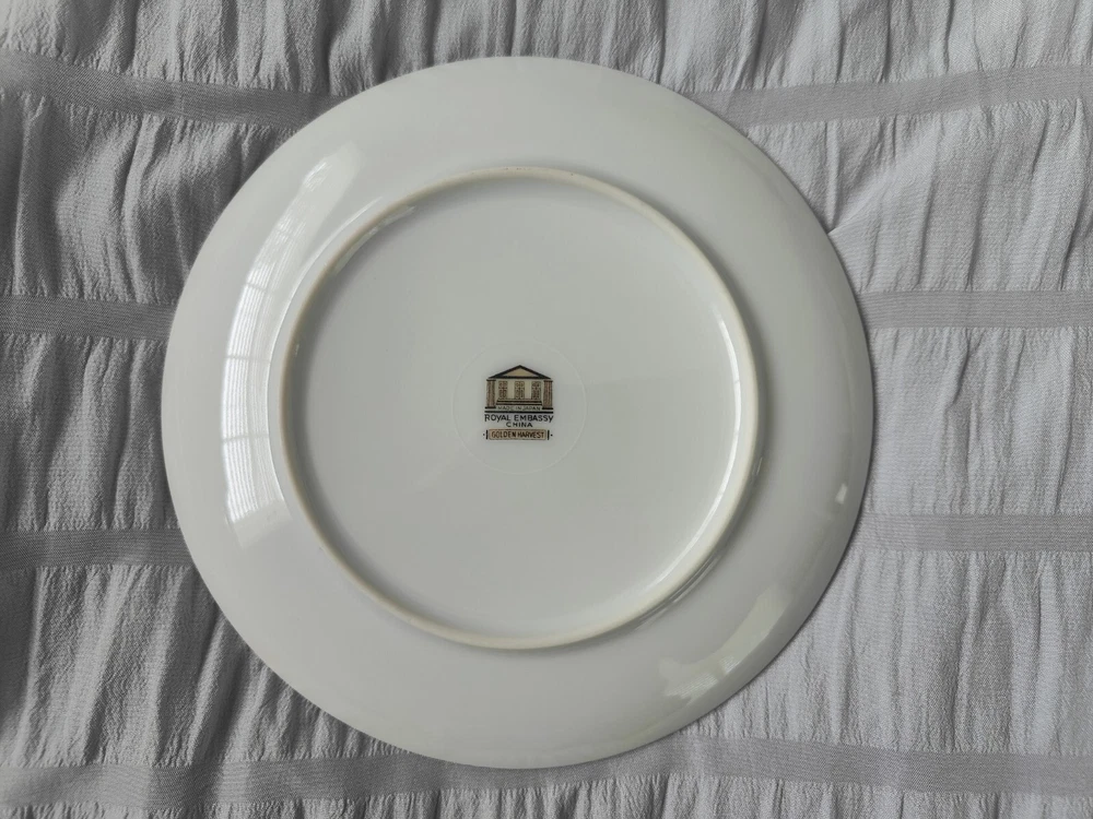 Vintage 6.75" Royal Embassy Golden Harvest Salad Plate Gold Trim Made in Japan This plate made in the1940s is in excellent barely used condition! There are no chips, cracks orbreaks. The gold trim and accents are in near perfect condition and not worn.This would definitely be worthy of display or as an addition it to yourexisting collection. This listing comes froma smoke free environment. Please look at thepictures as they are a part of the description as well. Also selling severalother pieces. I would be willing to combine shipping and negotiate on theprice of more pieces, if desired. Please ask if you have any questions.