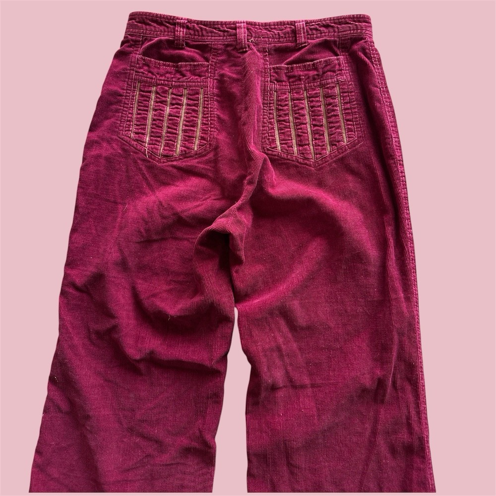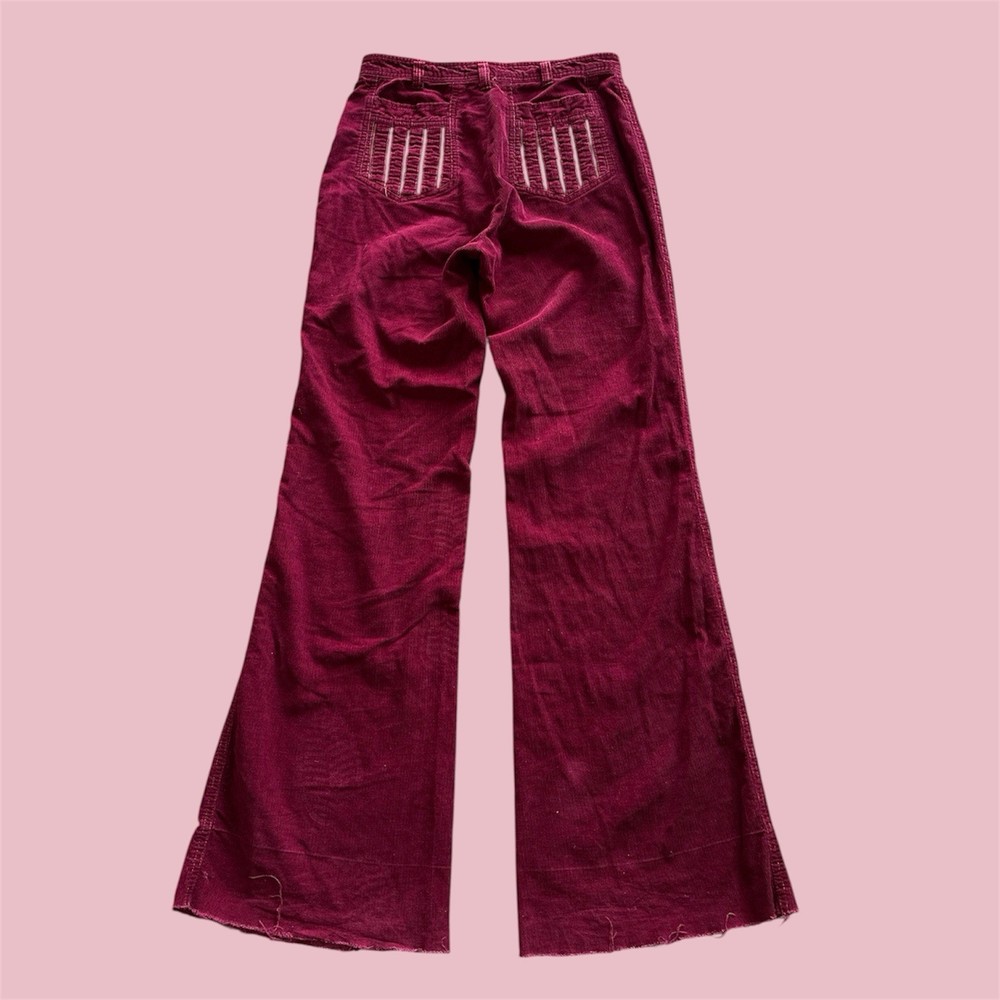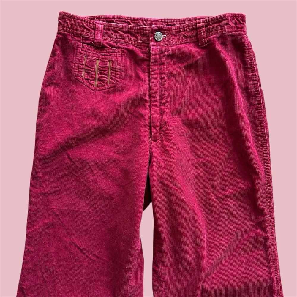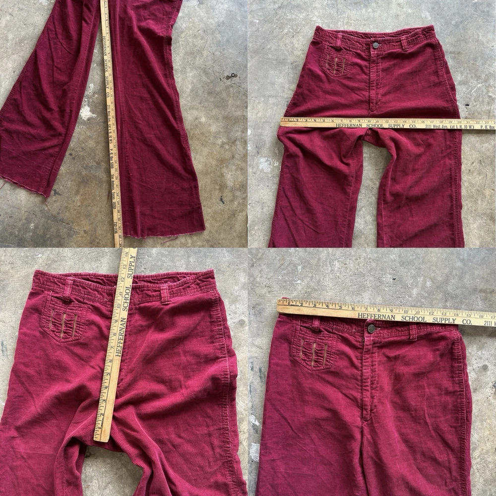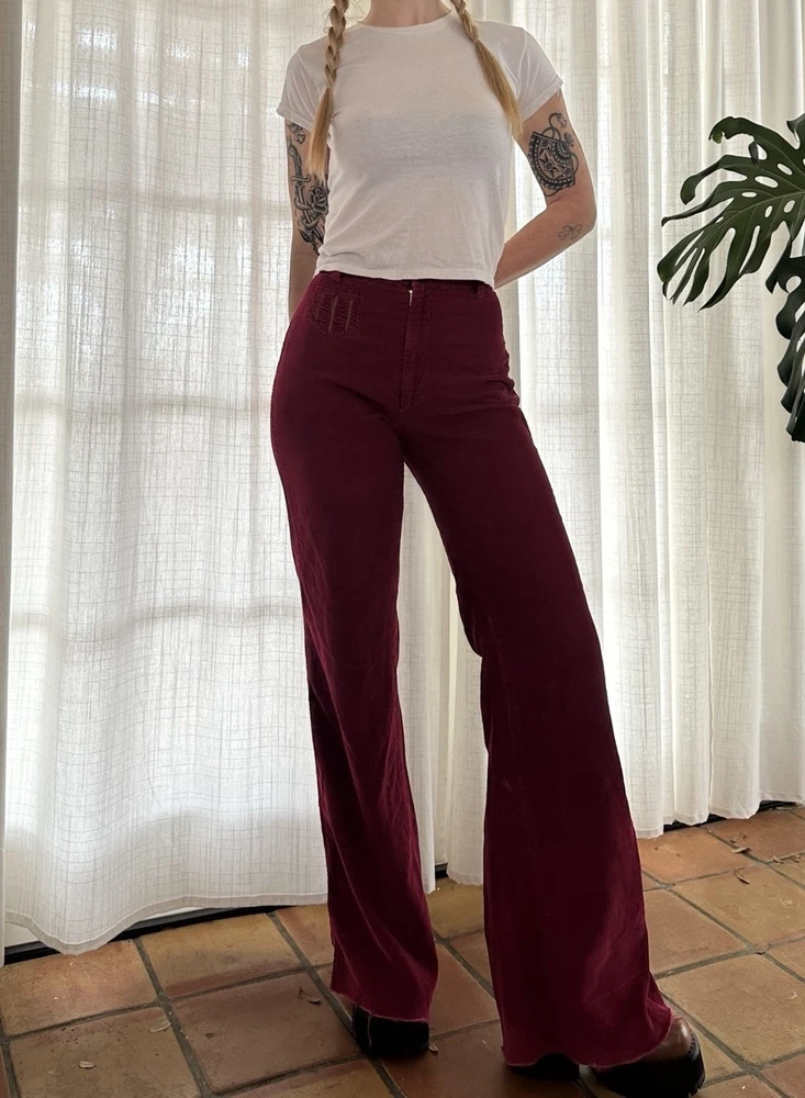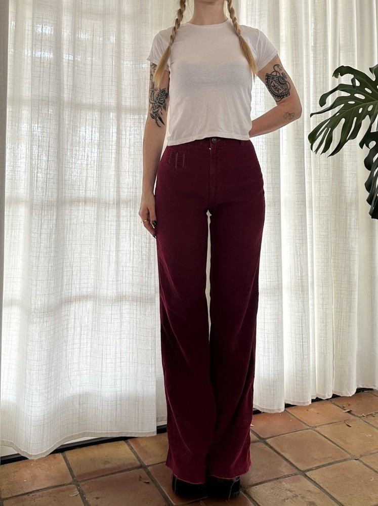 Perfect 70s corduroy flares in burgundy corduroy fabric. Fun little pocket details. No brand tag. Size Waist 28” Rise 11.5” Hip about 40” Inseam about 33” Model is 5’4 25” waist 35” hip These would look even better on proper size!!! In good condition some small flaws here and there from age nothing majow. #70s #bells #bellbottoms #1970s