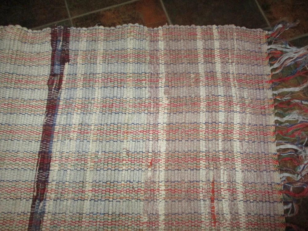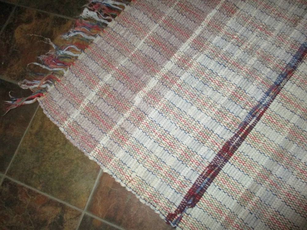 Lovely Vintage 1970s Rag Rug or Runner. Rectangle in colors of mostly Off-white, Tan, some very dark wine-red in the stripes, and other colors mixed in. VERY WORN Fringe . I am not a textile expert, so I think this feels like cotton and cotton/blend. SIZE: 46" long, including WORN fringe. 25" wide. Variations due to hand looming. This will be folded and rolled for shipping. Condition. Used, Vintage. Clean. I see no holes, but there is age-use related wear, including fraying, pulled loops, though none pulled through, and inconsistencies/irregularities due to this being hand made. There is one very small black spot, possibly paint. There is an overall well-used and many times washed look. No odor. Thanks for looking. Please see my other items.