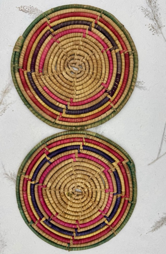 ๐ธ This vintage trivet hot pad set features a unique coiled design made from wicker straw rattan in a retro and lounge style. ๐ธ The abstract pattern and multicolor finish add a pop of vintage charm to your kitchen decor. ๐ธ Made in Mexico, these small round trivets are approximately 7 inches in diameter and perfect for adding a touch of retro flair to your dining experience. ๐ธ Preowned vintage condition with minimal wear. Colors are nice! Smoke free environment. ๐ธ Please view photos for closer inspection and more details. Thanks for shopping ๐ธ Thanks for shopping ๐ธ