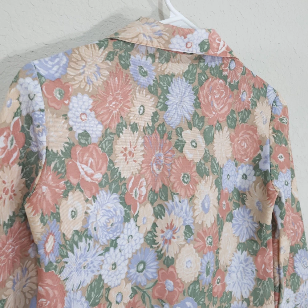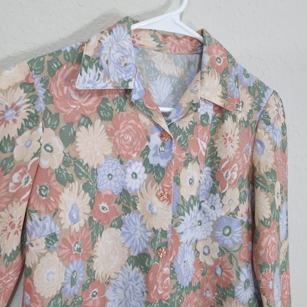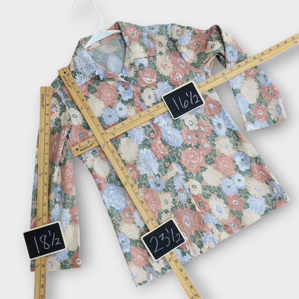 Vintage Floral Blouse SIZE: No size tag. Based on measurements, seems around a size XS / S *** ~ Approx measurements in pics CONDITION: Preloved and in Good Condition. No holes, tears, stains FABRIC: No Fabric Tag - But feels like a vintage polyester DETAILS: ~ Floral Print ~ Seems handmade. No tags ~ Vintage Late 60s or 70s ~ Collared V Neckline ~ ¾ Sleeves ~ Sparkly peach colored buttons ~ Button Closure, Button up, button down ~ Casual, Retro, True Vintage *** Make sure it fits - Sizing varies between brands and decades. It's best to know your body measurements and compare them to clothing measurements and your preferred fit. If you need help on how to do this, or additional measurements, let me know. I will be happy to help.