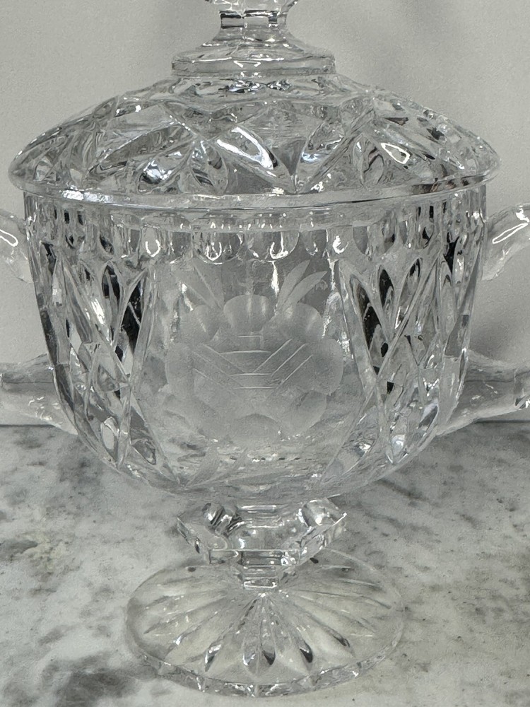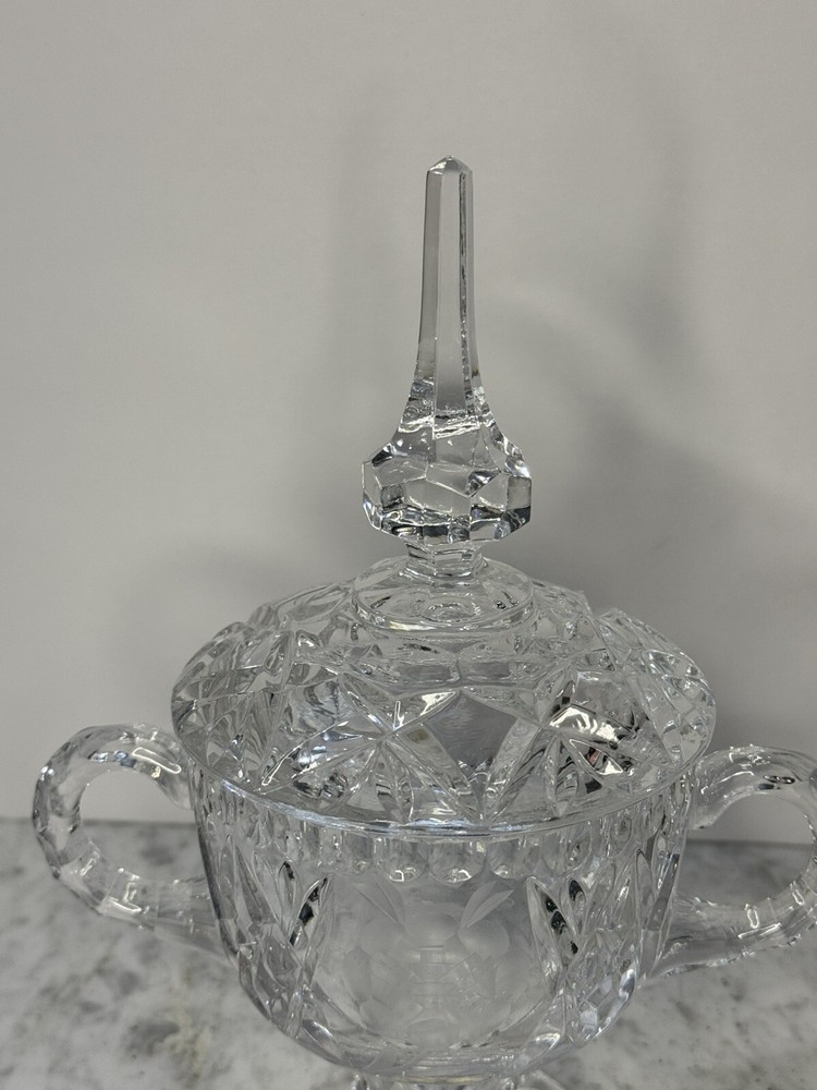 Elevate your table setting with this Vintage Cut Glass Crystal Sugar Bowl, complete with a matching lid. The bowl stands at 8 inches tall and showcases a classic round shape that is both elegant and practical. Its clear crystal construction allows for a seamless display of your sugar or preserves, making it a functional yet decorative piece for any occasion. The sugar bowl's etched detailing reflects a production style synonymous with cut glass craftsmanship. Although the brand remains unknown, the quality and charm of this two-piece set are undeniable, perfect for those who appreciate the beauty of vintage glassware. Whether used for special gatherings or as a display item, this unbranded bowl is a timeless addition to your collection.