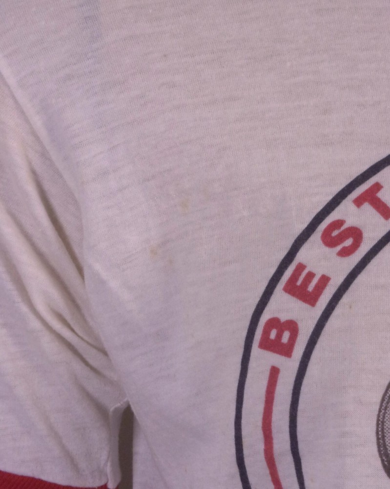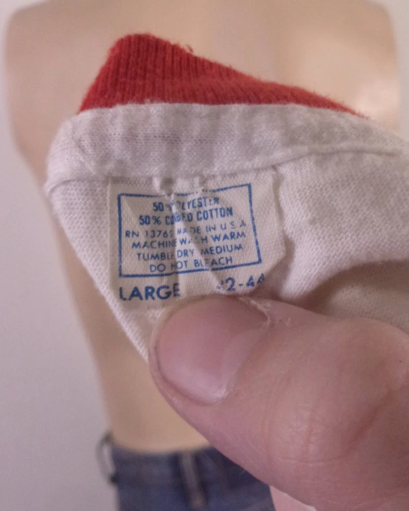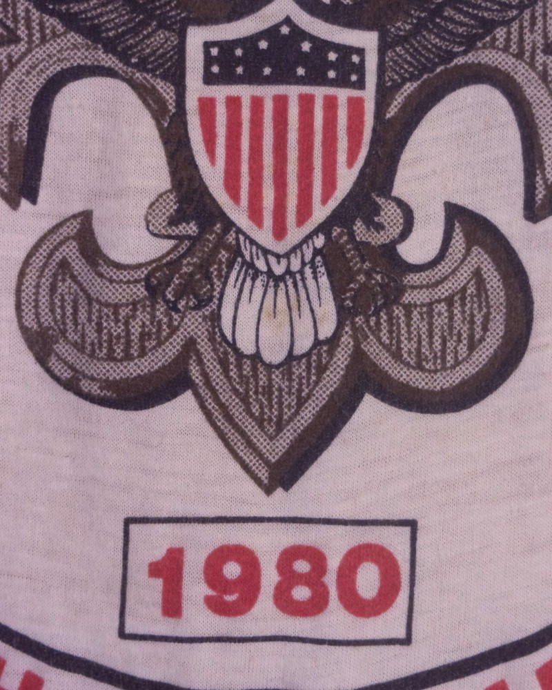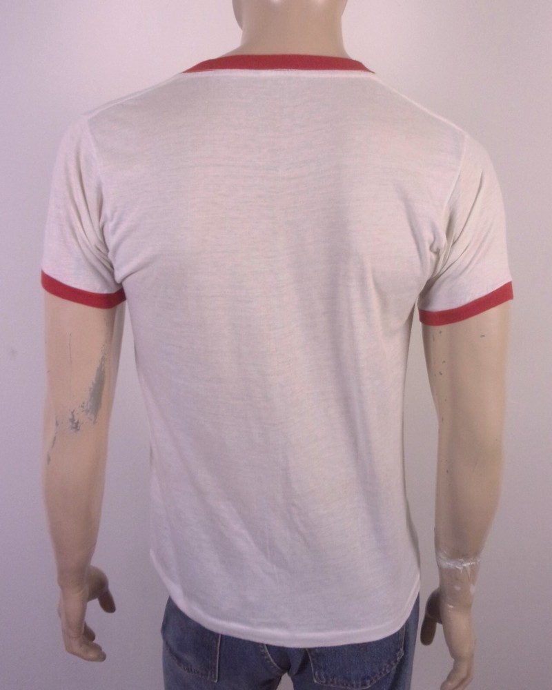 This vintage 80s T-shirt is a rare find featuring a graphic print of the Boy Scouts of America (BSA) logo. Made of a thin cotton blend fabric in white with a red ringer design. The T-shirt has short sleeves, a crew neck, and a regular fit in size L. It is machine washable and showcases single stitch detailing, embodying a 70s and 80s retro aesthetic. Looks awesome! True vintage single stitch, it has a few very, very tiny surface marks/flaws, but nothing individually really major, still really nice shape for being from 1980! Buttery soft and thin.