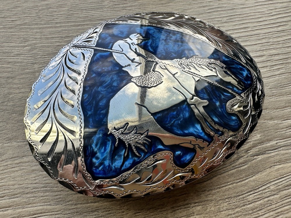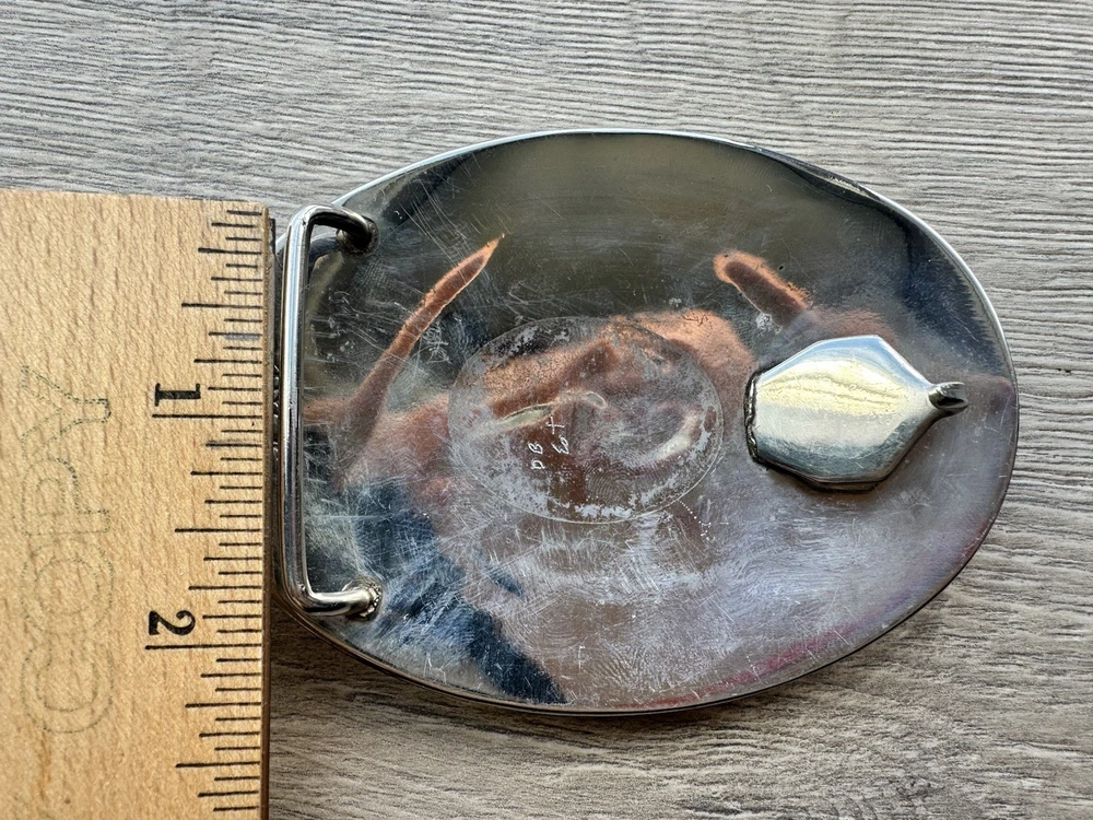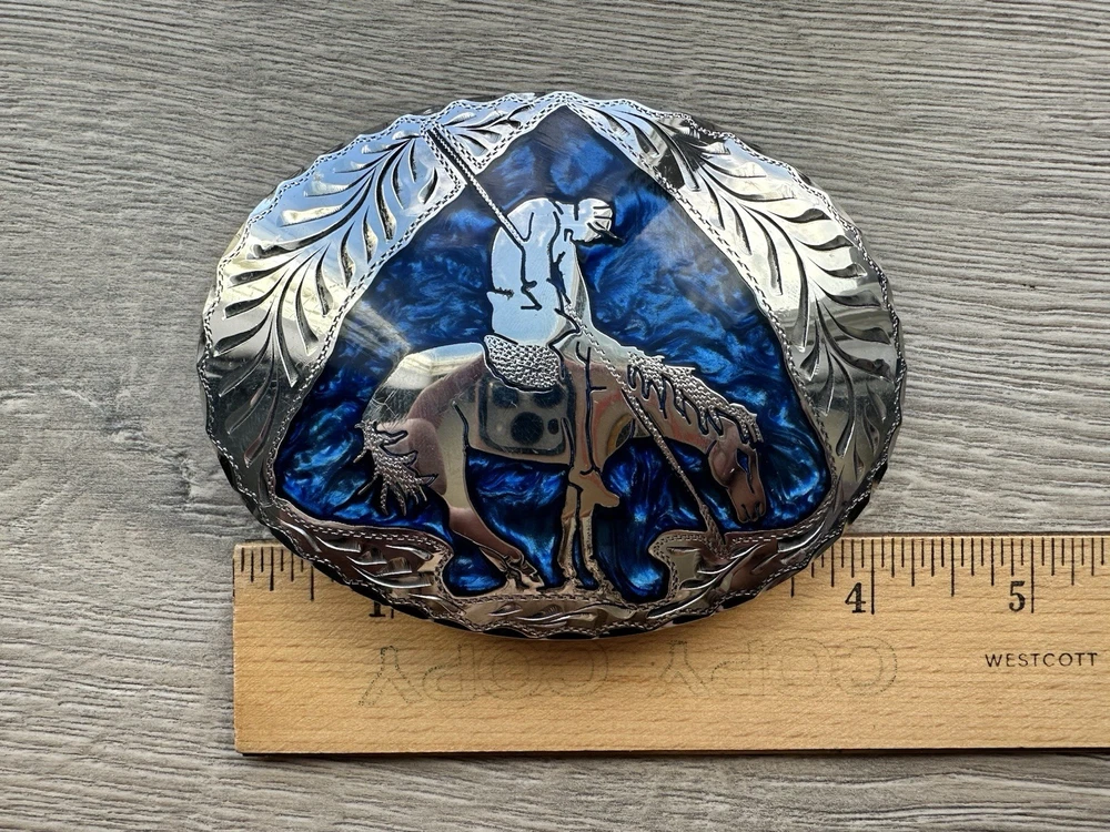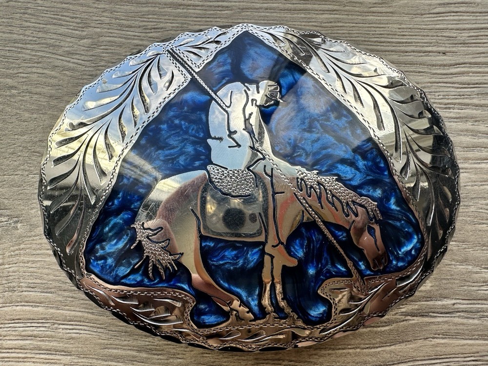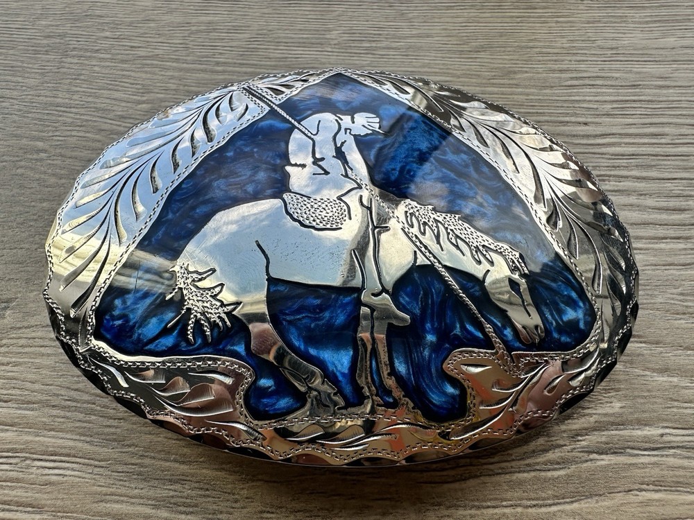 Beautiful used condition. Signed D B/ET (?), see picture All reasonable offers considered. Thank you for looking. This Vintage 80's End of the Trail Southwestern Design Belt Buckle by Award Design Medals is a classic piece with a western look. Made of silvertone metal with blue lacquer inlays, this belt buckle features a solid pattern and Southwest style theme. The design is true vintage from the 1980s, fitting belts up to 1.85" wide, and is an original piece made in the United States. Perfect for unisex adults looking to add a unique and stylish accessory to their wardrobe.