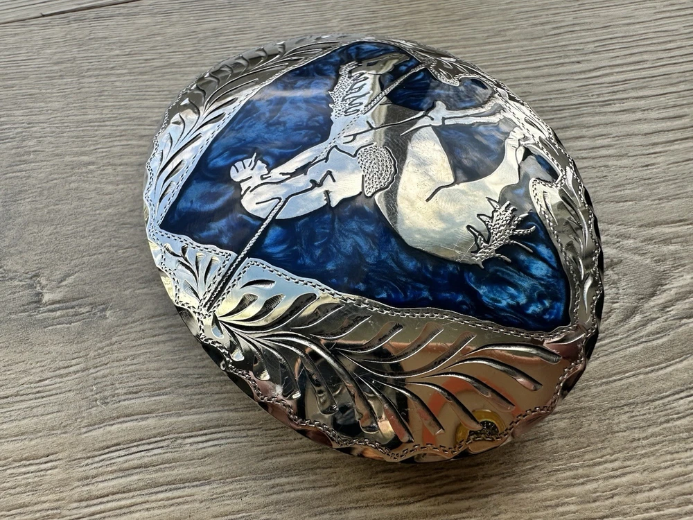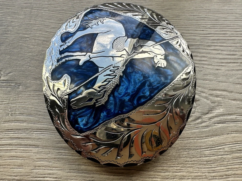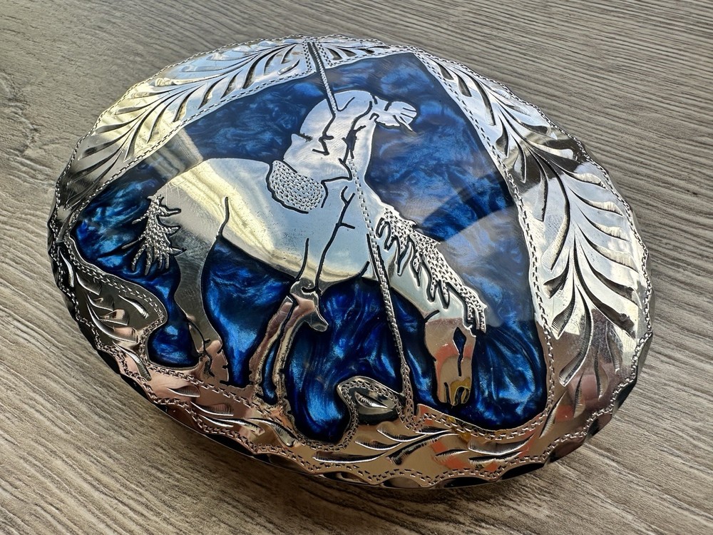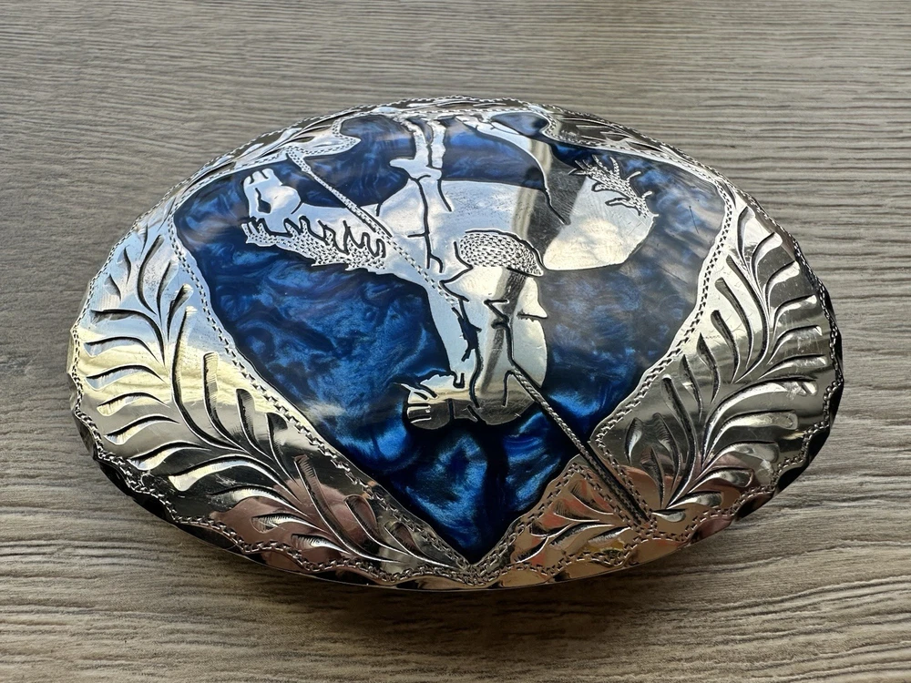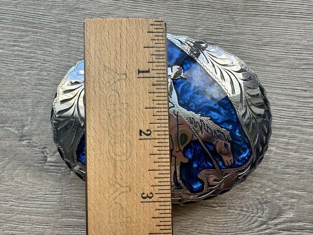 Beautiful used condition. Signed D B/ET (?), see picture All reasonable offers considered. Thank you for looking. This Vintage 80's End of the Trail Southwestern Design Belt Buckle by Award Design Medals is a classic piece with a western look. Made of silvertone metal with blue lacquer inlays, this belt buckle features a solid pattern and Southwest style theme. The design is true vintage from the 1980s, fitting belts up to 1.85" wide, and is an original piece made in the United States. Perfect for unisex adults looking to add a unique and stylish accessory to their wardrobe.