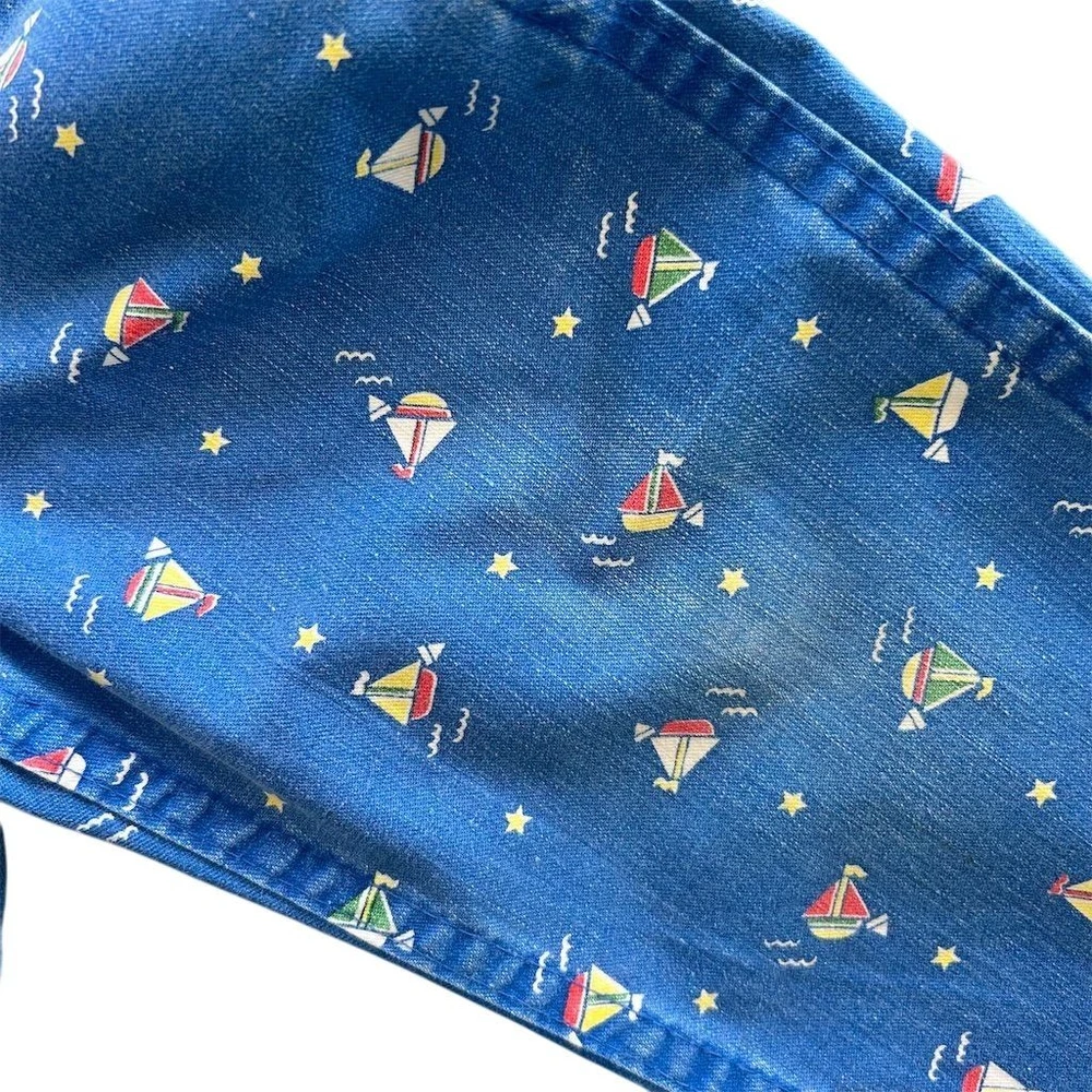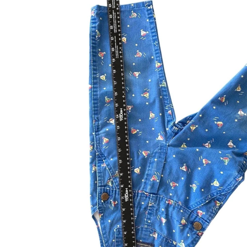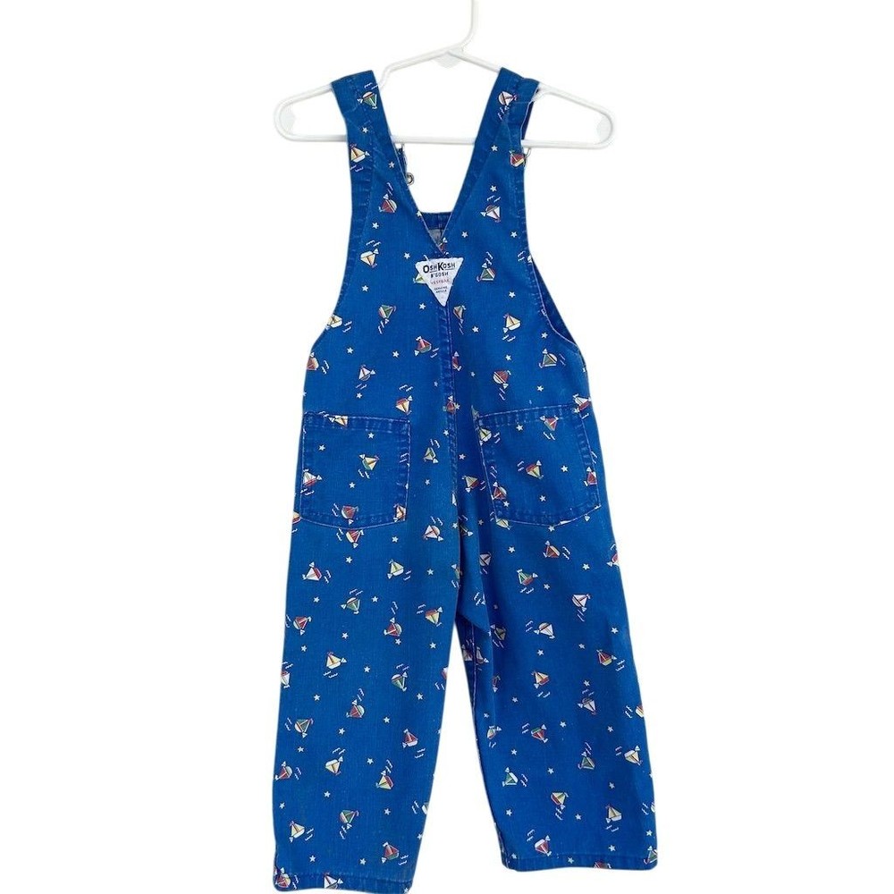 These Vintage 80s OshKosh B'gosh Sailboat Print Overalls in Kids Sz 2T are a classic piece of clothing made in the USA. Crafted from 100% cotton denim, these one-piece overalls feature a cute sailboat print, perfect for a casual occasion in the summer, fall, or spring. The button closure and machine washable design make them easy to wear and care for, while the blue color and vintage style add a nostalgic touch to any little boy's wardrobe. Ideal for a beach day or a day out at the pier, these overalls are a timeless piece that can be worn for years to come. Wear noted on knees fading present.