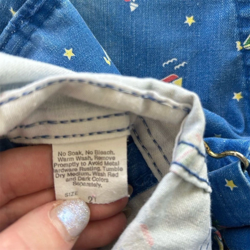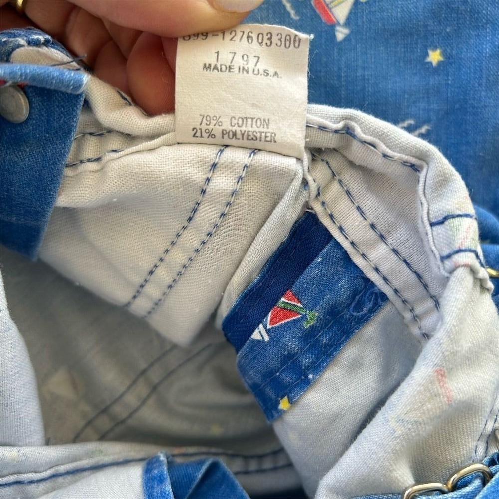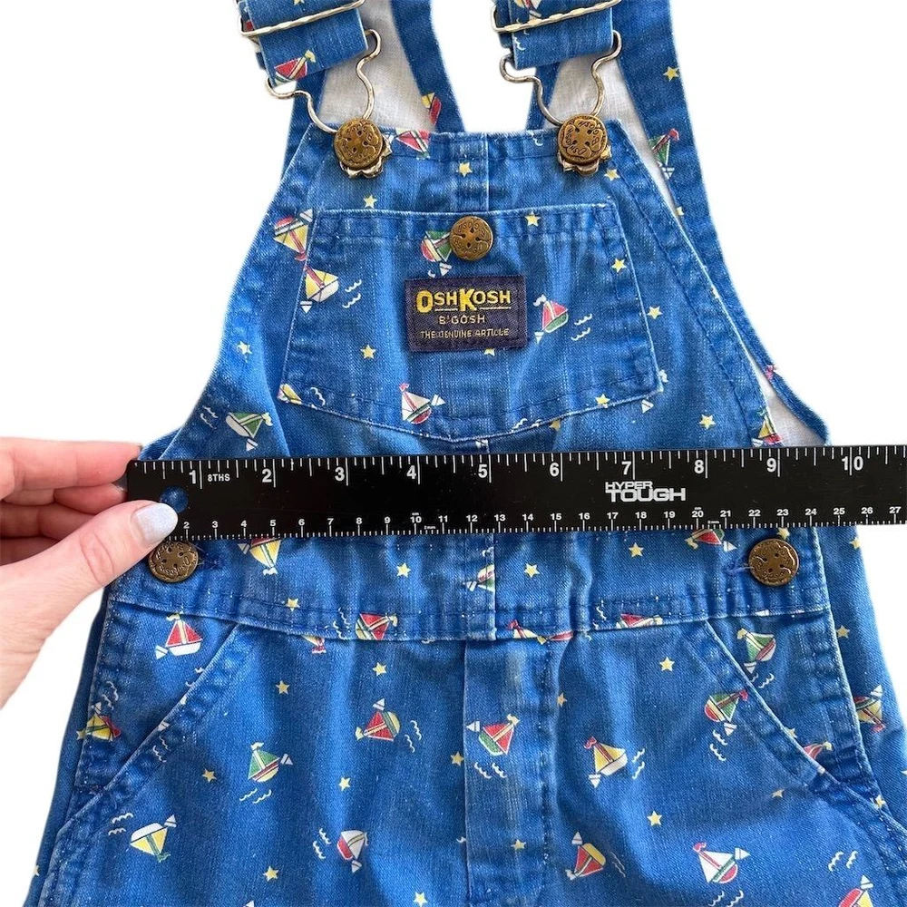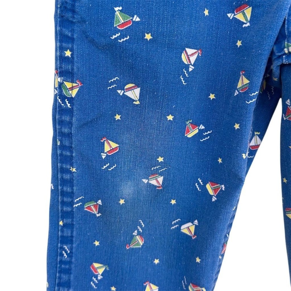 These Vintage 80s OshKosh B'gosh Sailboat Print Overalls in Kids Sz 2T are a classic piece of clothing made in the USA. Crafted from 100% cotton denim, these one-piece overalls feature a cute sailboat print, perfect for a casual occasion in the summer, fall, or spring. The button closure and machine washable design make them easy to wear and care for, while the blue color and vintage style add a nostalgic touch to any little boy's wardrobe. Ideal for a beach day or a day out at the pier, these overalls are a timeless piece that can be worn for years to come. Wear noted on knees fading present.